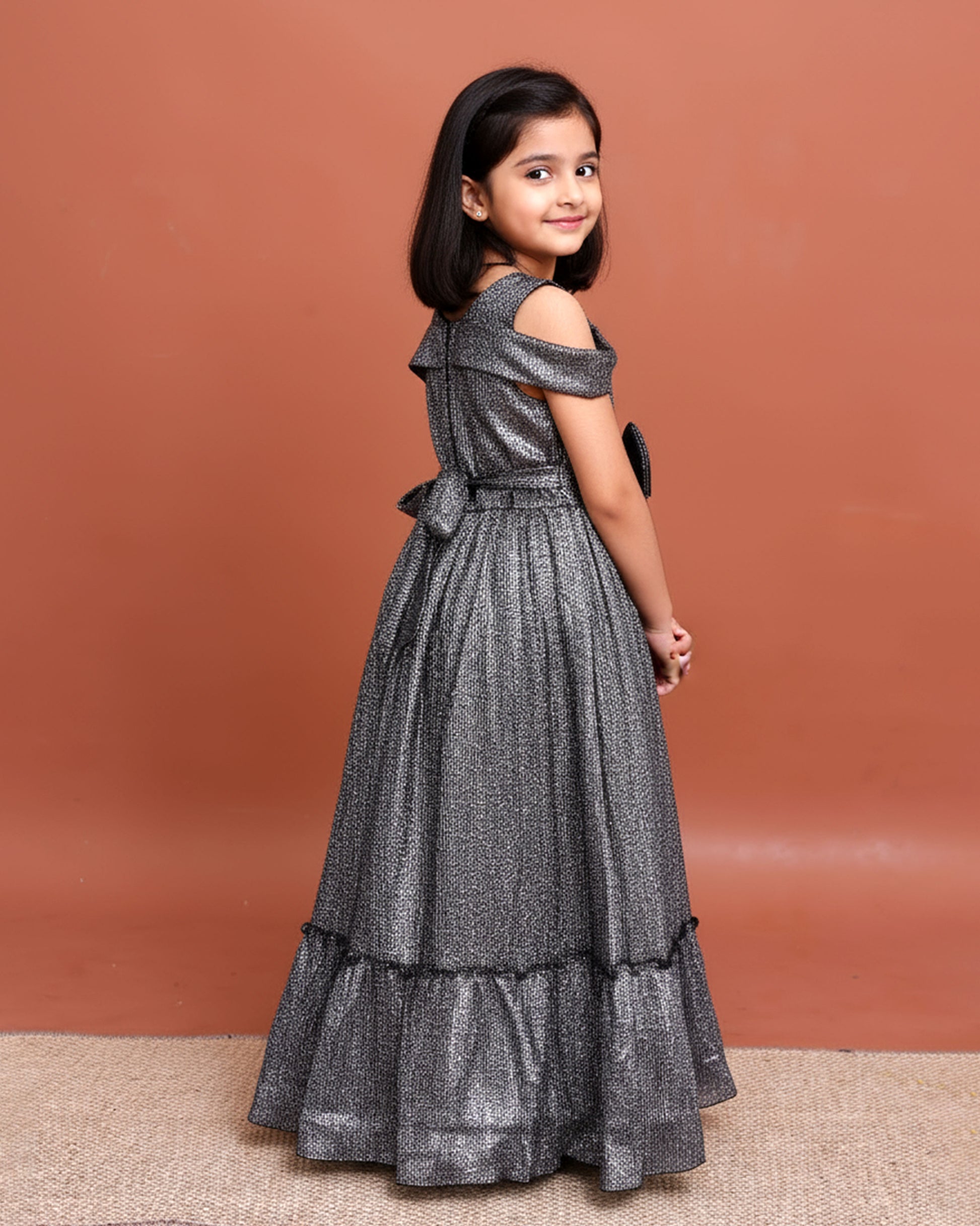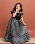 Off-Shoulder Princess Frock with Embellished Bodice & Accents - Grey