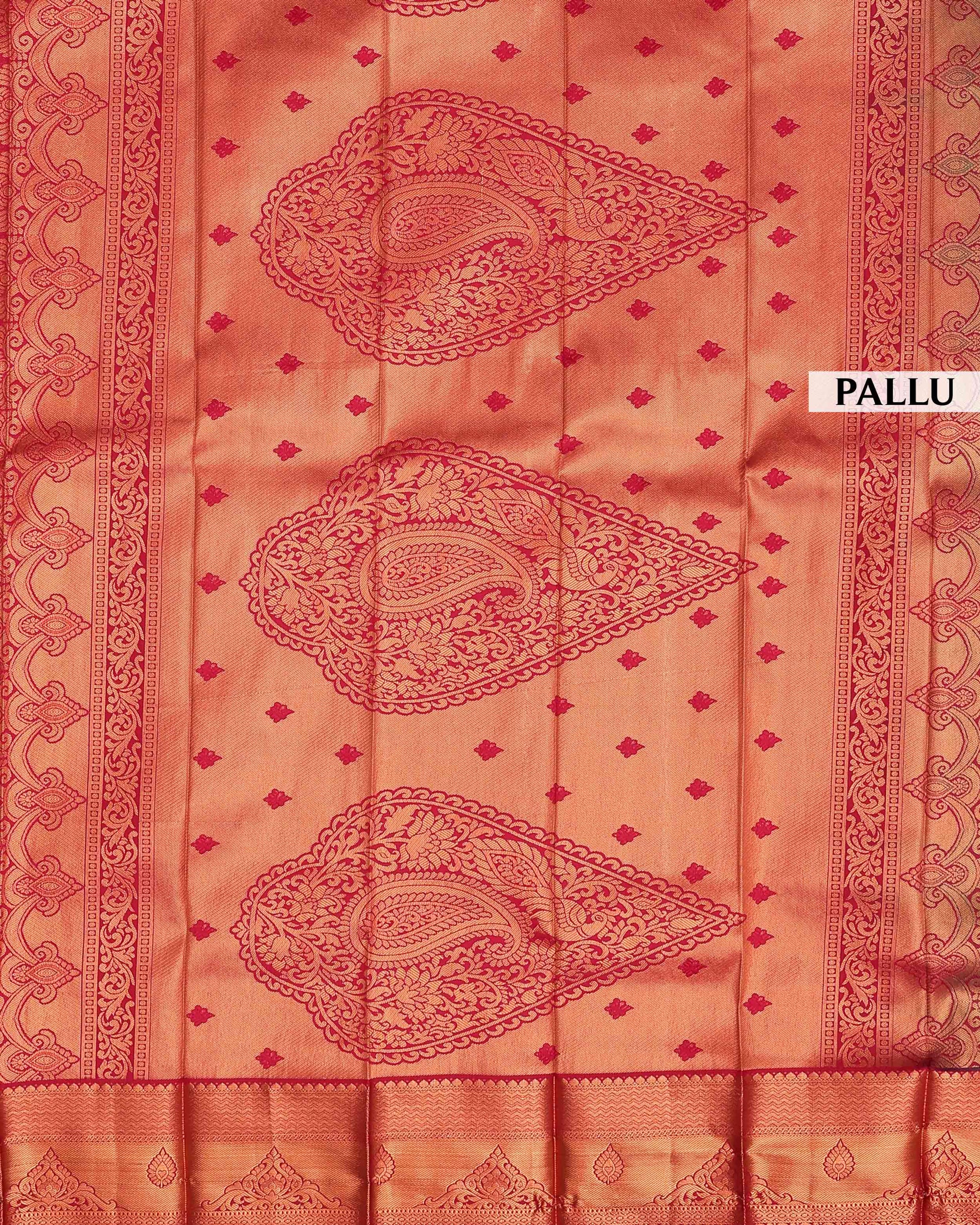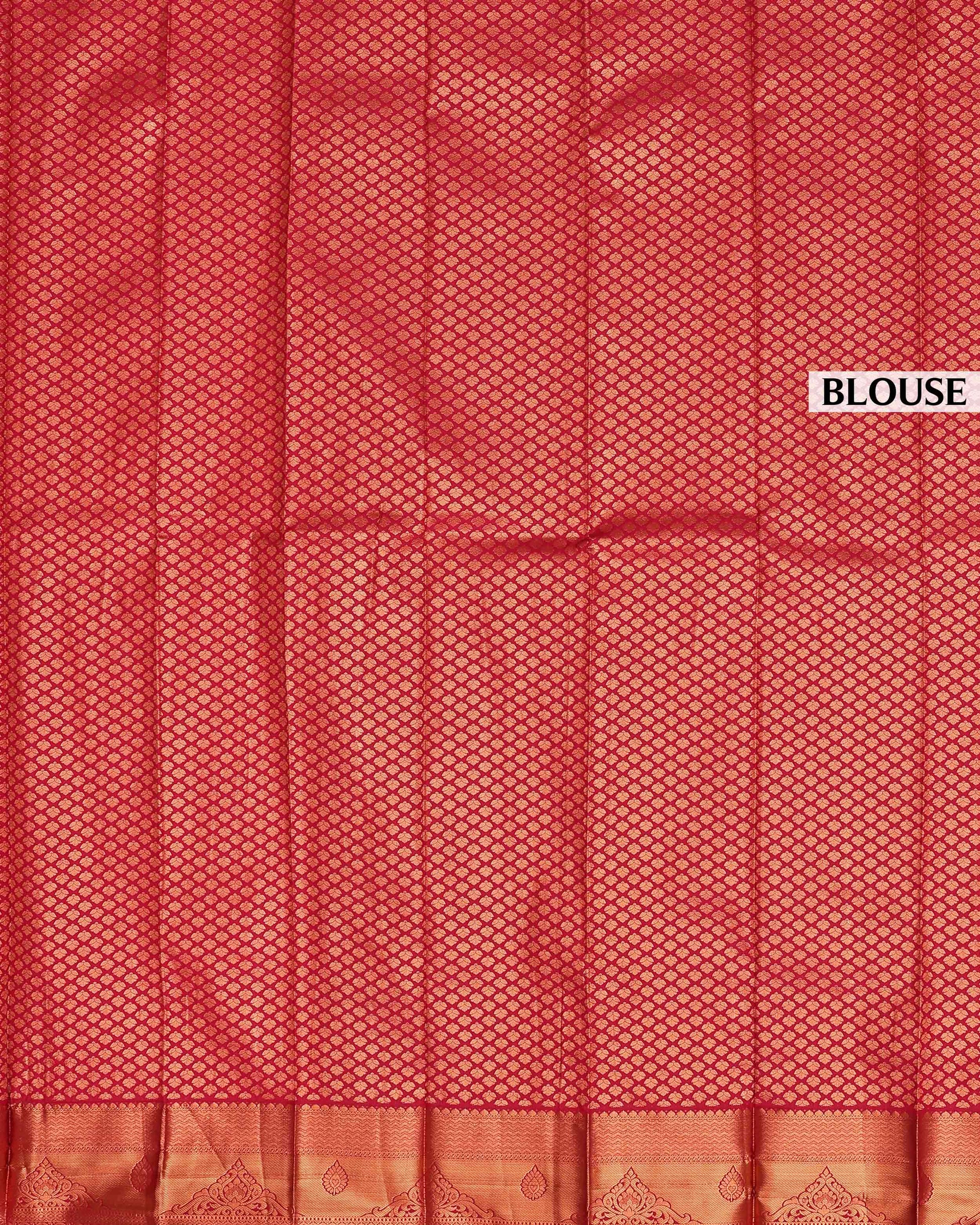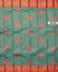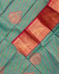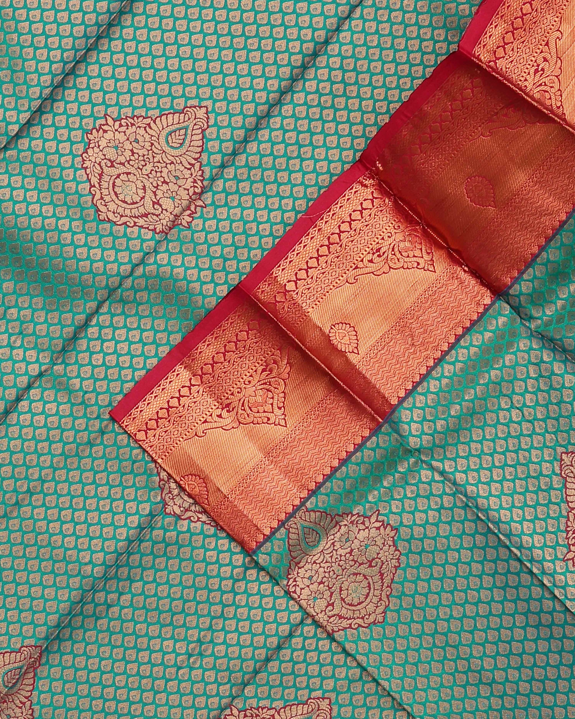 - This exquisite premium silk saree a vibrant teal body with intricate gold zari weaving, complemented by a rich maroon border and pallu
