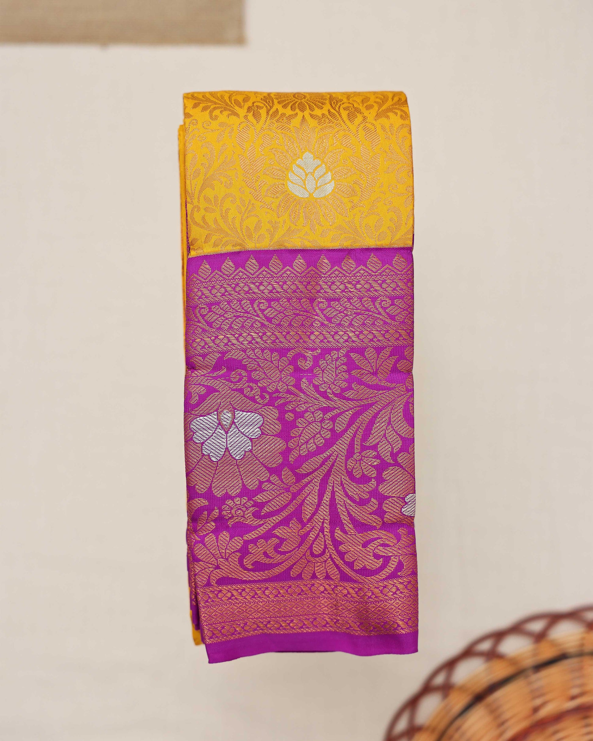 - This exquisite Kanchipuram silk saree a radiant mango yellow body with delicate brocade, complemented by a rich magenta border adorned with intricate floral zari motifs.