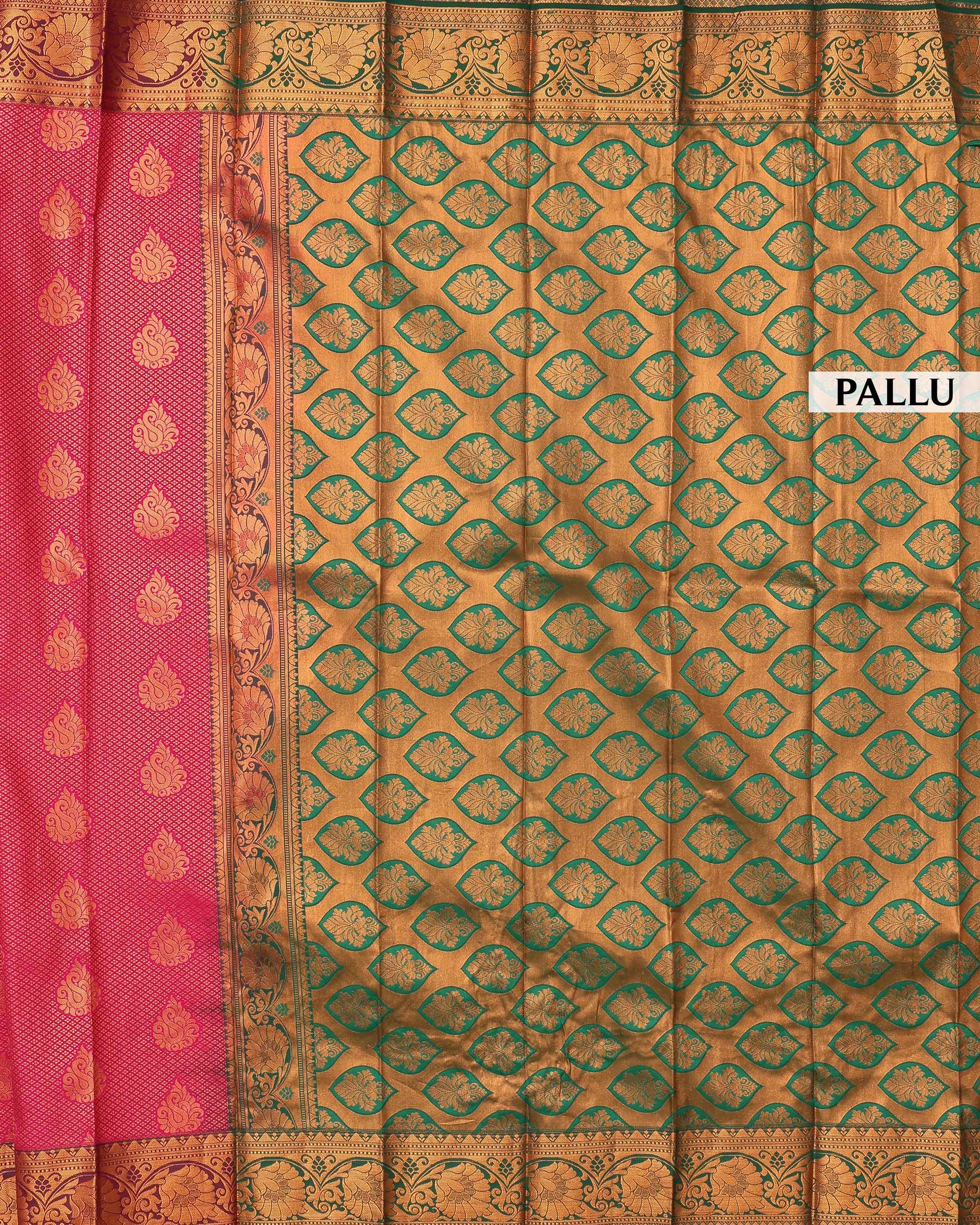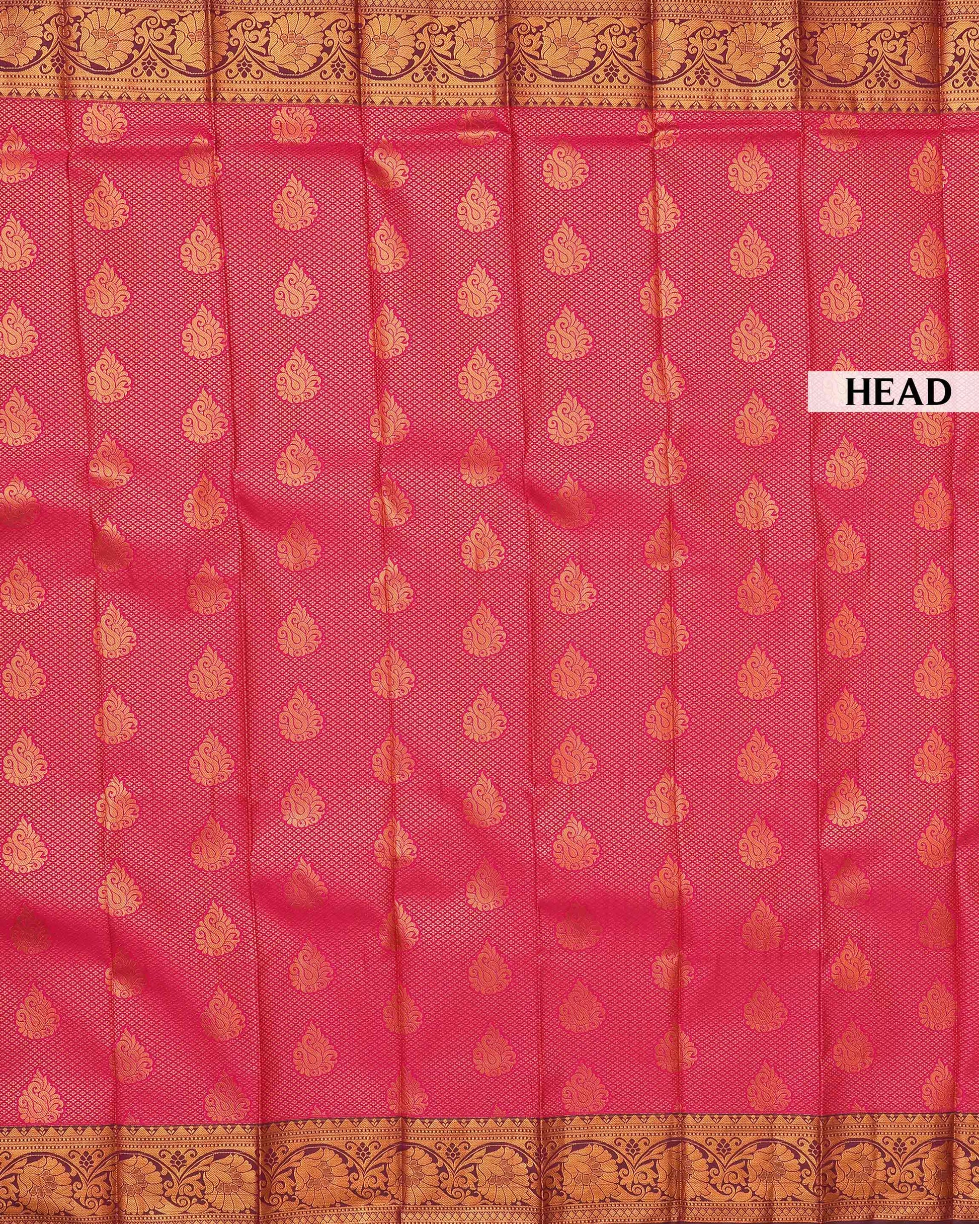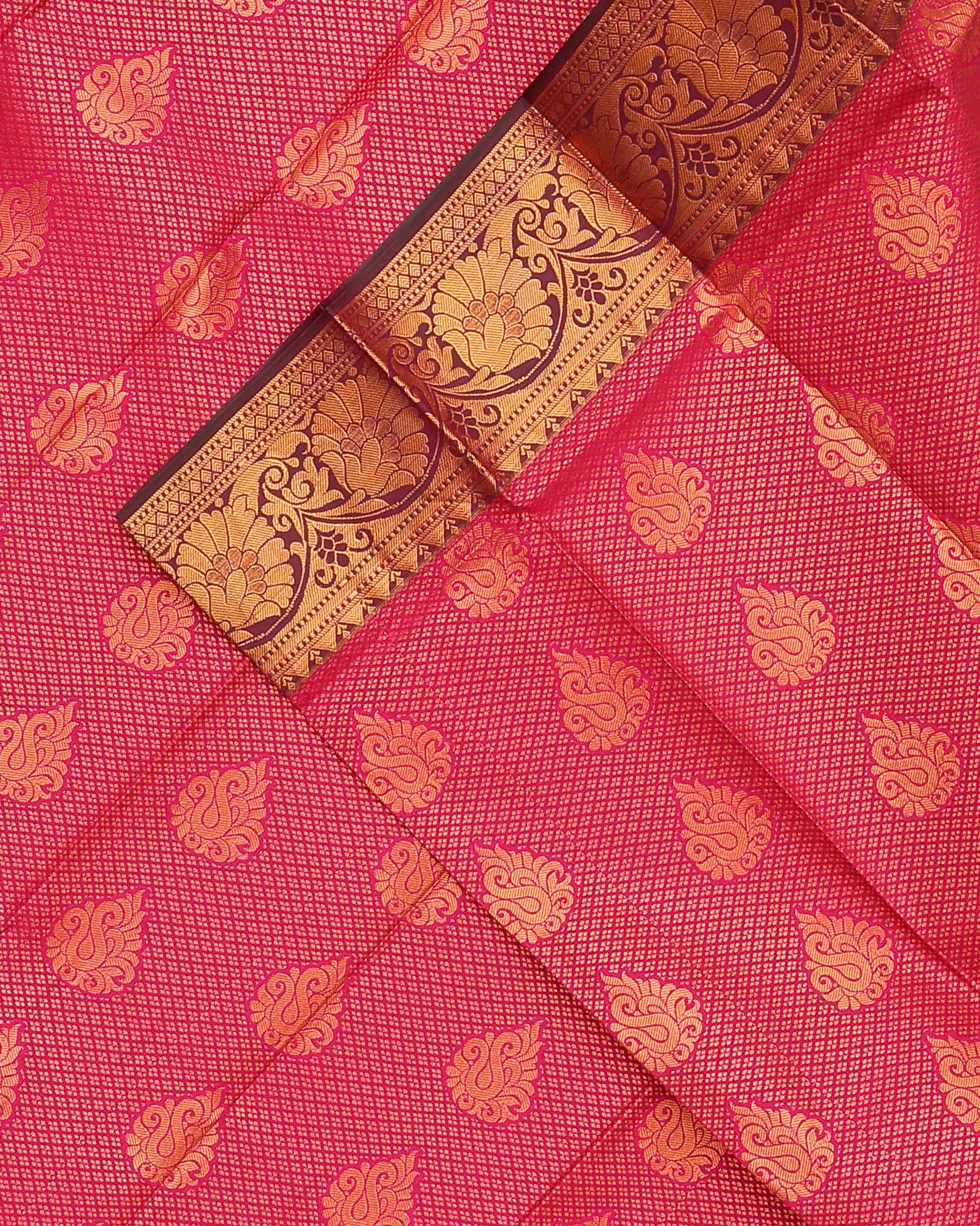 - This exquisite Premium silk saree a vibrant magenta body adorned with delicate gold zari buttas