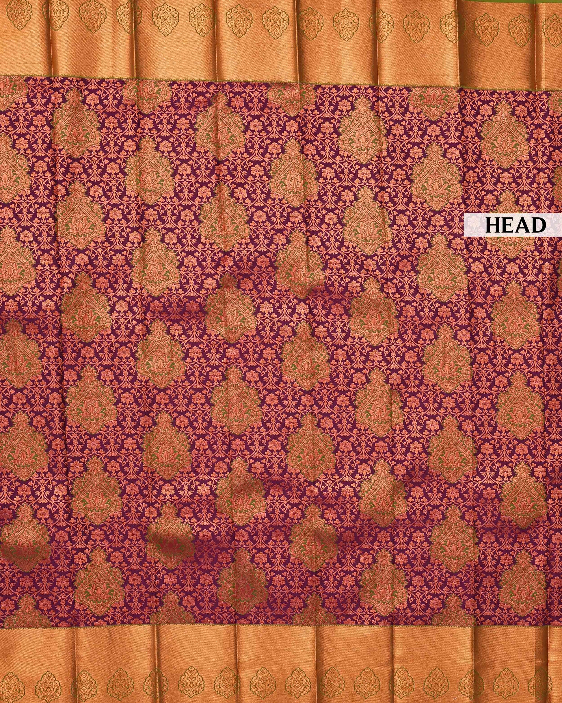 - This exquisite Premium silk saree a rich purple body with intricate zari work, complemented by a lustrous golden border