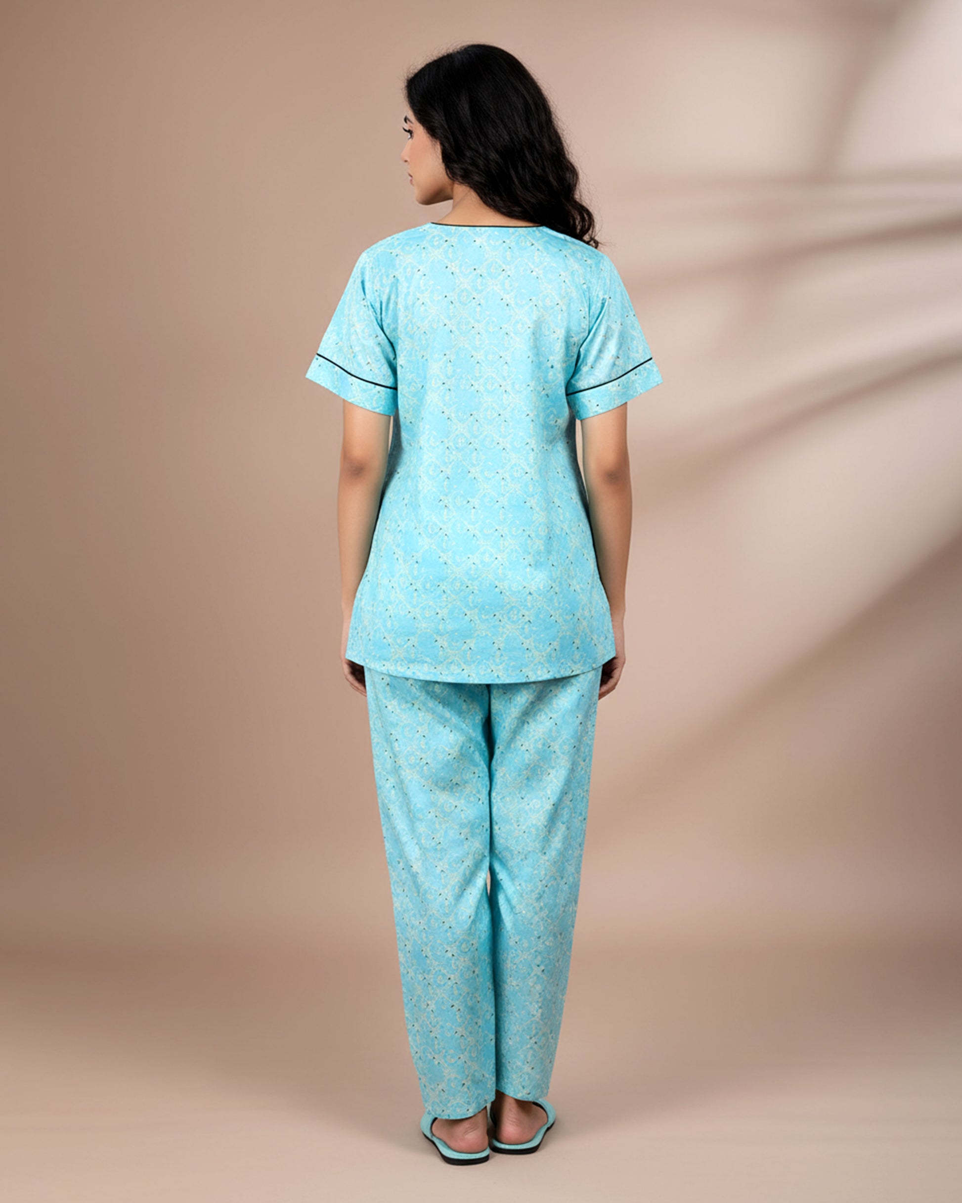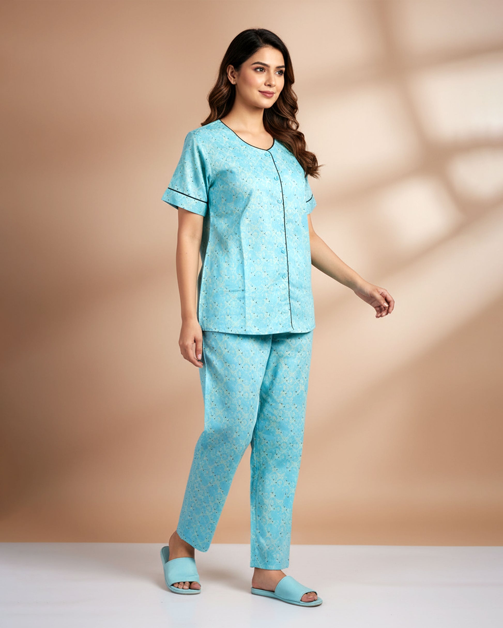 This women's blue floral printed night suit offers ultimate comfort and style for lounging or sleeping