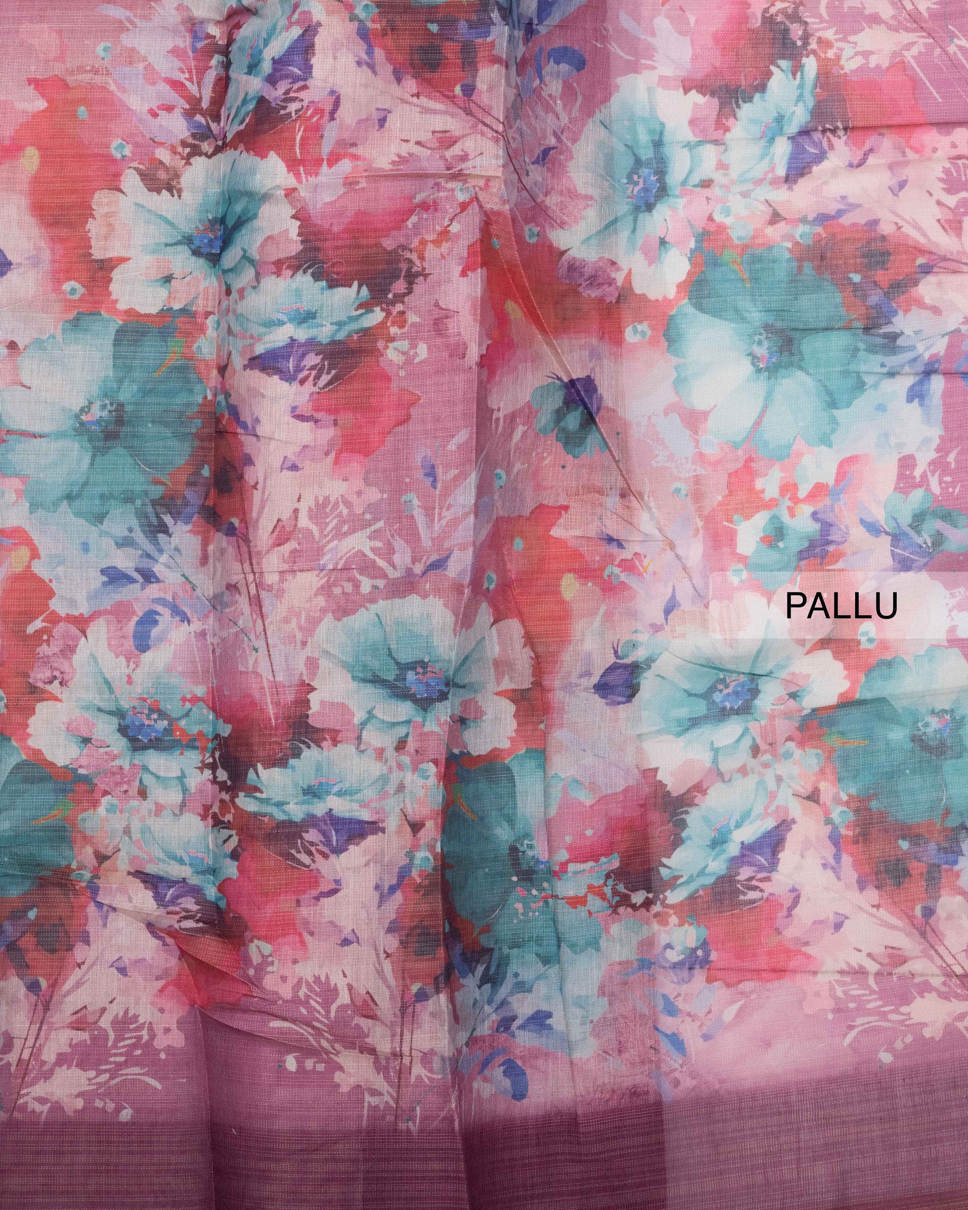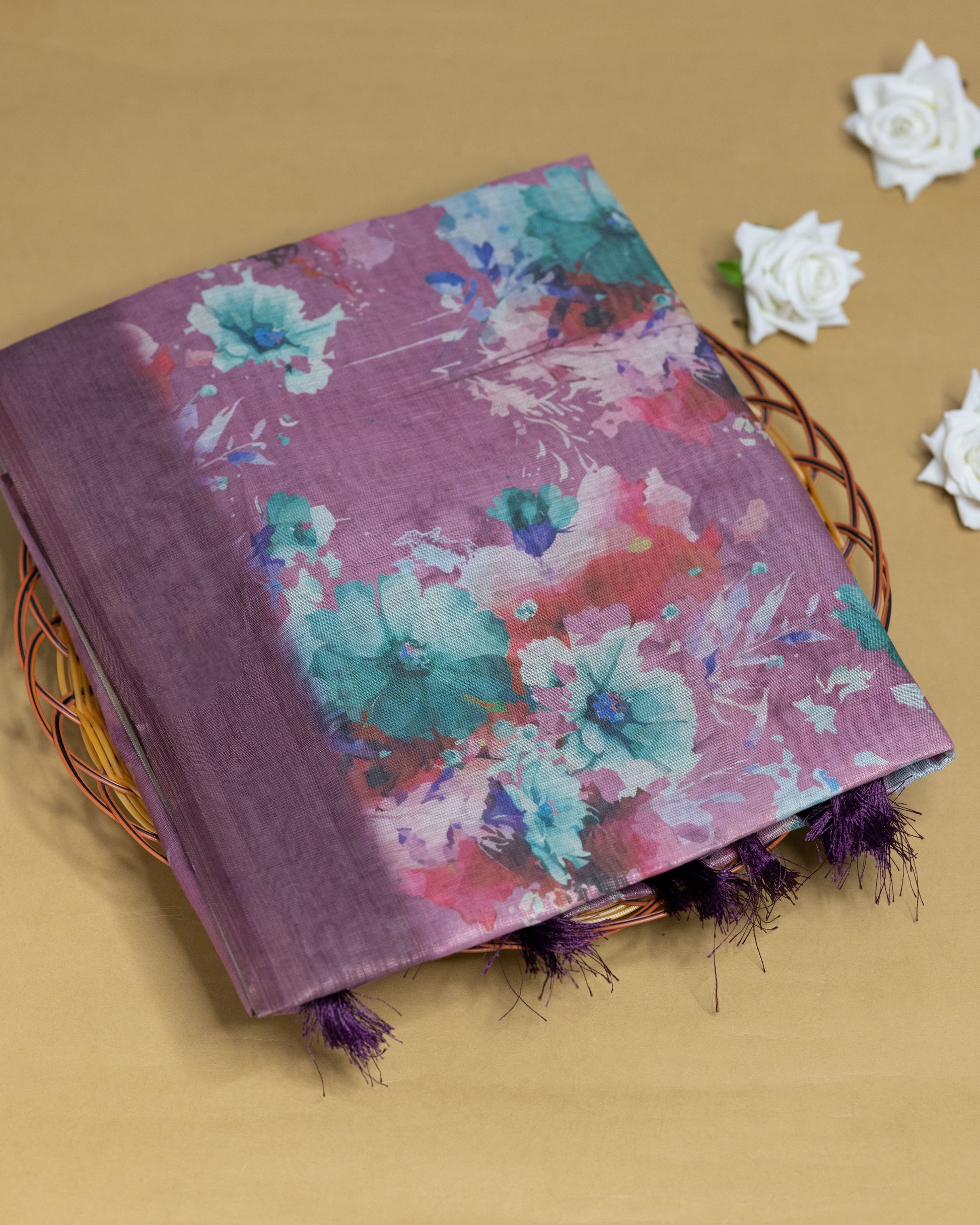 - This elegant lilac purple tissue saree features a delicate floral print in shades of blue, pink, and green, making it a perfect choice for festive occasions and parties