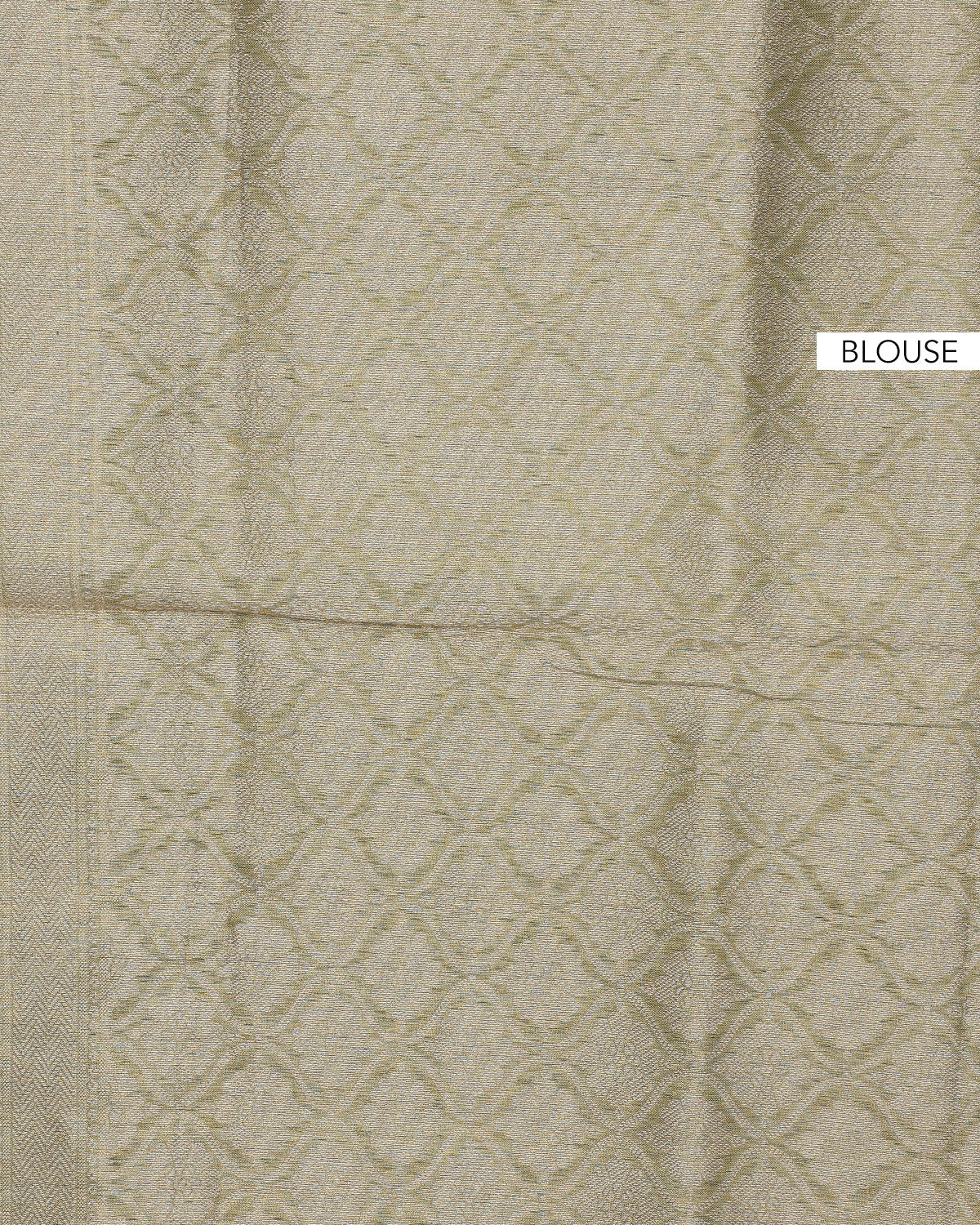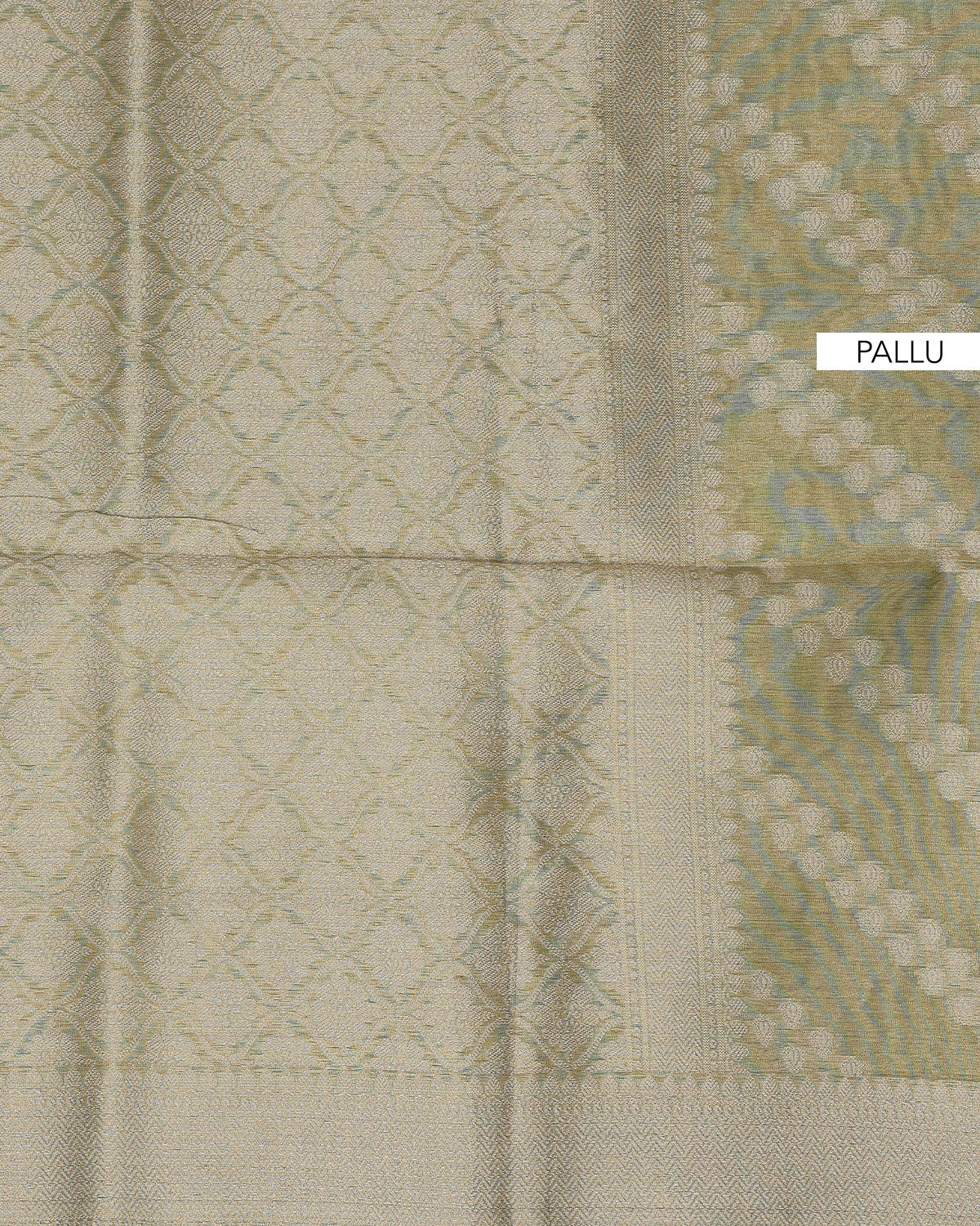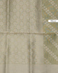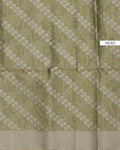 - This elegant tissue saree a subtle light colored body with intricate woven patterns and a contrasting green zari border