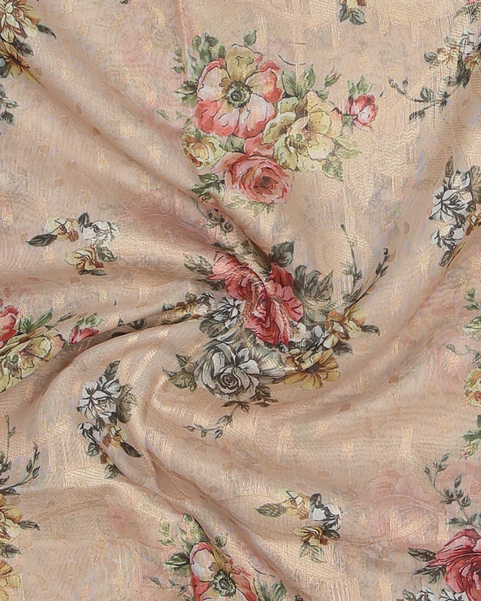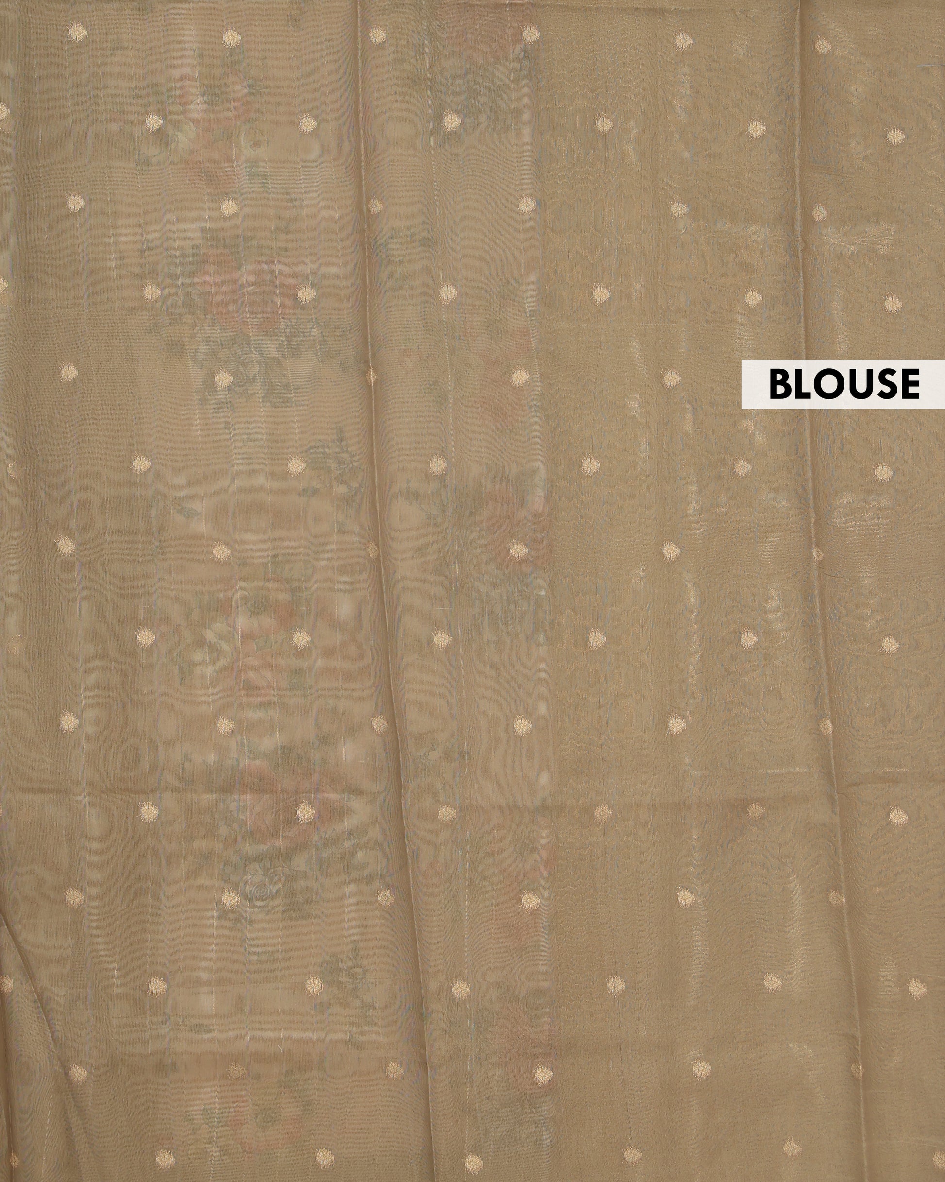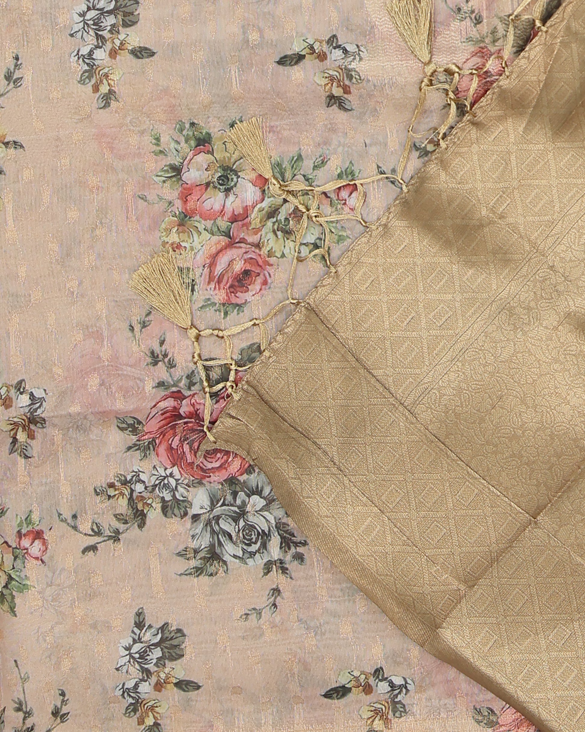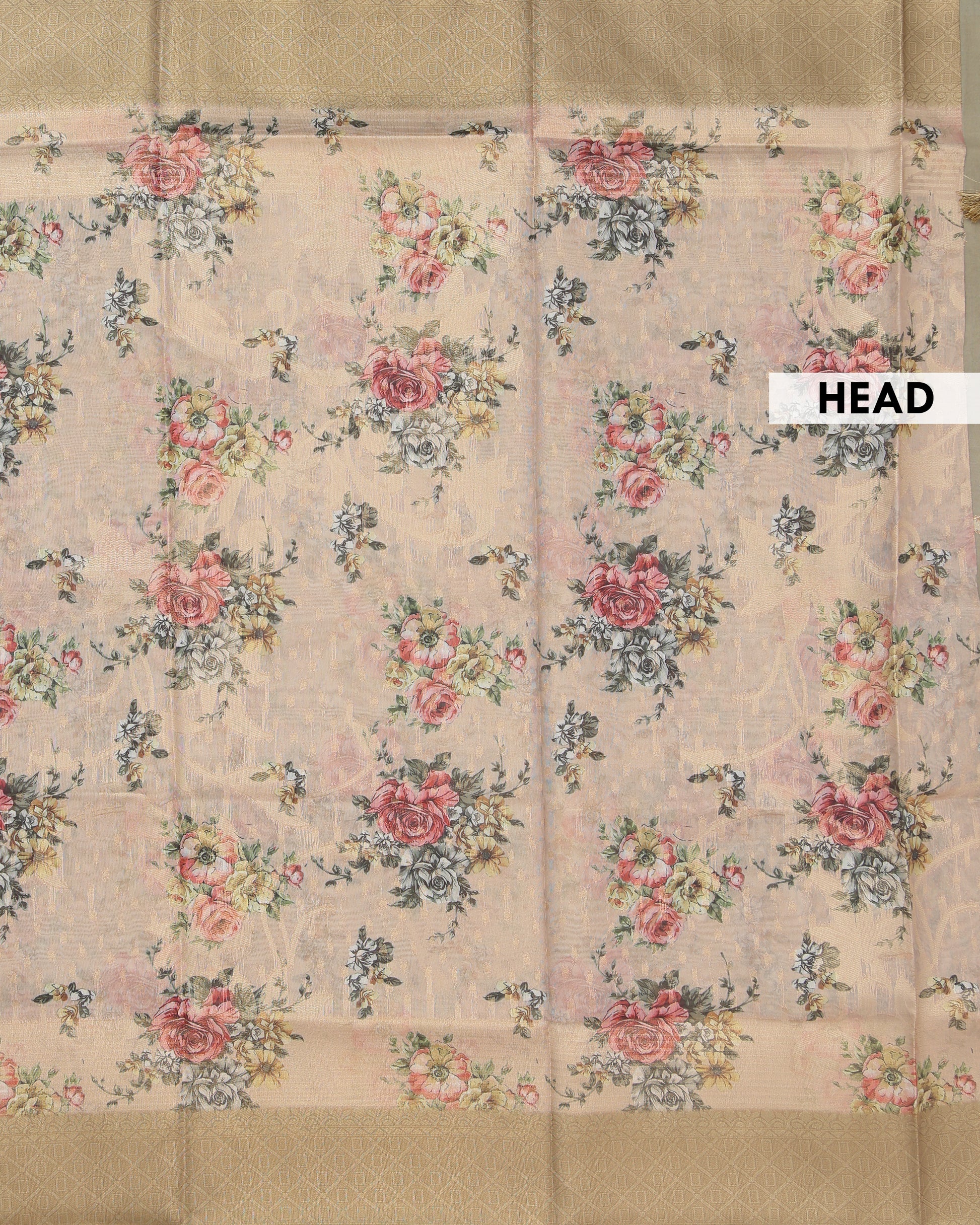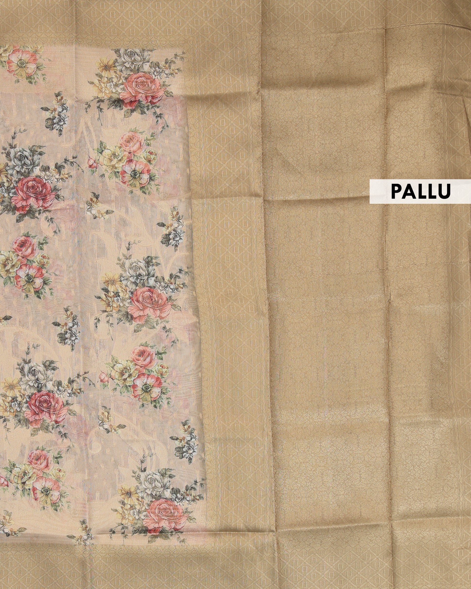 Floral Fancy Silk Saree with Contrast Zari Border - Beige