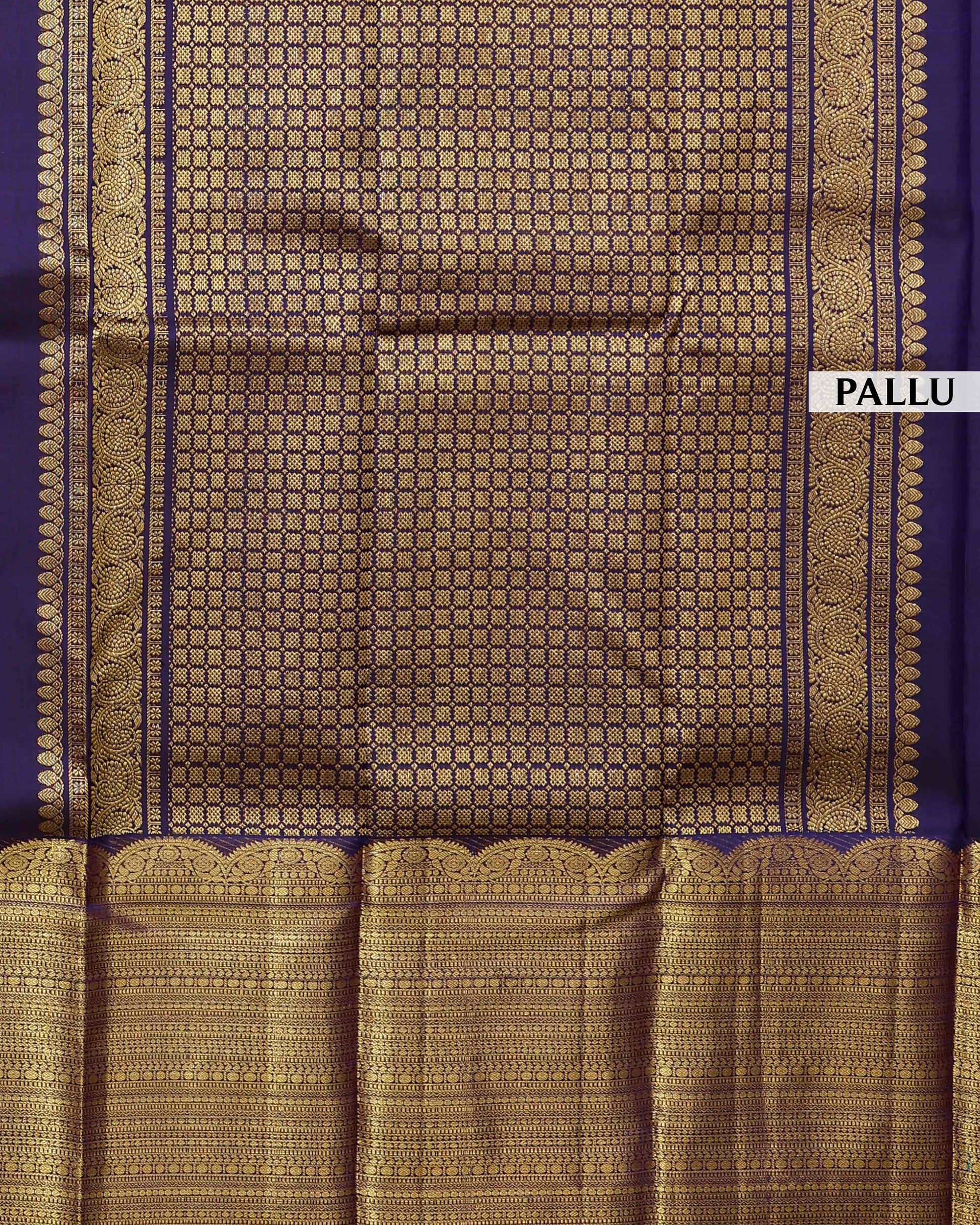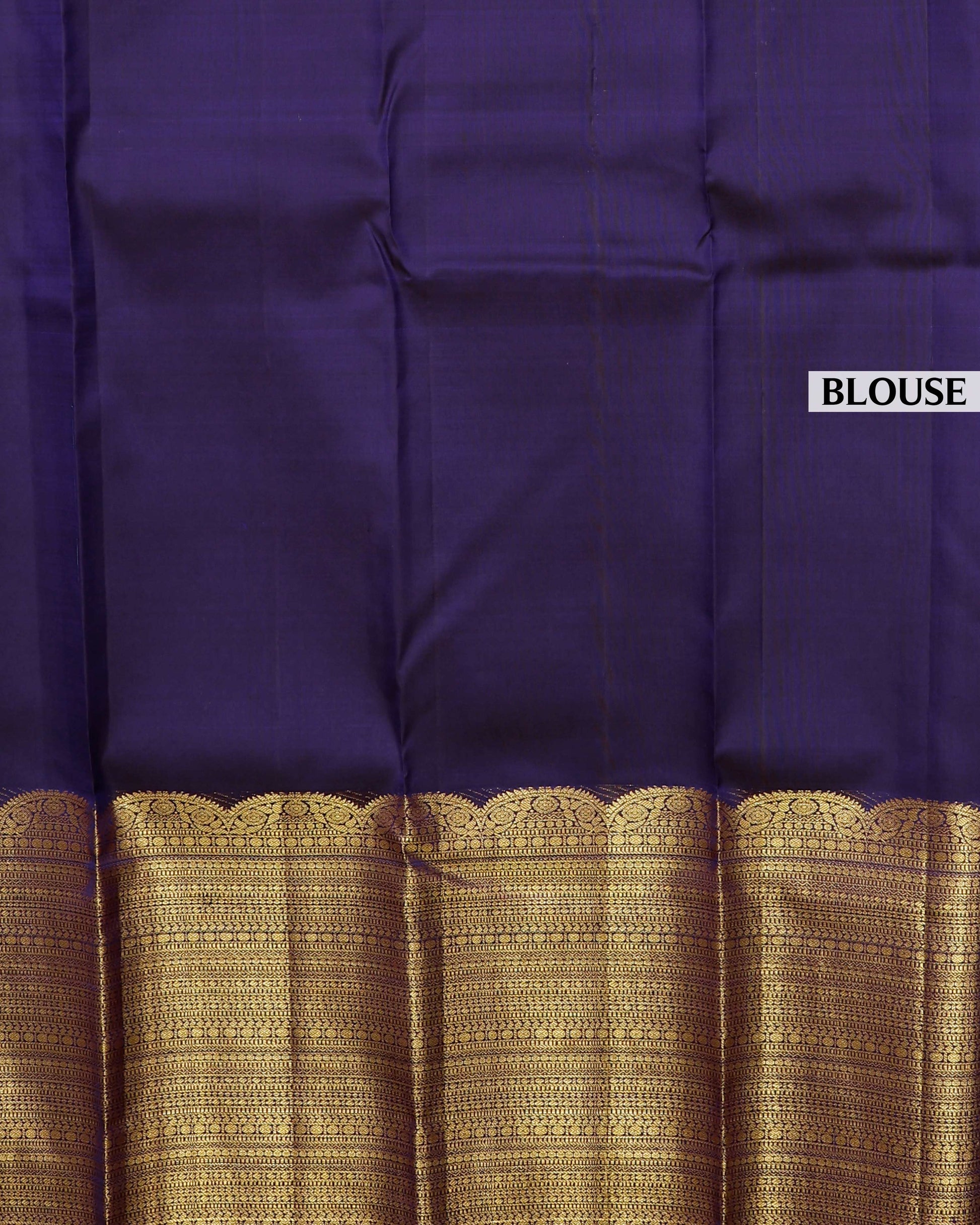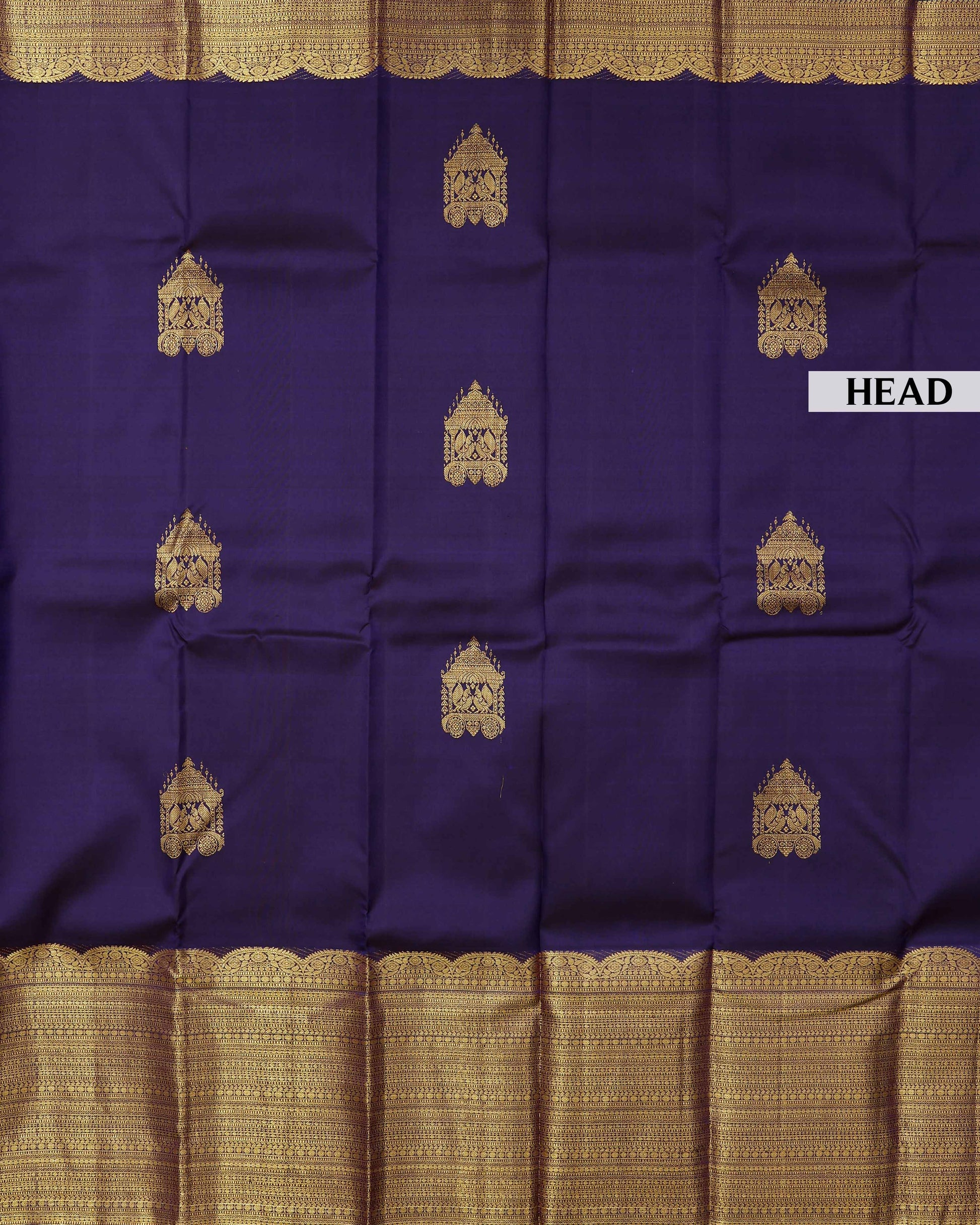 - This exquisite Kanchipuram pure silk saree in a rich purple a luxurious, intricately woven gold zari border and pallu
