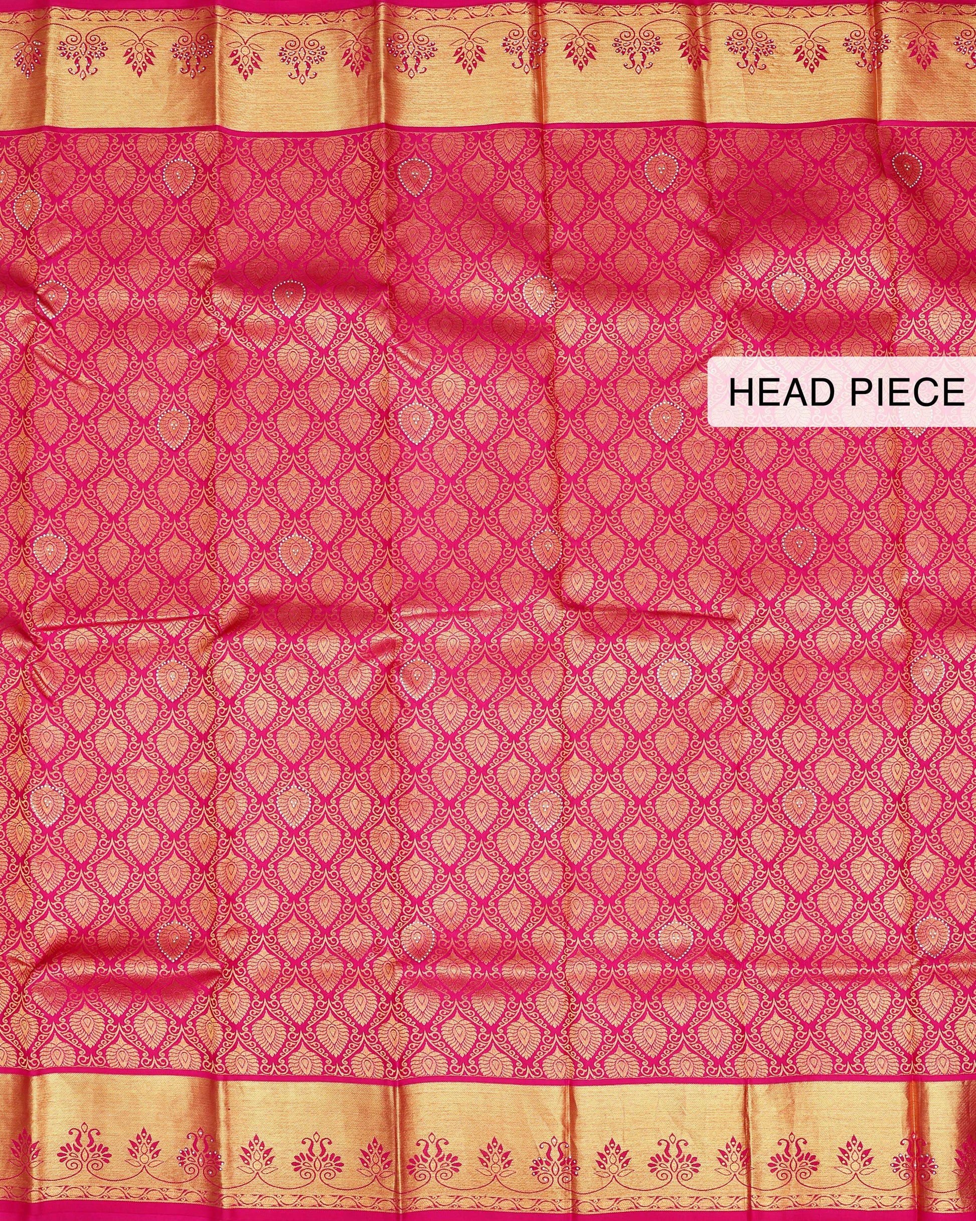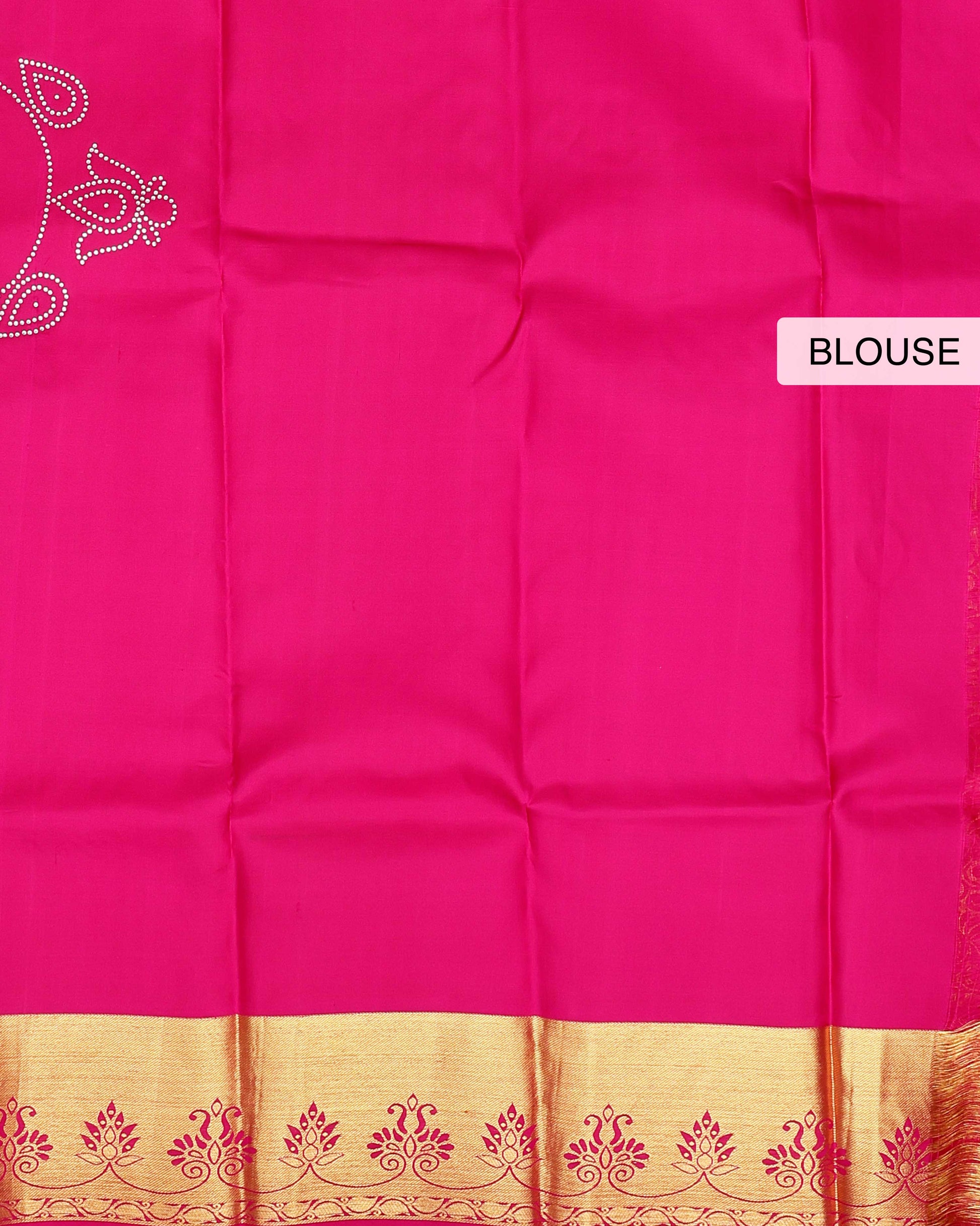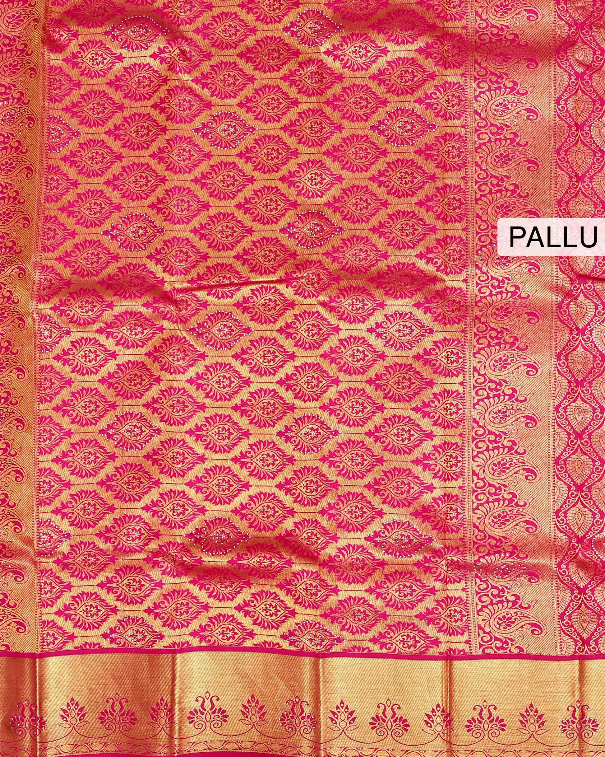 - This exquisite Niranjana silk saree in a vibrant pink intricate gold zari weaving with traditional motifs.