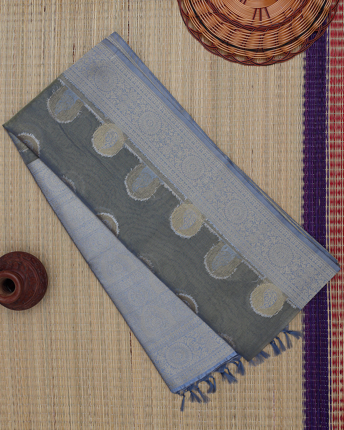 - This elegant steel-grey tissue saree features a soft texture and a delicate blue border with intricate woven patterns.