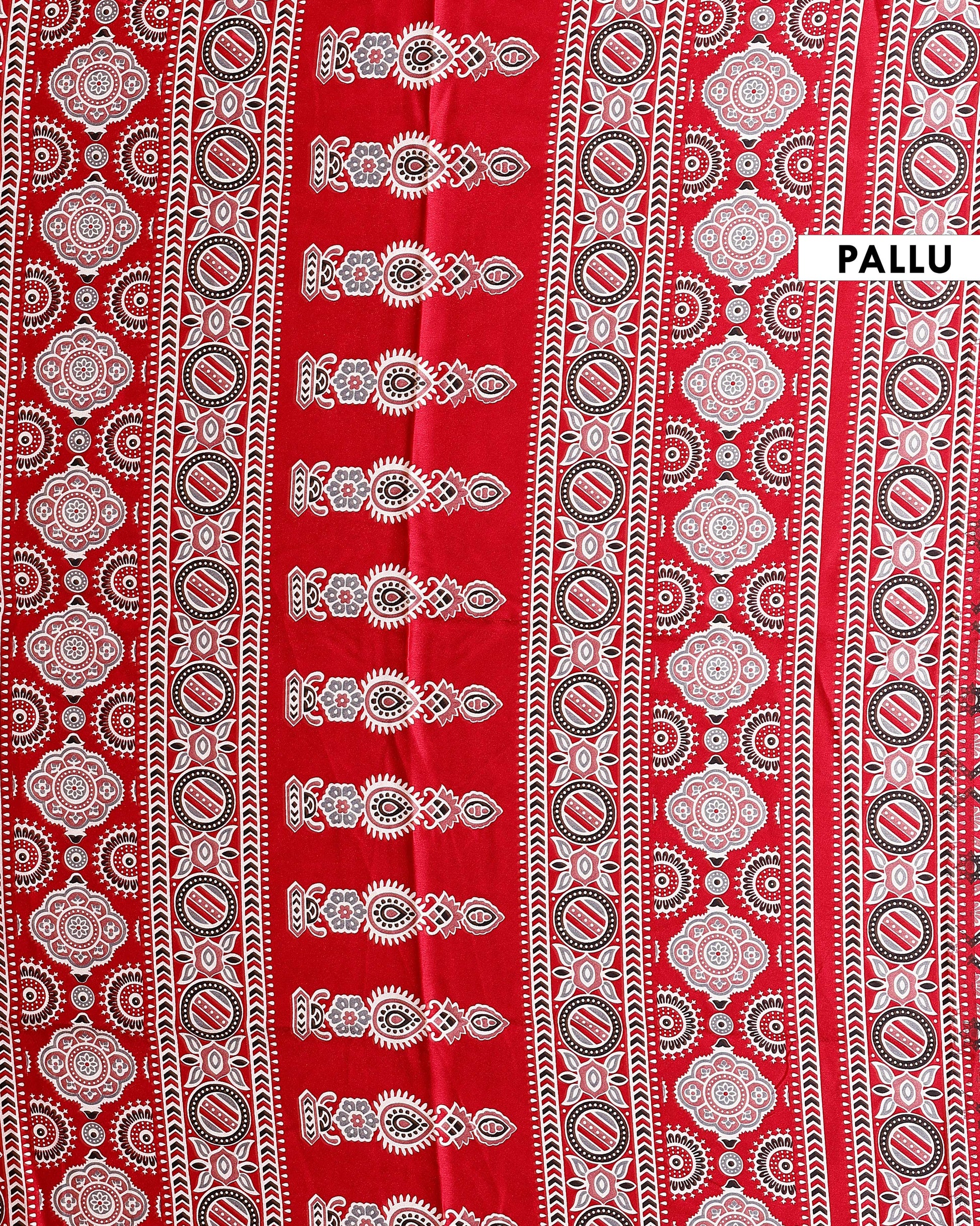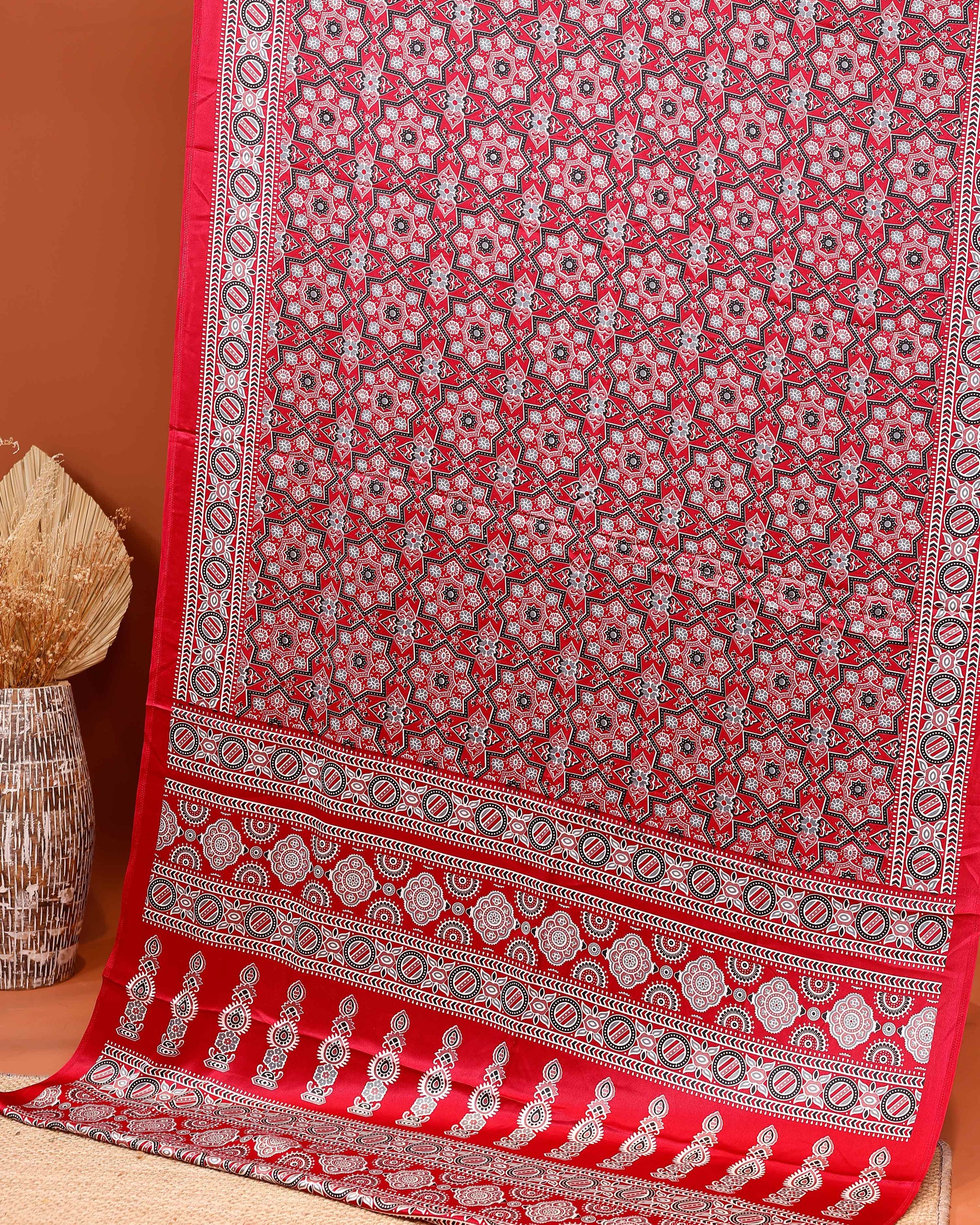 Hand Block Printed Ajrakh Modal Satin Saree with Geometric and Traditional Motifs - Red