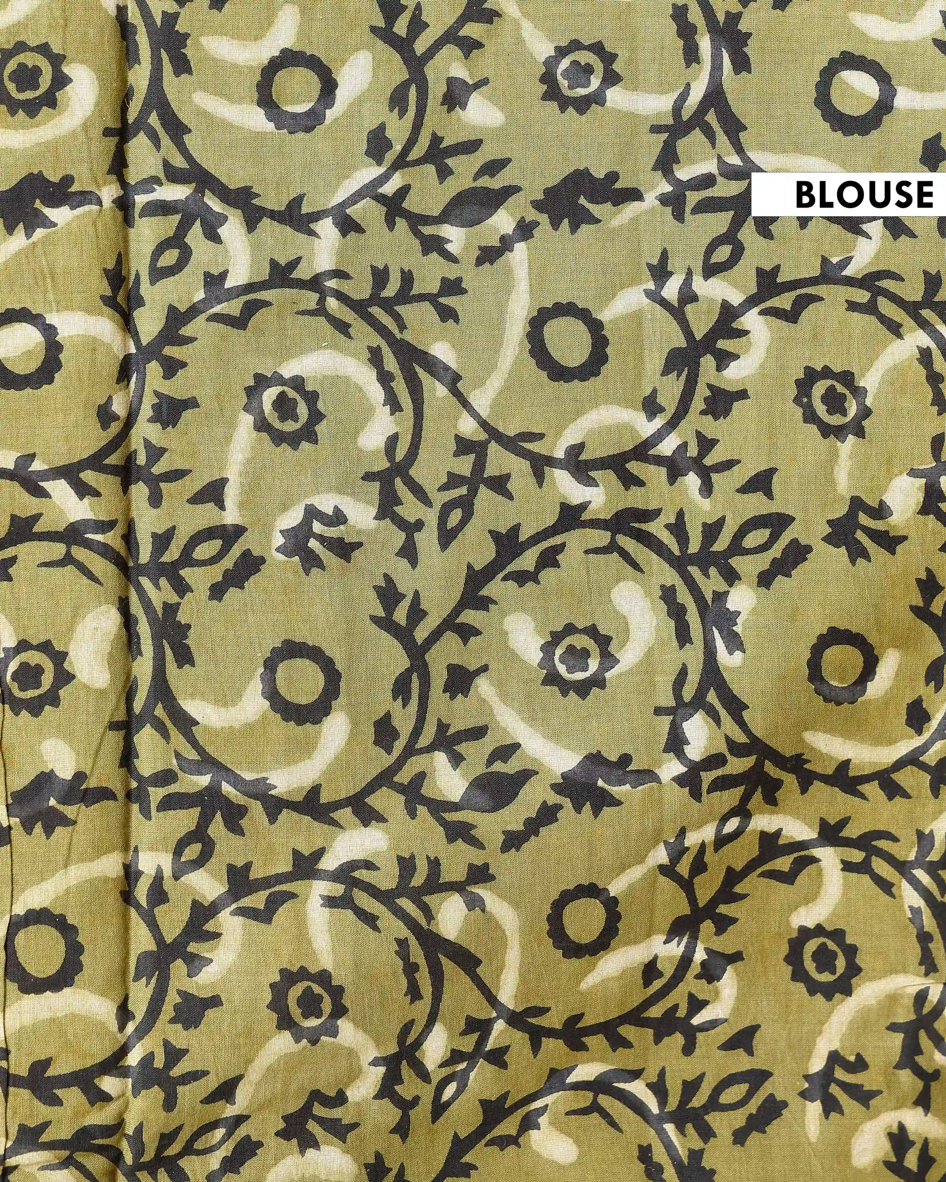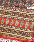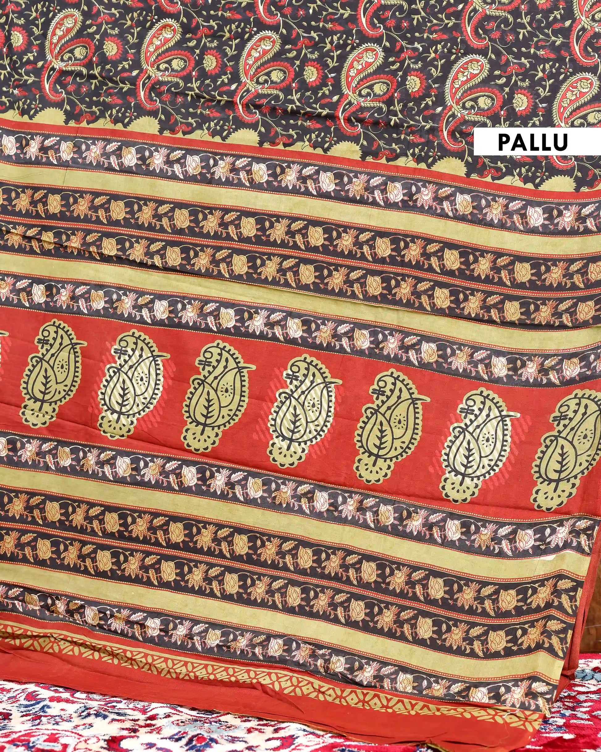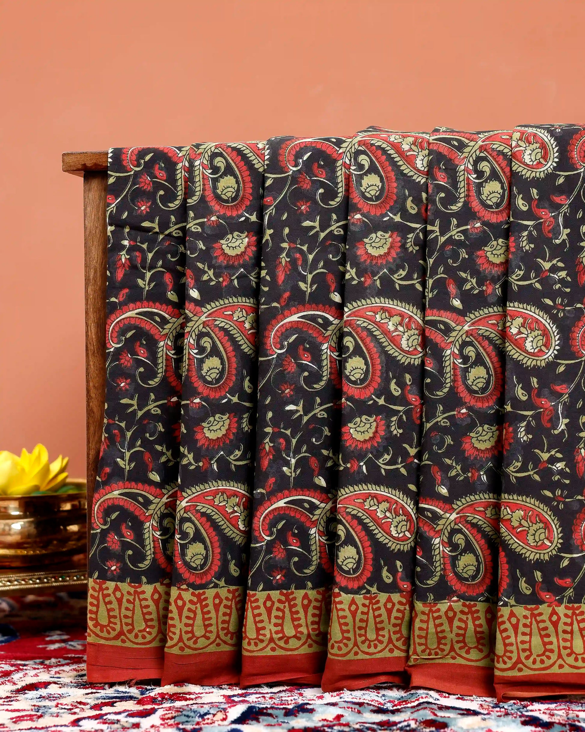Hand Block Printed Paisley & Floral Mul Mul Cotton Saree - Black