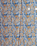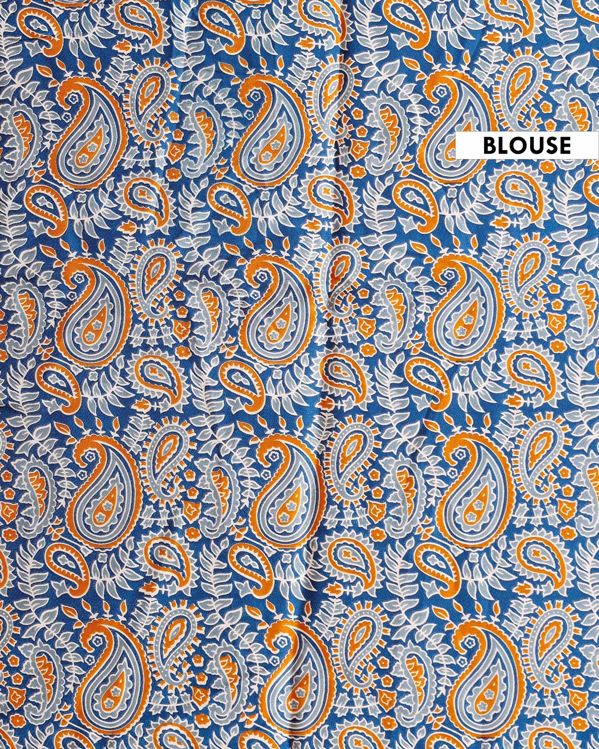 The contrasting border with intricate blue and orange floral patterns adds a touch of traditional elegance, perfect for festive occasions