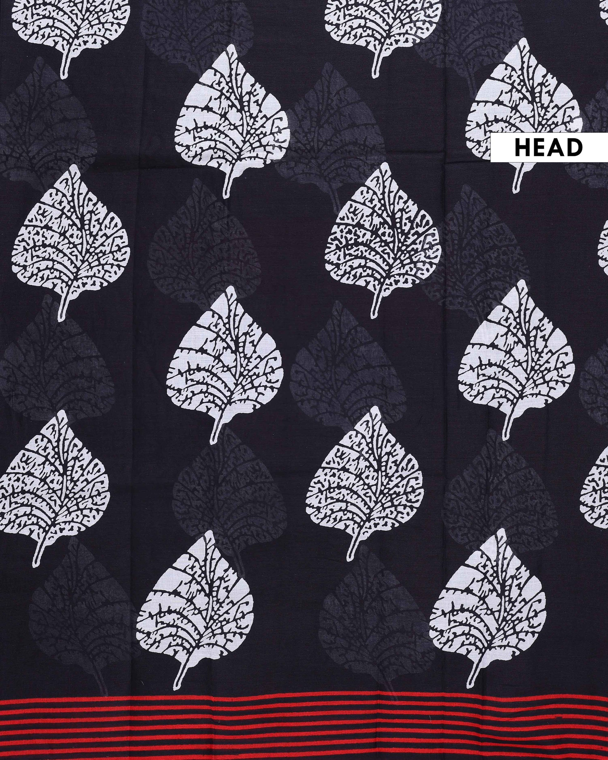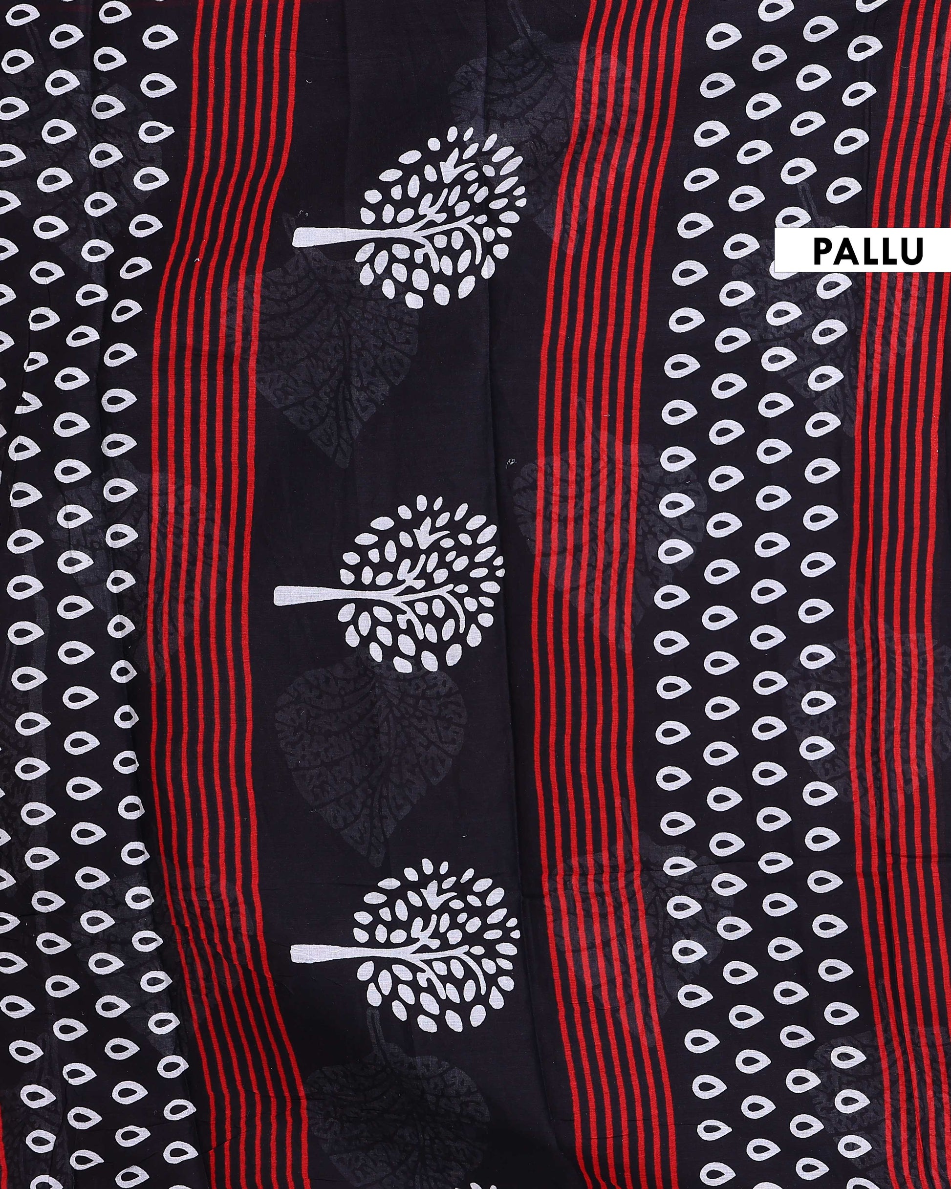 Hand Block Printed Mulmul Semi Cotton Saree with Tree Motif and Striped Border - Black