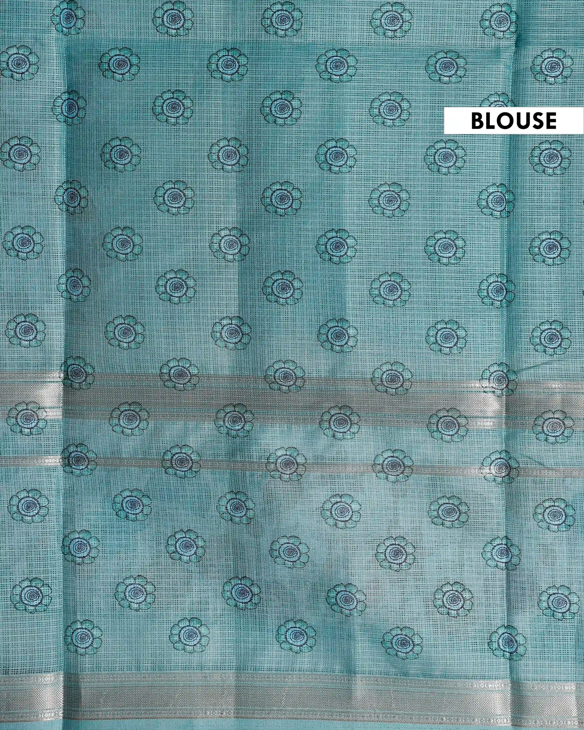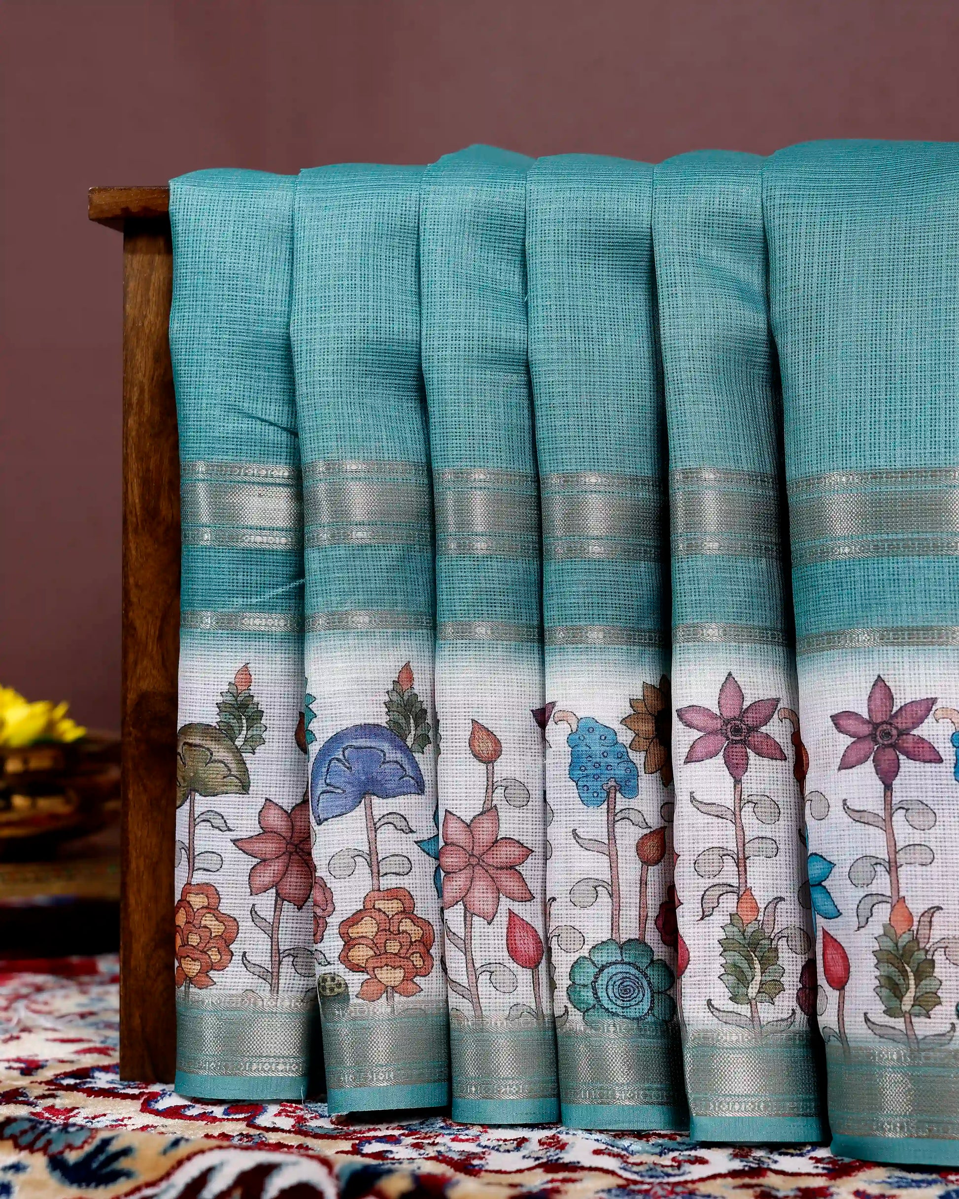 The delicate floral motifs and shimmering zari border on a soft turquoise background make it a perfect blend of tradition and modern elegance.
