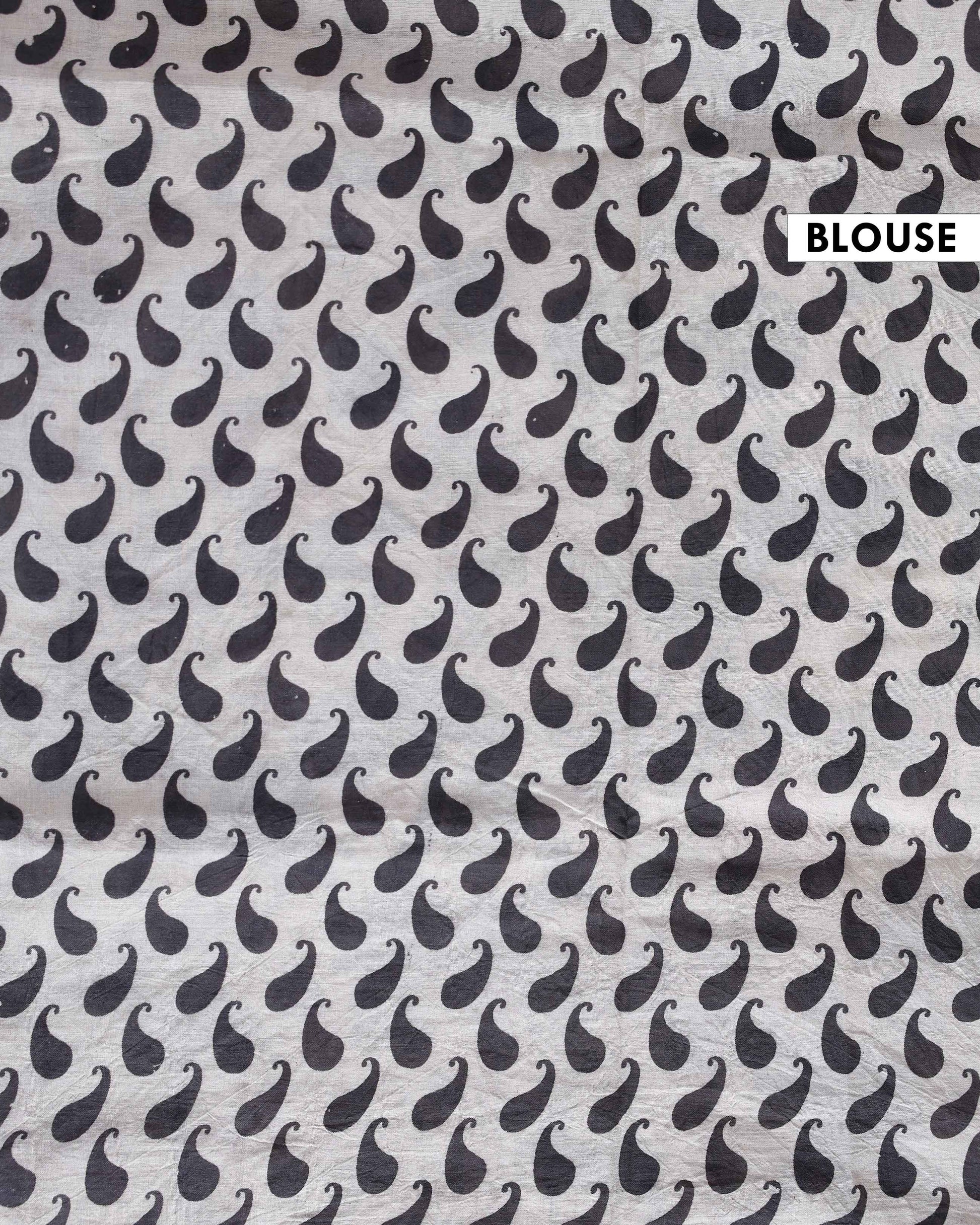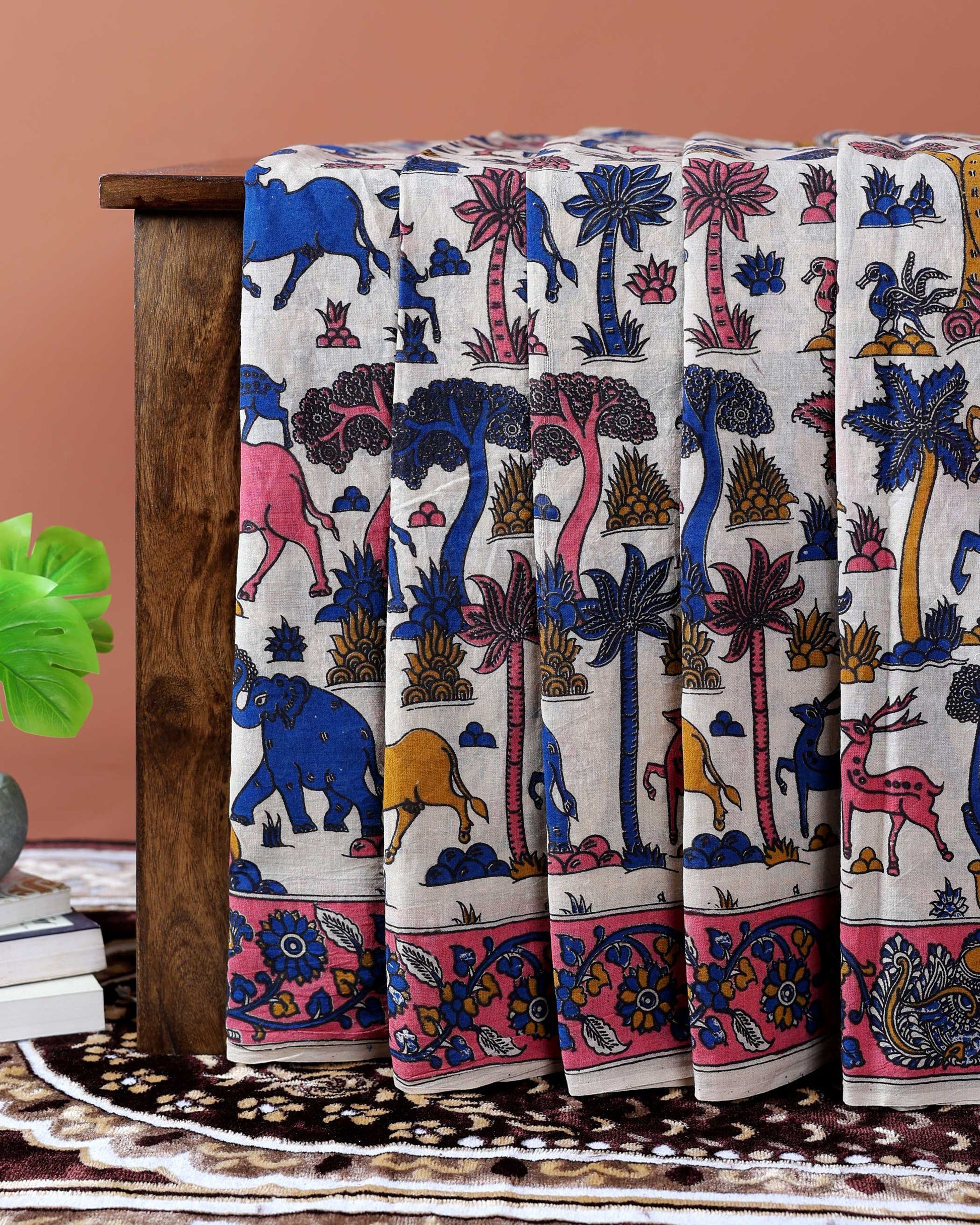 Handcrafted Kalamkari Cotton Saree with Wildlife and Tree Block Print Design - Cream