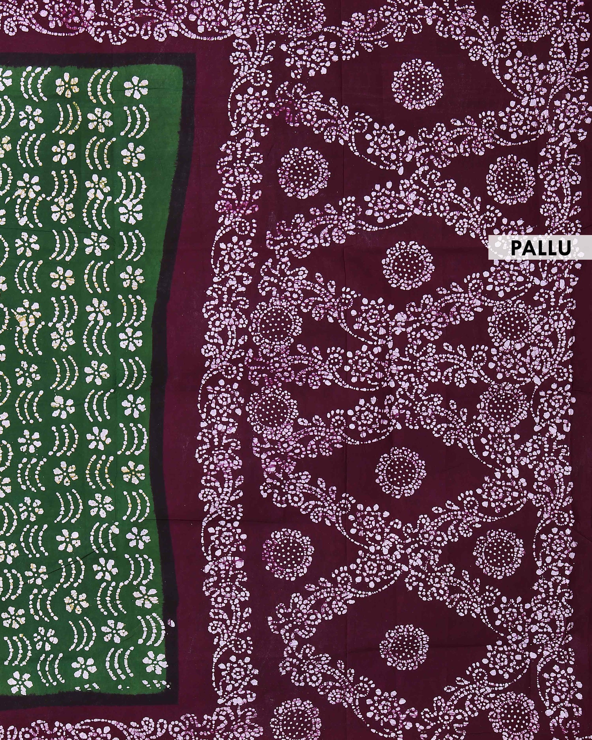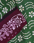 - Elegant green batik cotton saree intricate white floral and geometric prints, perfect for everyday ethnic wear.