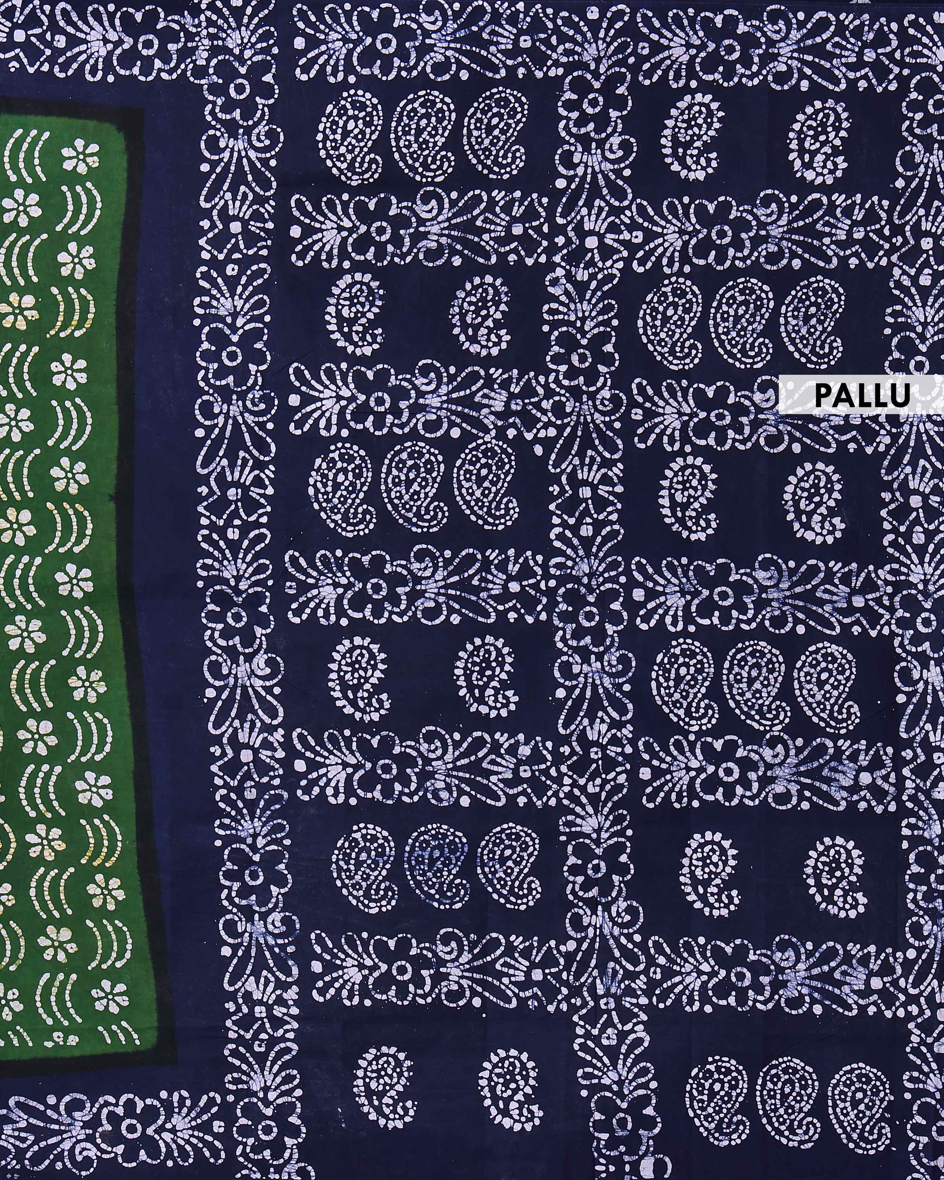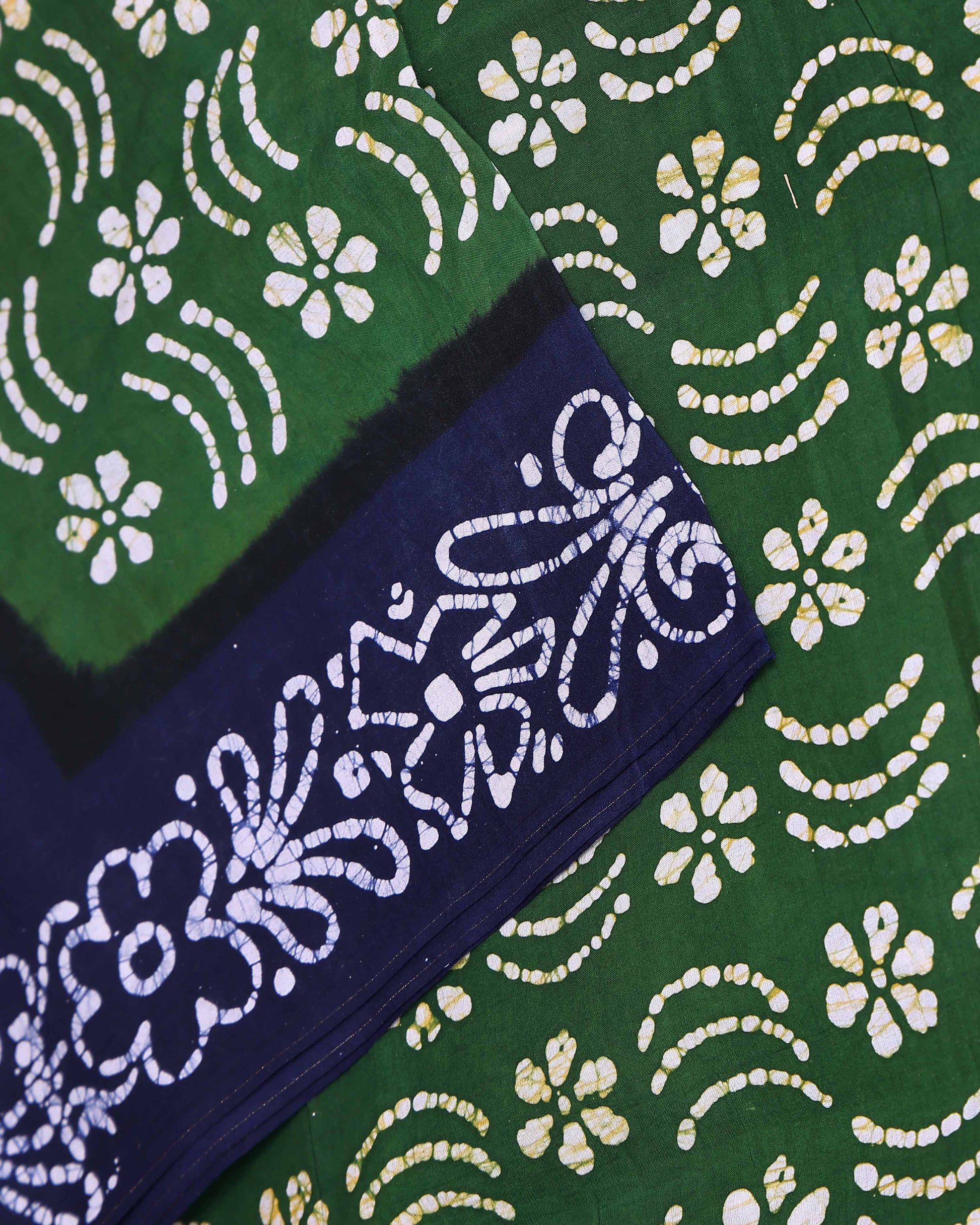 - Handcrafted Green Pure Cotton Wax Batik Sungudi Cotton Saree with Navy Blue Border.