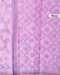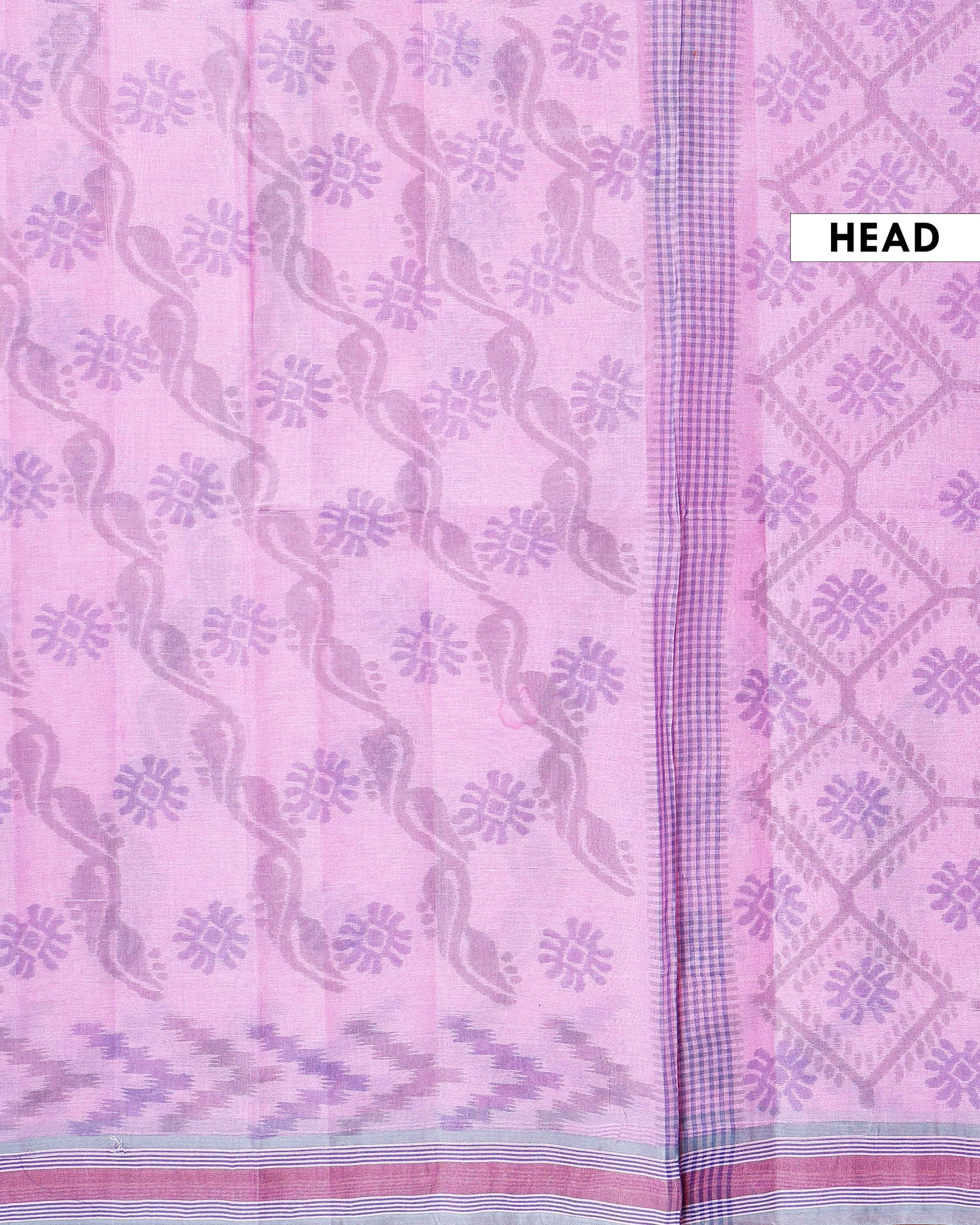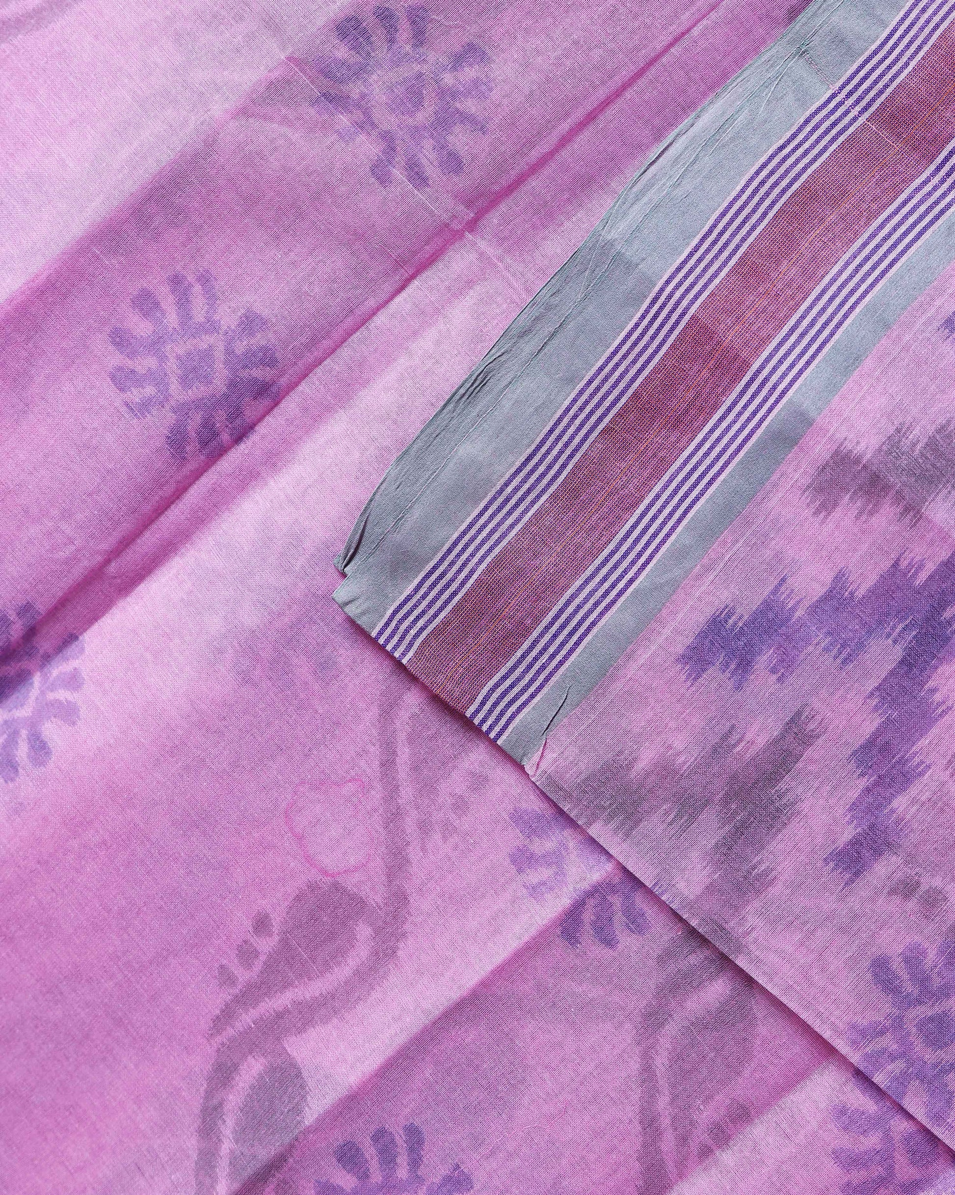 Traditional Bengal Cotton Saree with Floral Block Print and Striped Border - Pink