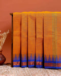 - This Chettinad Cotton Saree a vibrant orange body with subtle stripes, complemented by a striking blue temple-style border and a traditional patterned trim