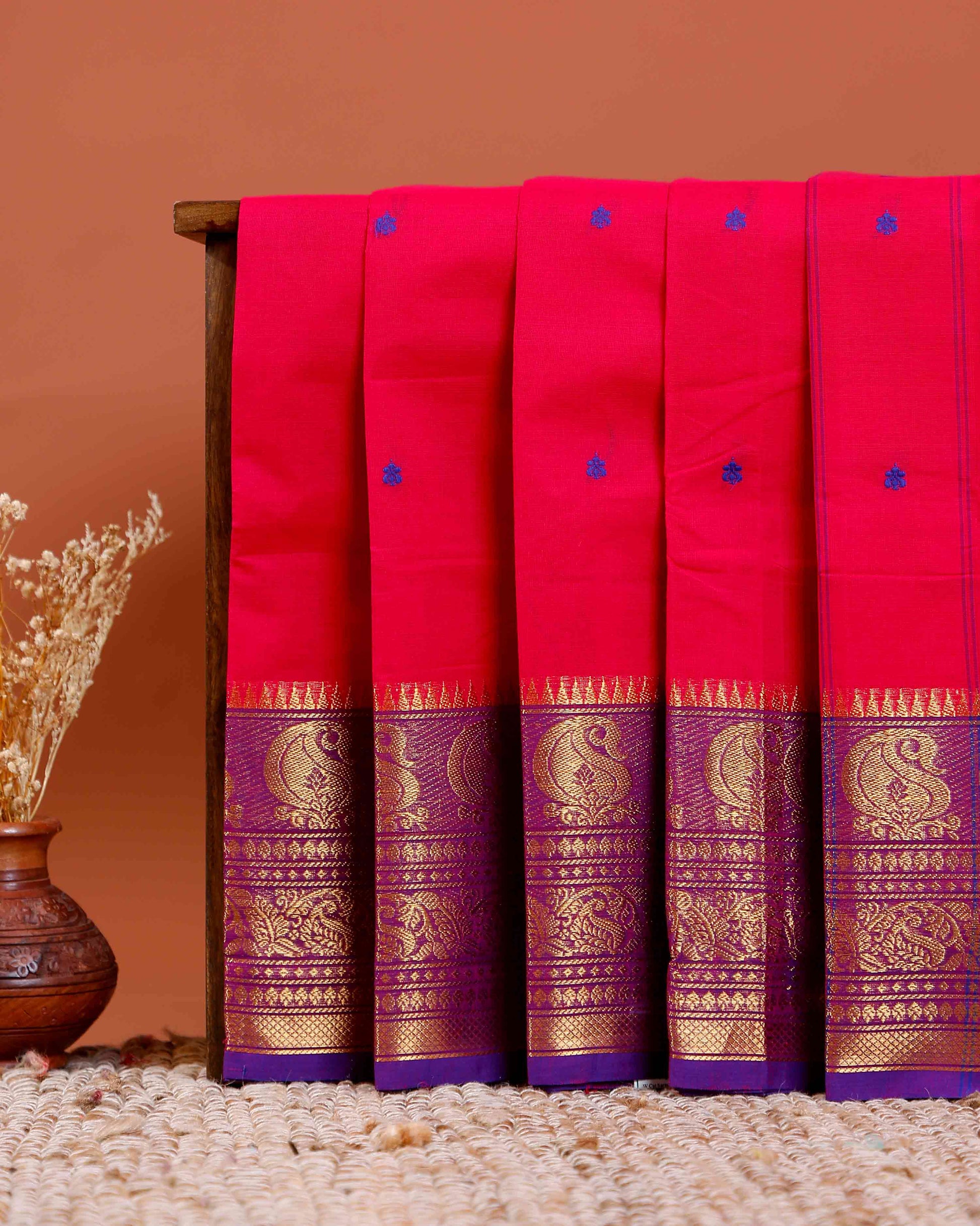 - Tradition with this handloom Chettinad cotton saree, featuring a vibrant pink body and a rich violet border