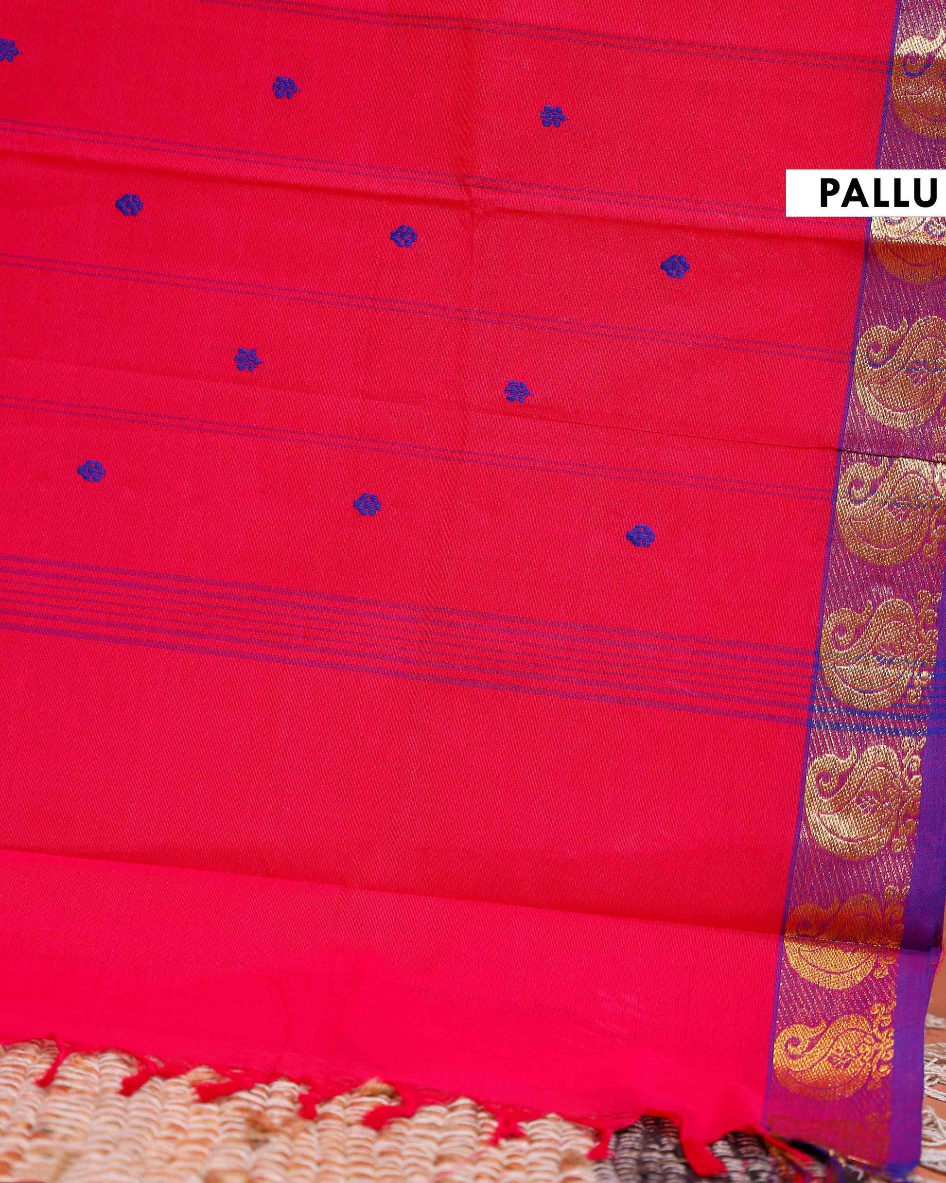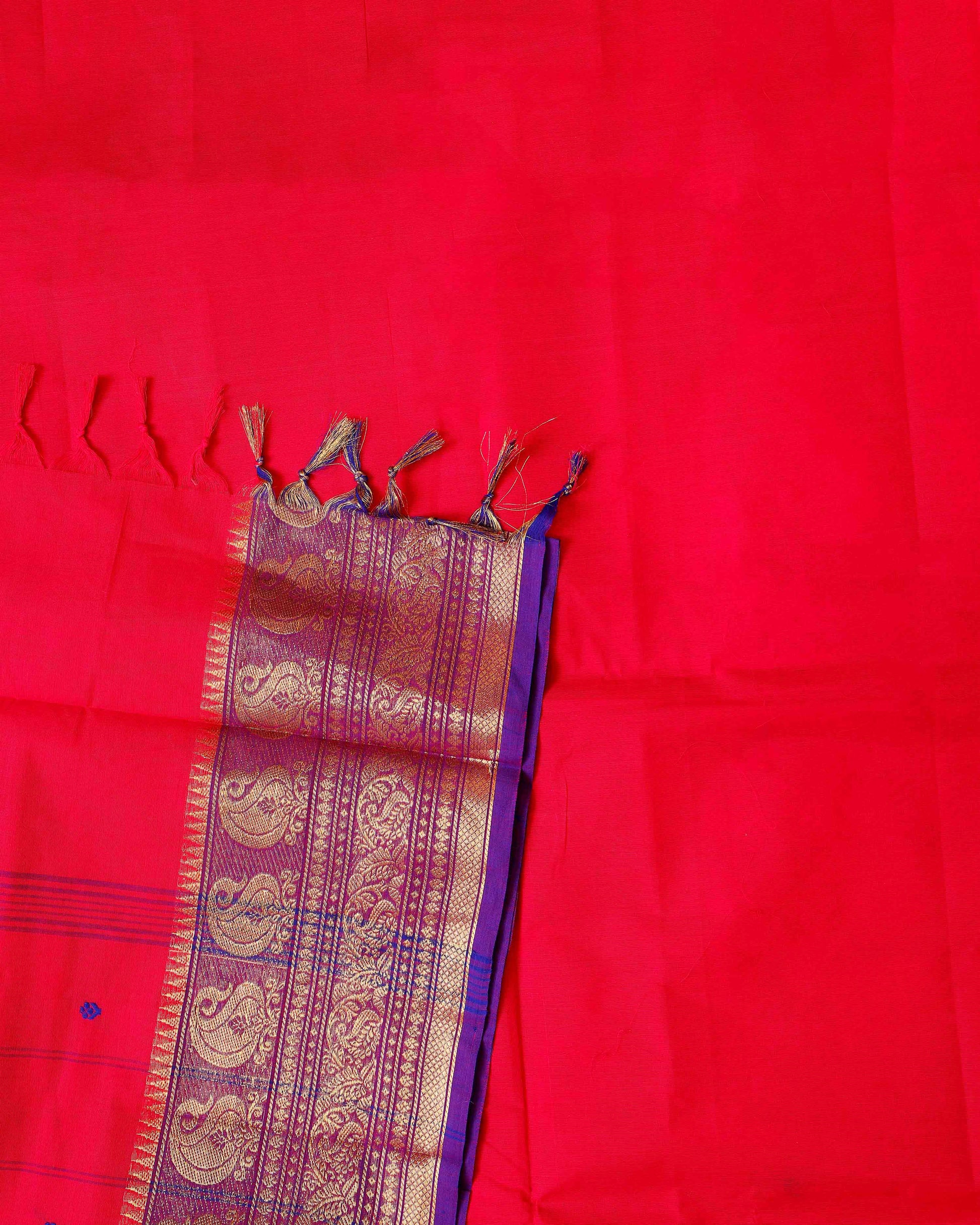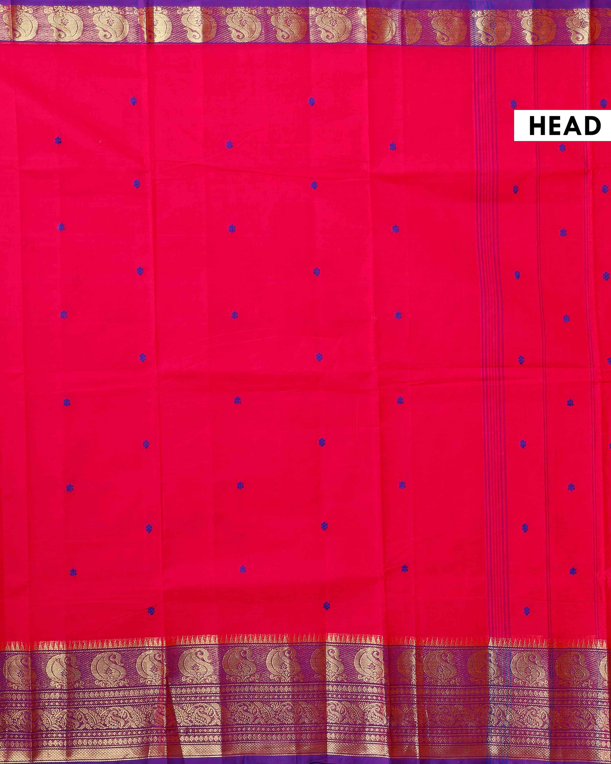 Handloom Chettinad Cotton Saree with Butta Weaves, Zari Peacock Motif Border and Contrast Pallu - Dark Pink