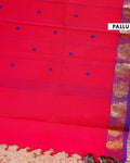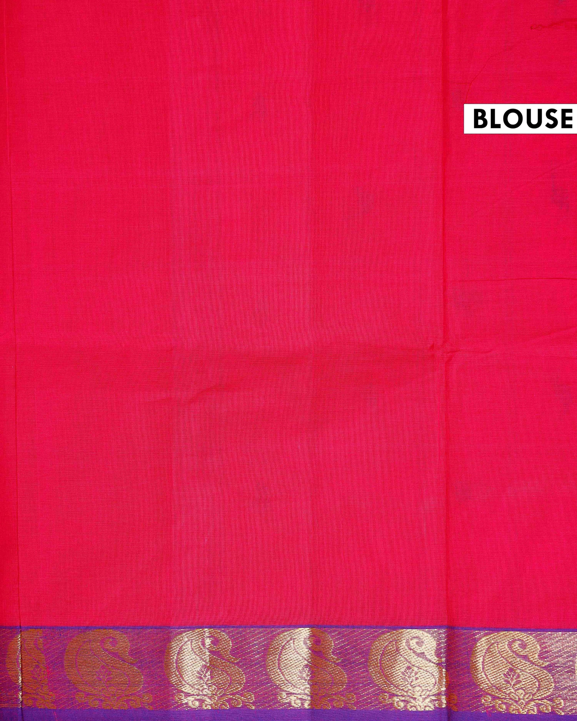 - Tradition with this handloom Chettinad cotton saree, featuring a vibrant pink body and a rich violet border