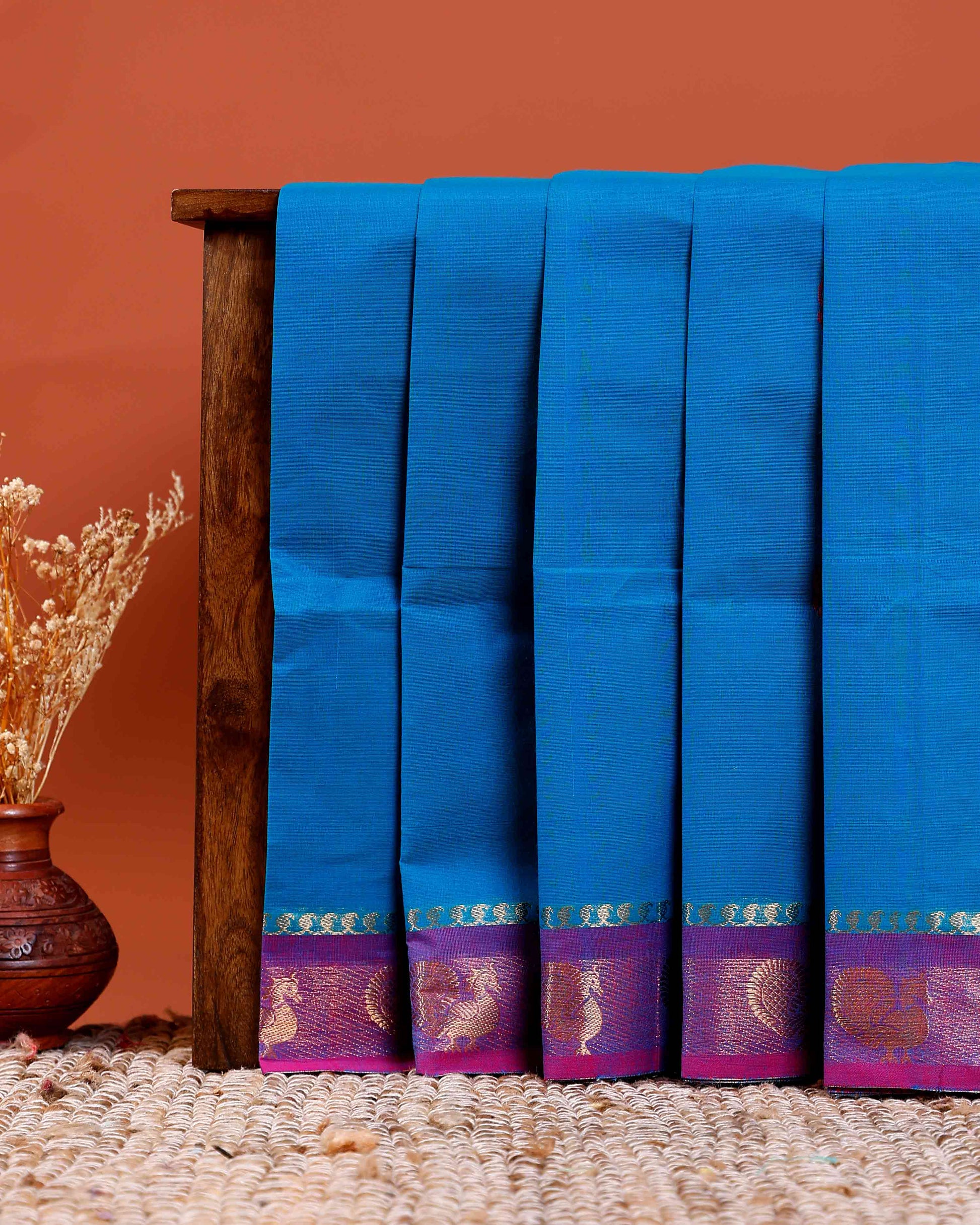 Handloom Chettinad Cotton Saree with Rich Zari Peacock Motif Border and Elegant Contrast Pallu - Blue