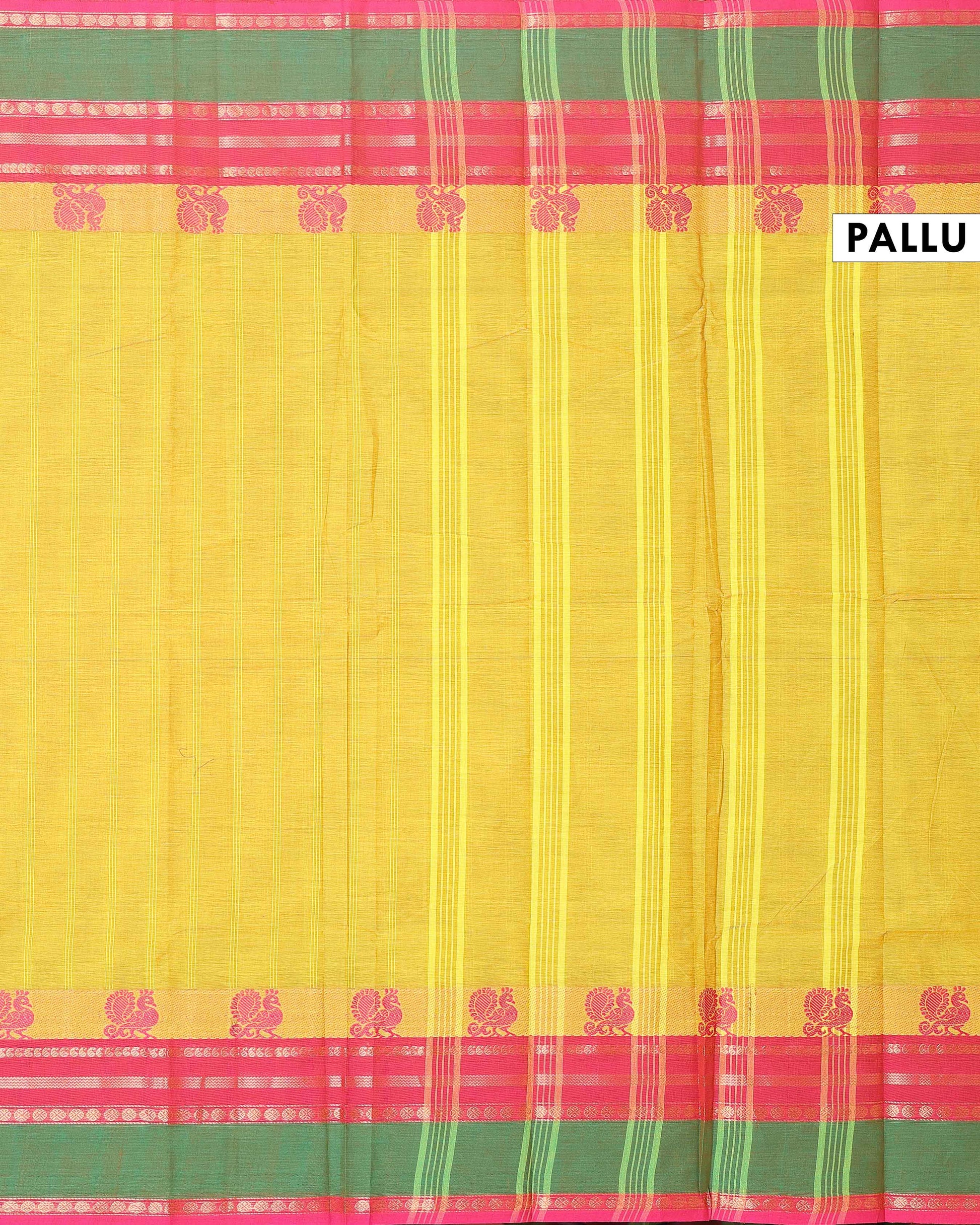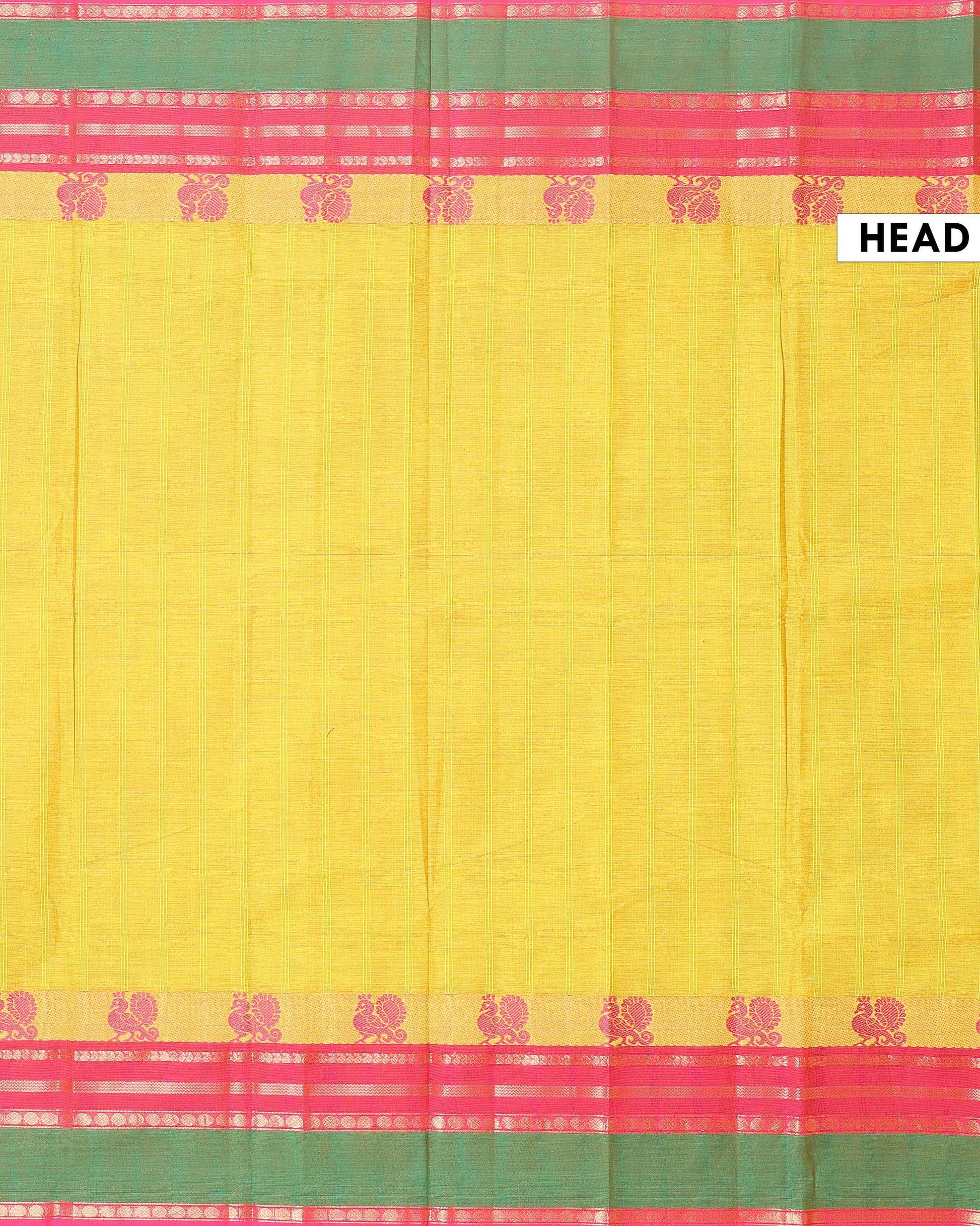 Handloom Chettinad Cotton Saree with Traditional Peacock and Temple Border - Yellow