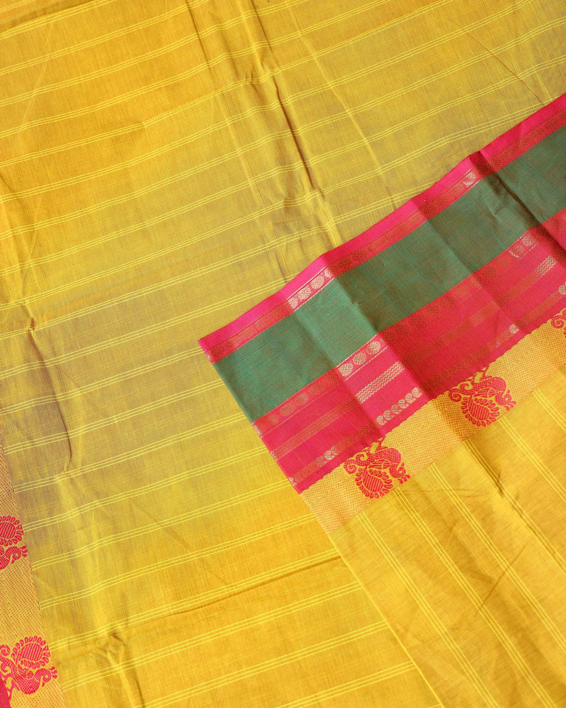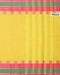 - This handwoven Chettinad cotton saree features a vibrant yellow body with a subtle checkered pattern, complemented by a striking red and green border