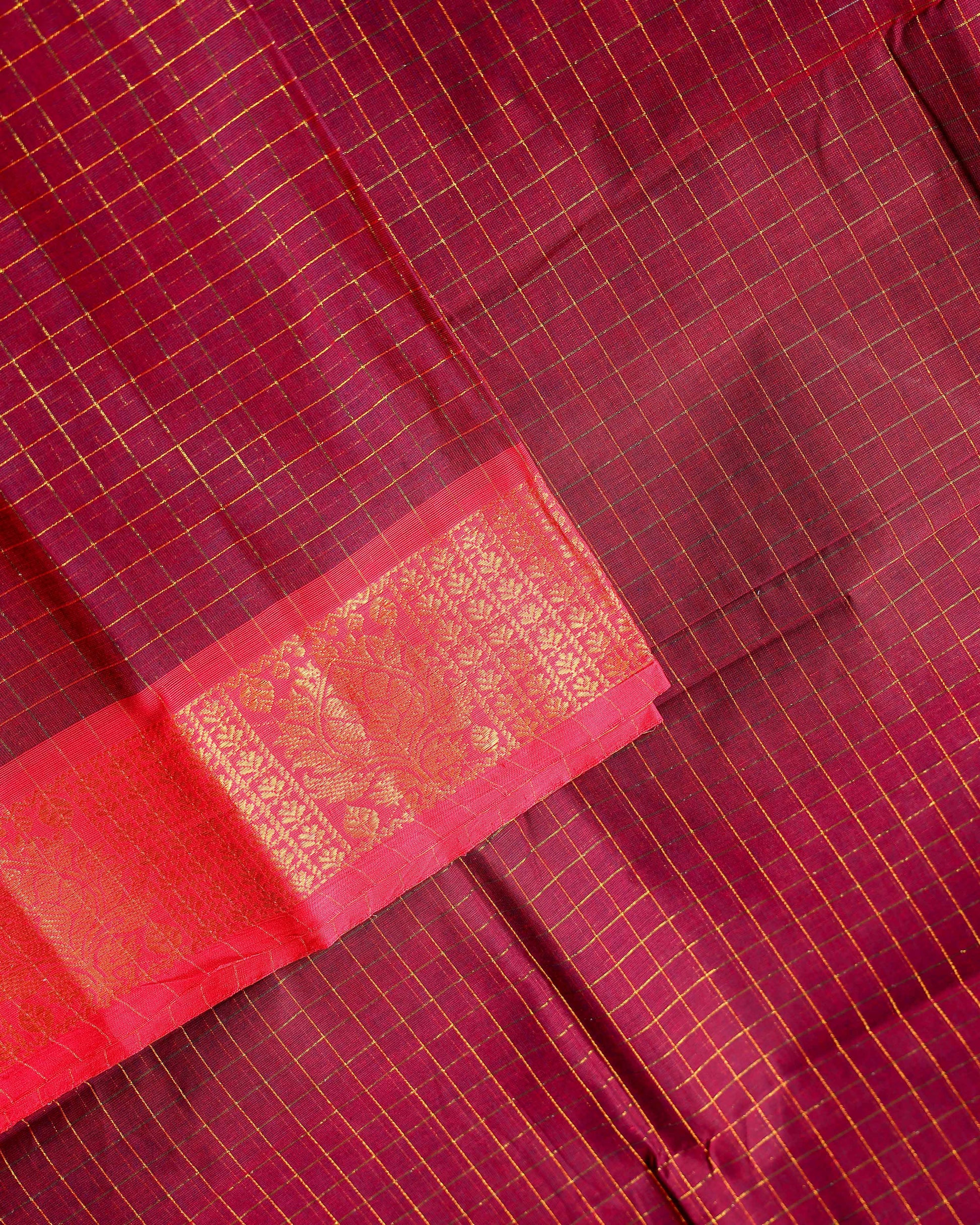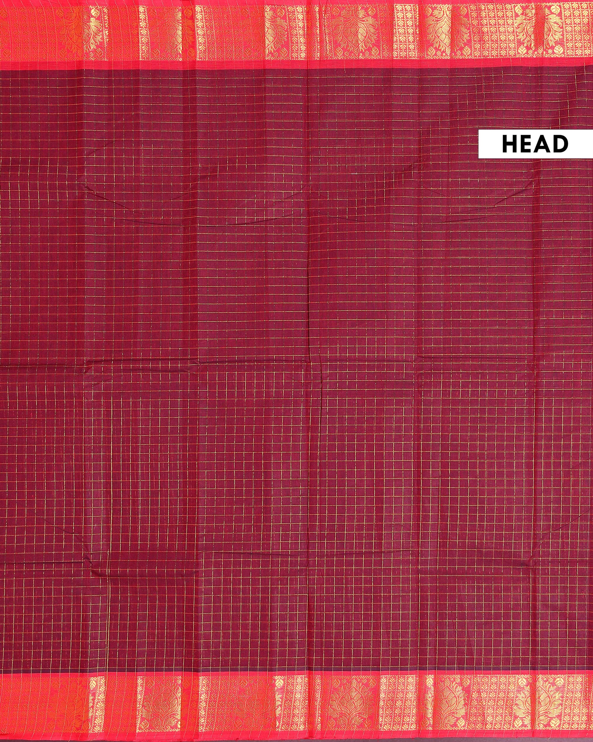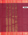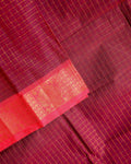- Elevate your ethnic wardrobe with this Dark Maroon Chettinad cotton saree, a classic checkered body and a rich, contrasting Red border with intricate peacock and floral zari motifs.