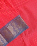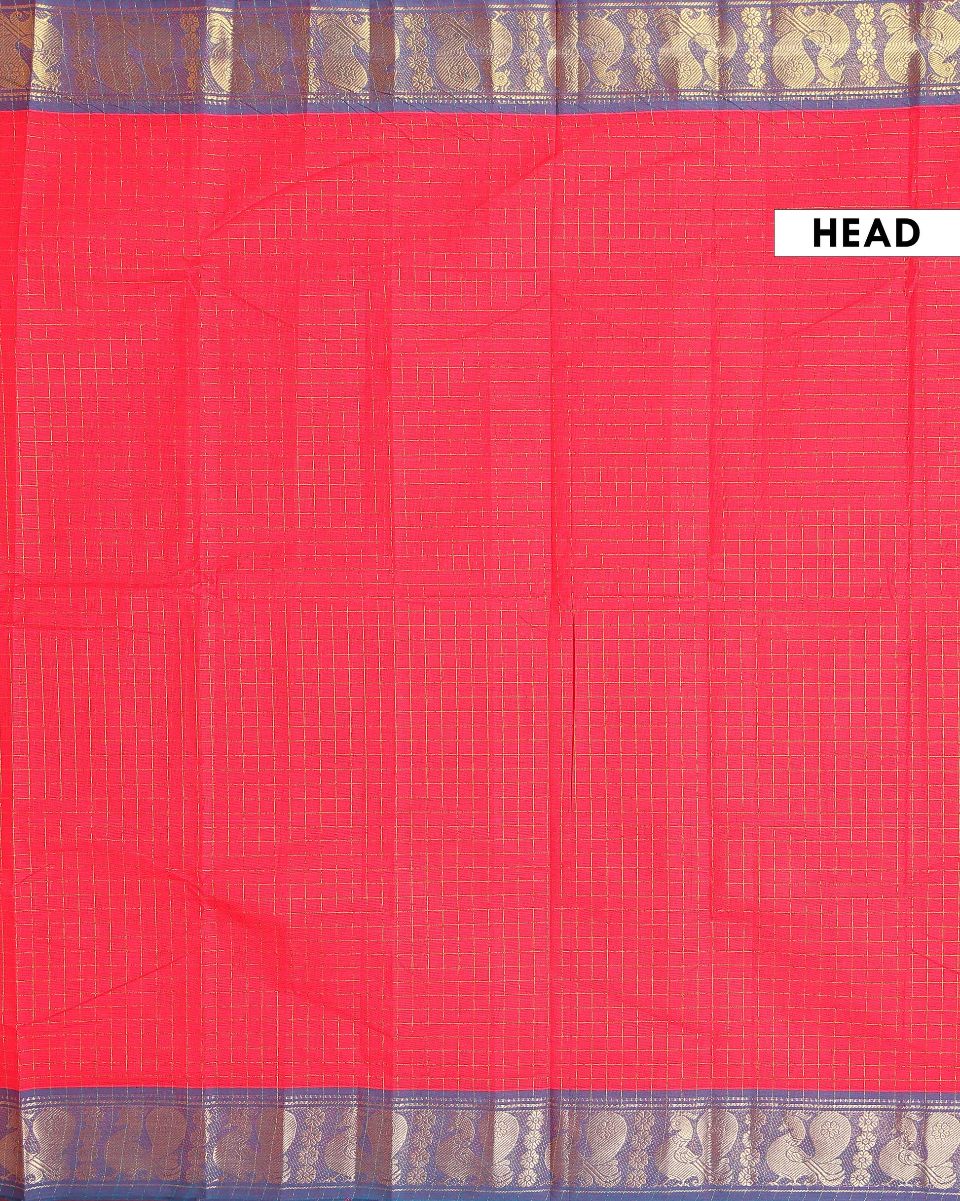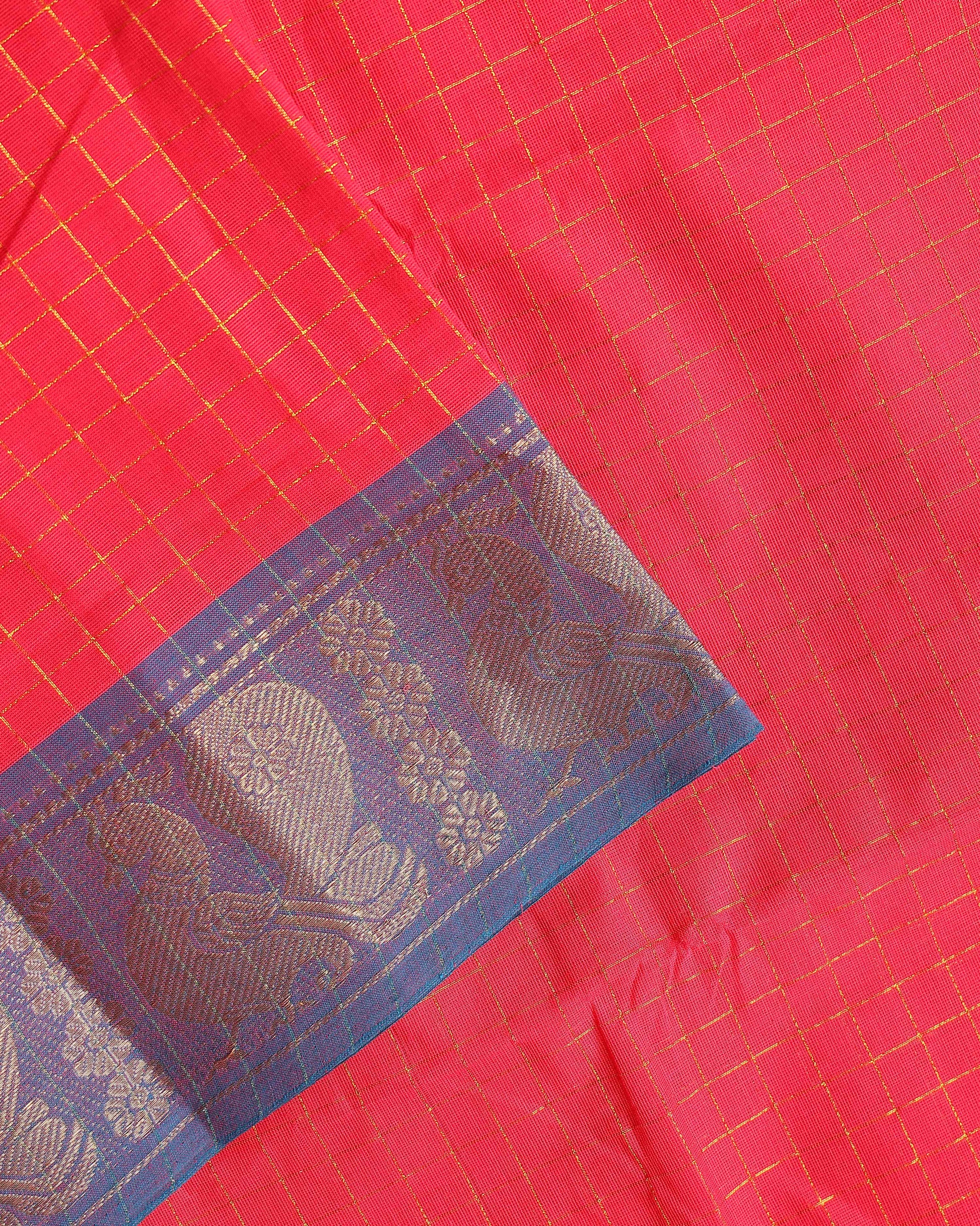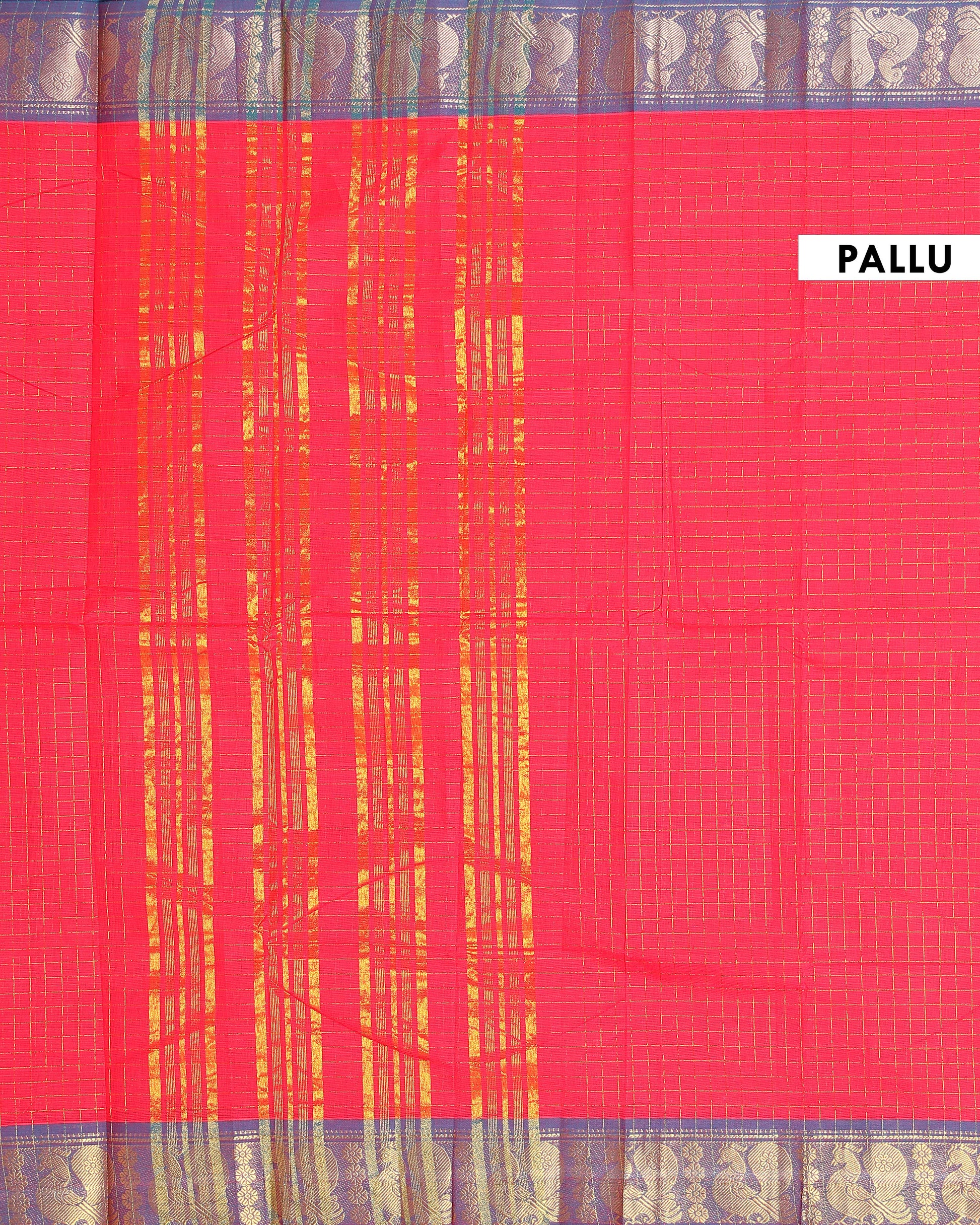 - Elevate your ethnic wardrobe with this Dark Orange Chettinad cotton saree, a classic checkered body and a rich, contrasting Blue border with intricate peacock and floral zari motifs.