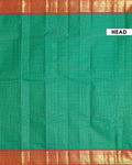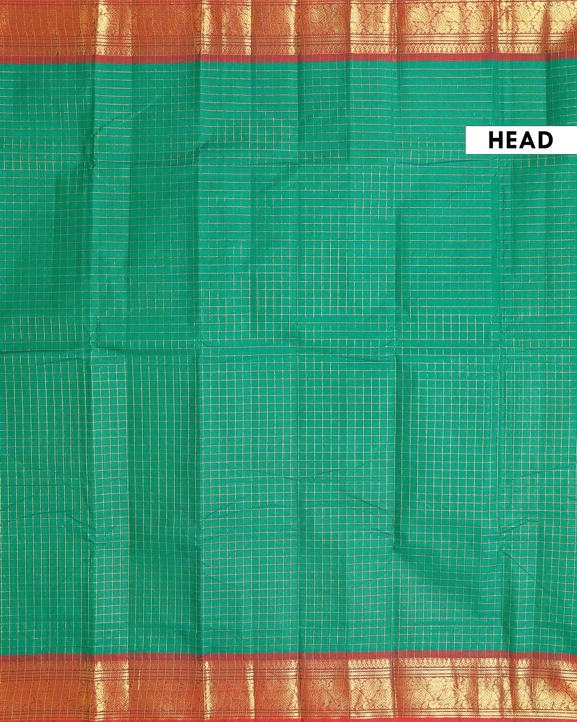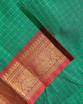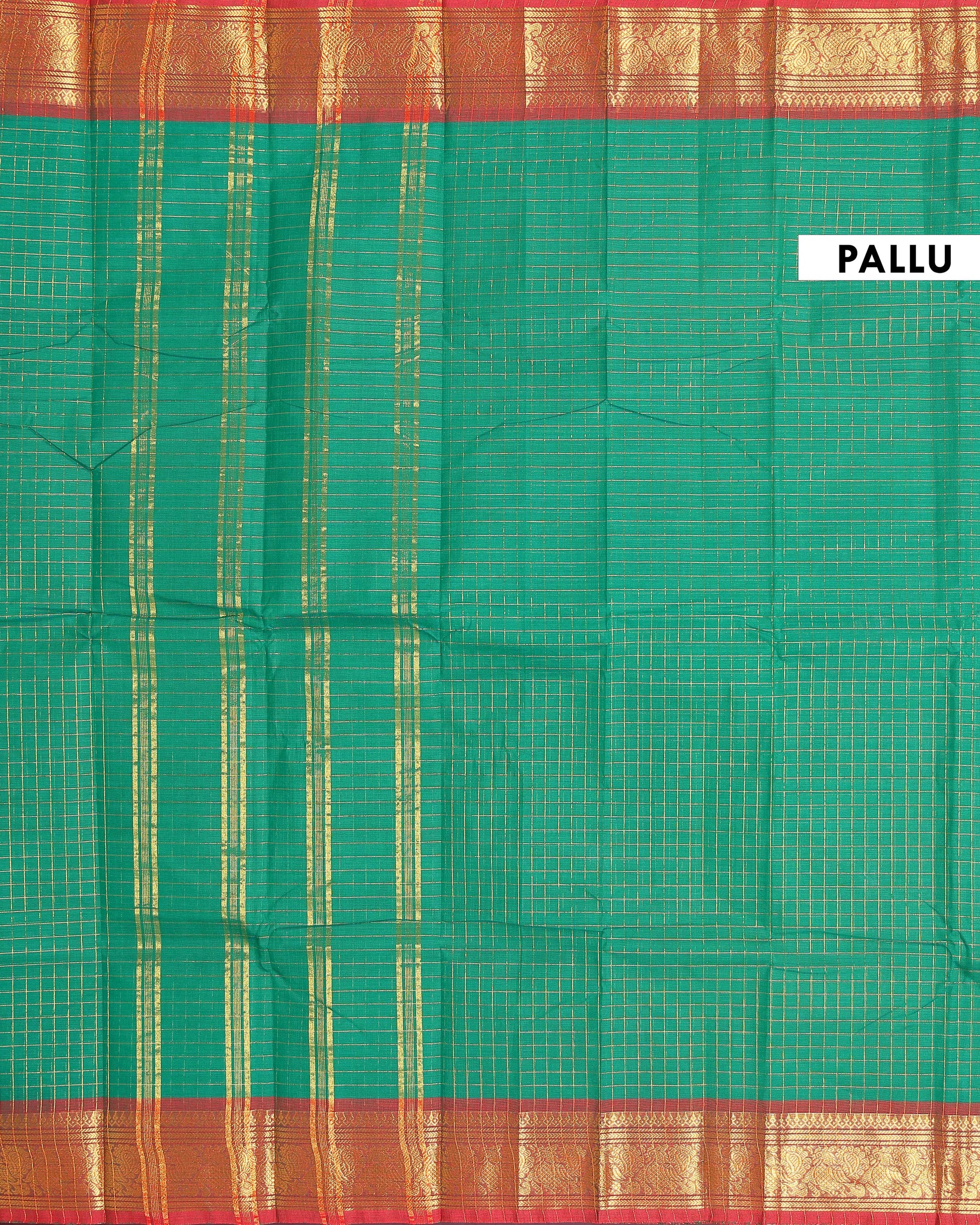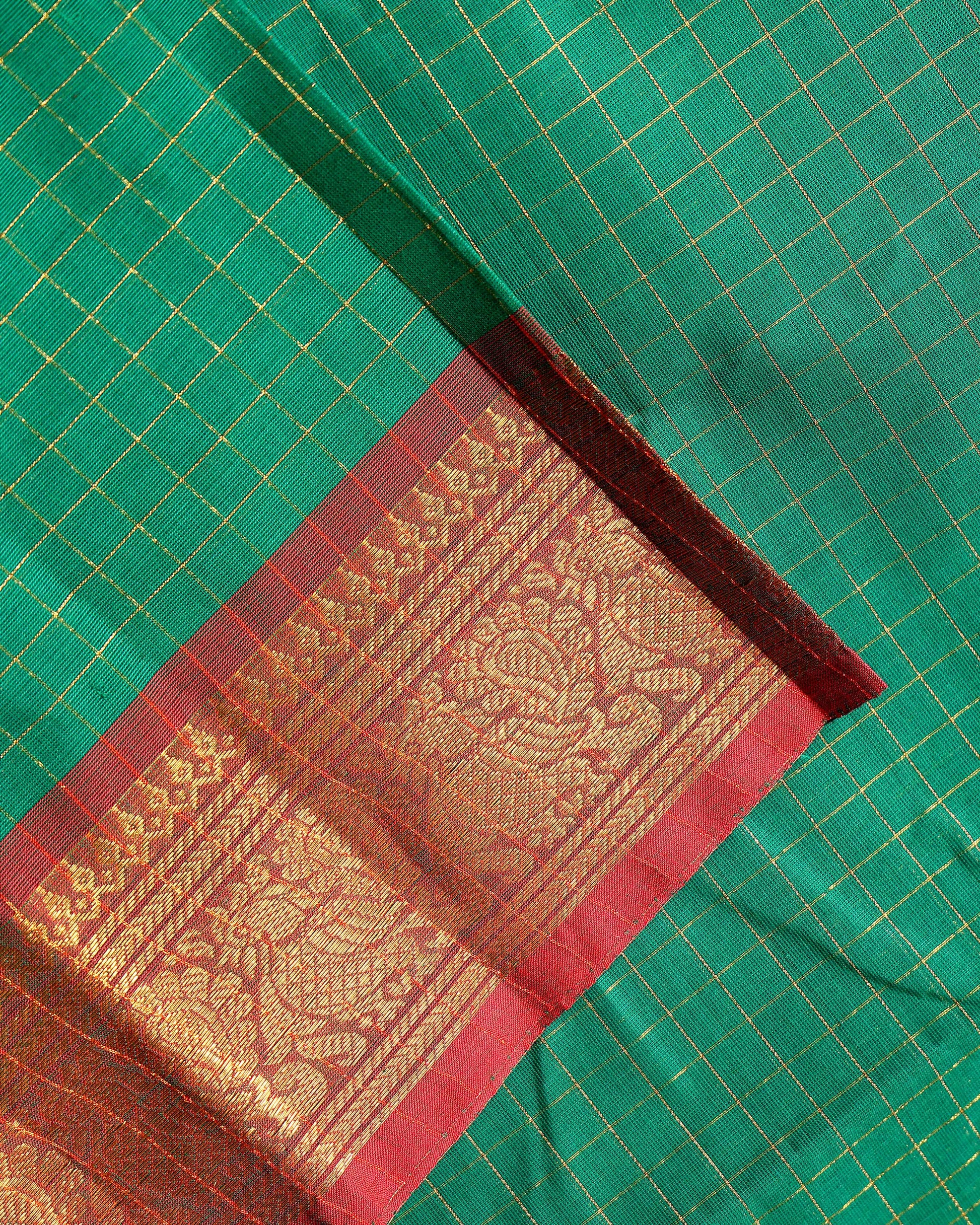 - Elevate your ethnic wardrobe with this Green Chettinad cotton saree, a classic checkered body and a rich, contrasting Red border with intricate peacock and floral zari motifs.