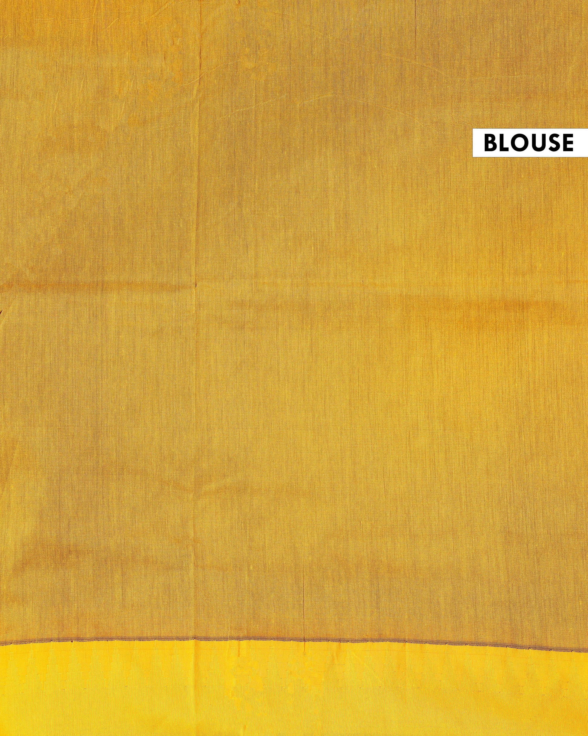 The contrasting bright yellow border with a traditional design adds a vibrant touch making it a perfect choice for festive occasions or daily wear.