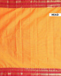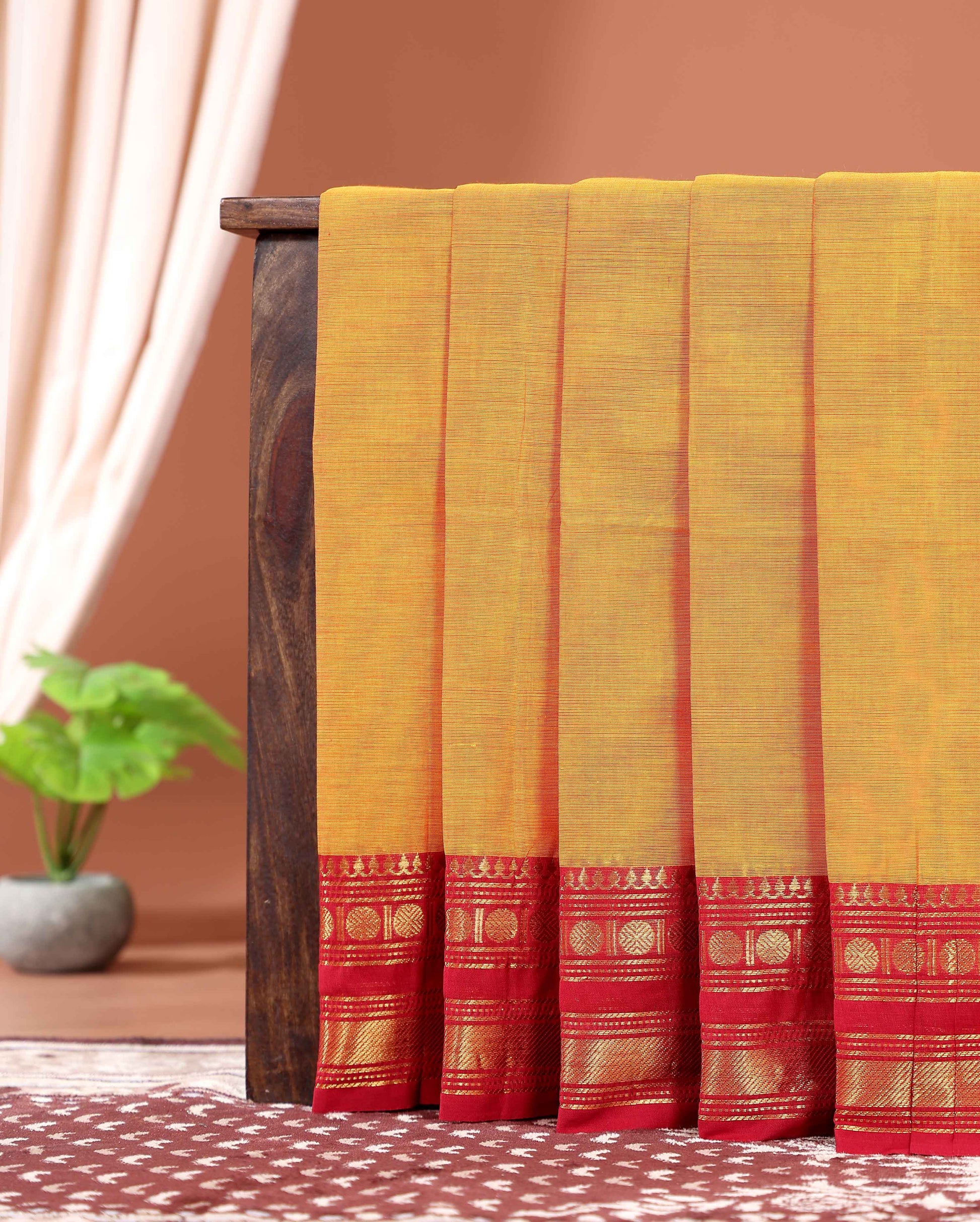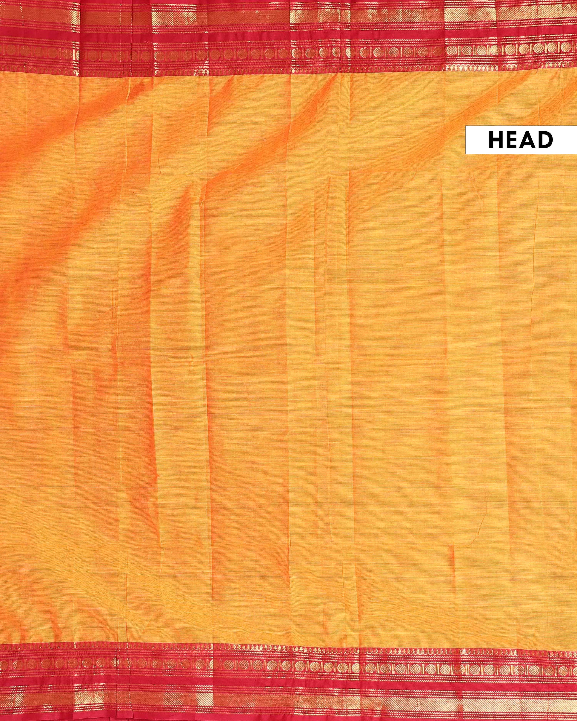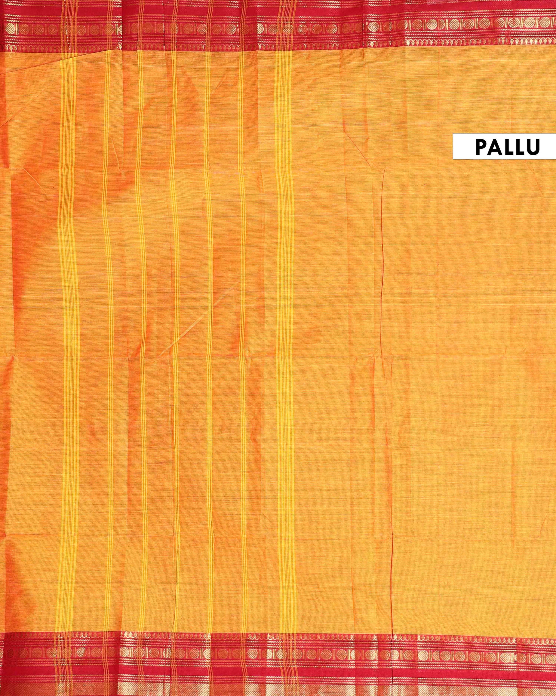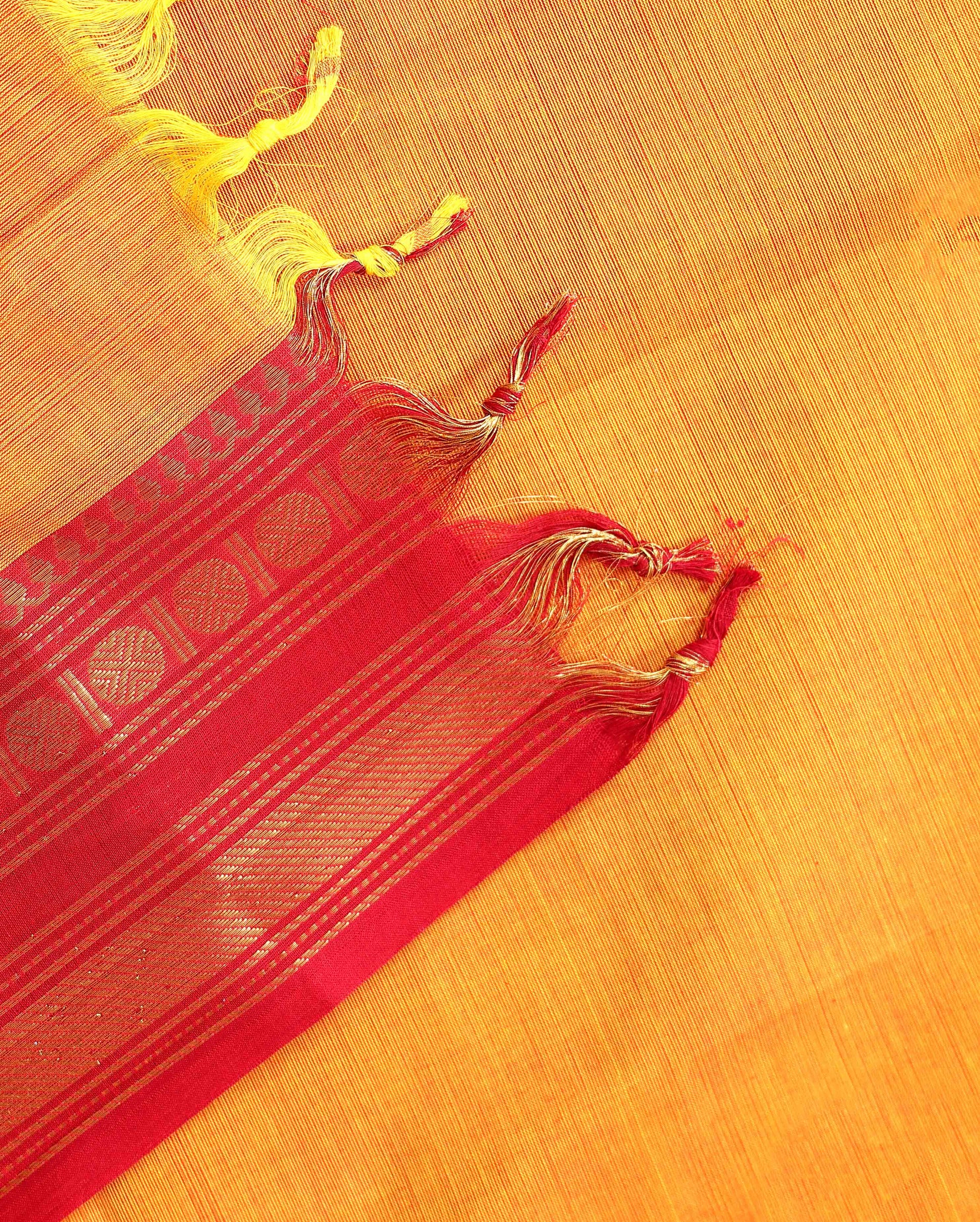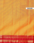 - This exquisite Kanchi cotton saree a rich mustard yellow body and a striking contrast red border adorned with traditional golden zari work