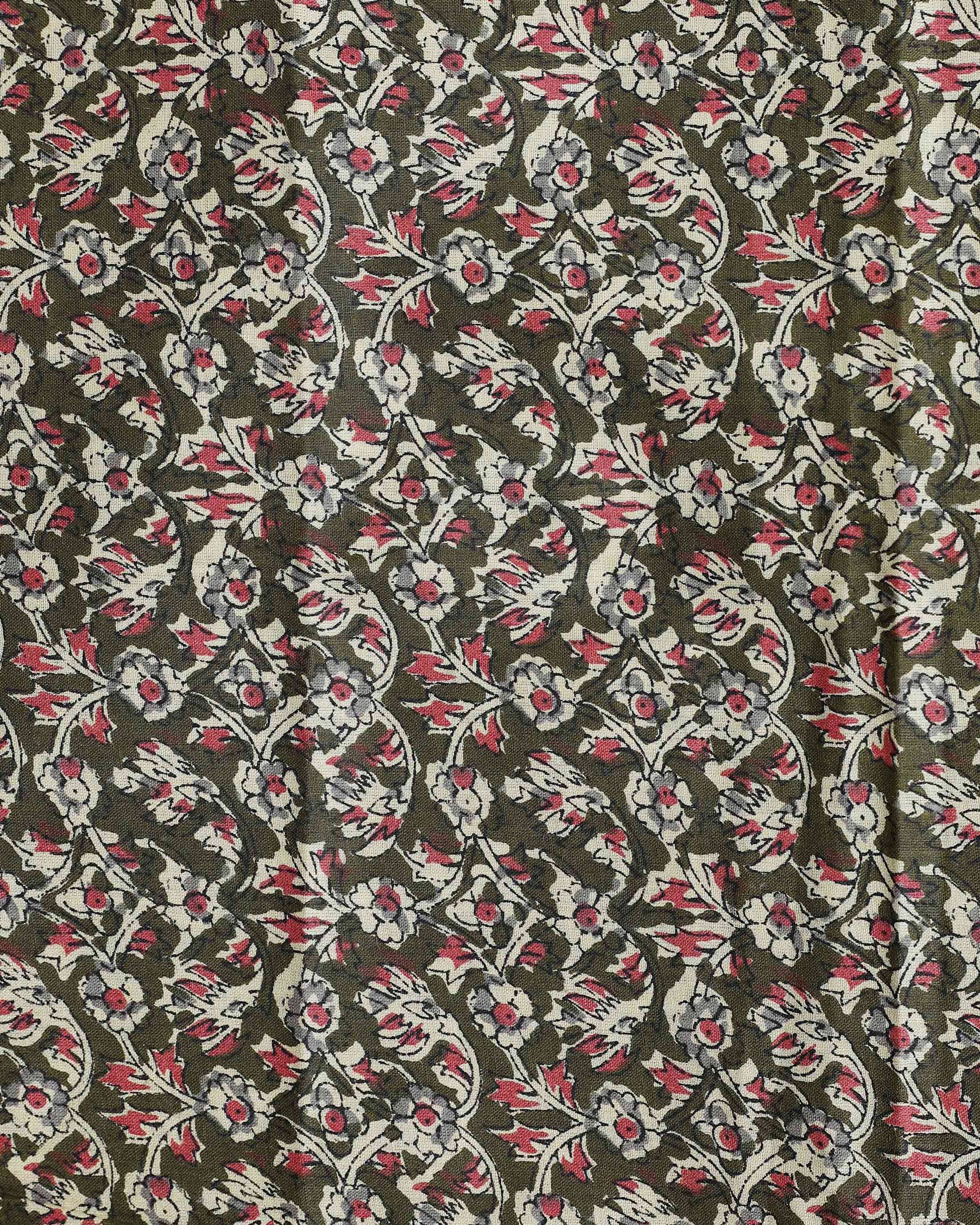 - The saree a subtle texture and is paired with a beautiful printed blouse piece, combining traditional craftsmanship with modern style.