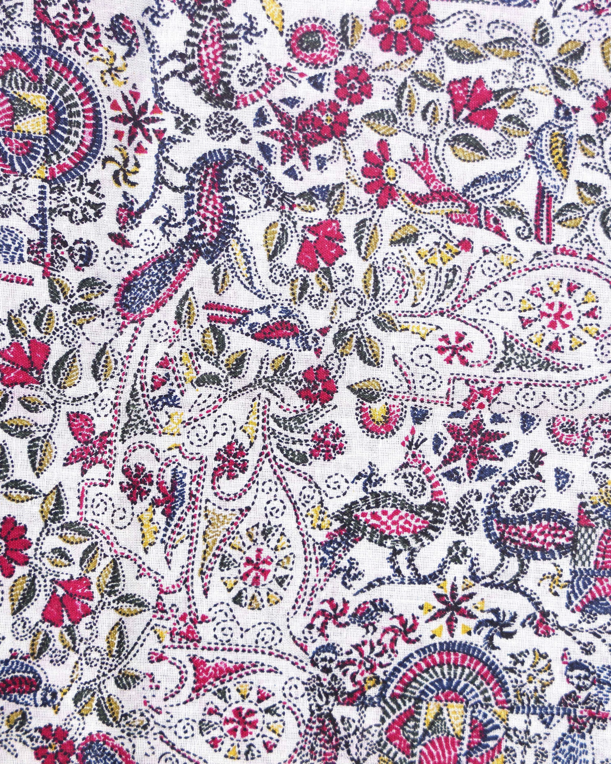 - The saree a subtle texture and is paired with a beautiful printed blouse piece, combining traditional craftsmanship with modern style.