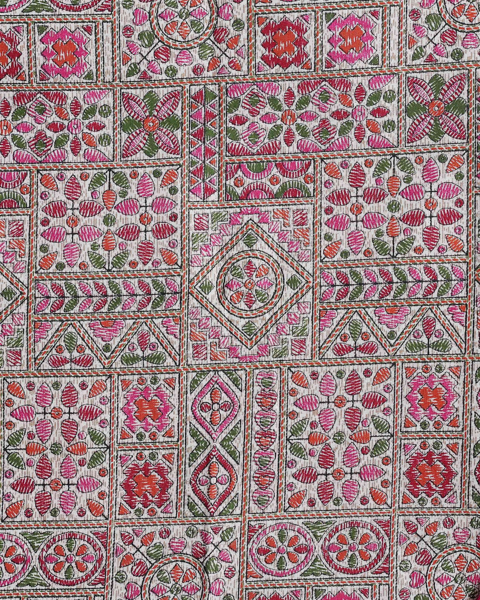 - The saree a subtle texture and is paired with a beautiful printed blouse piece, combining traditional craftsmanship with modern style.