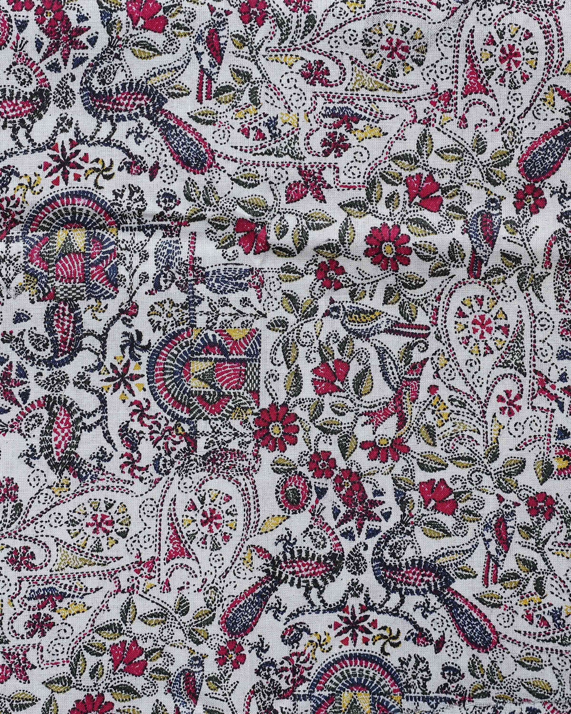 - The saree a subtle texture and is paired with a beautiful printed blouse piece, combining traditional craftsmanship with modern style.