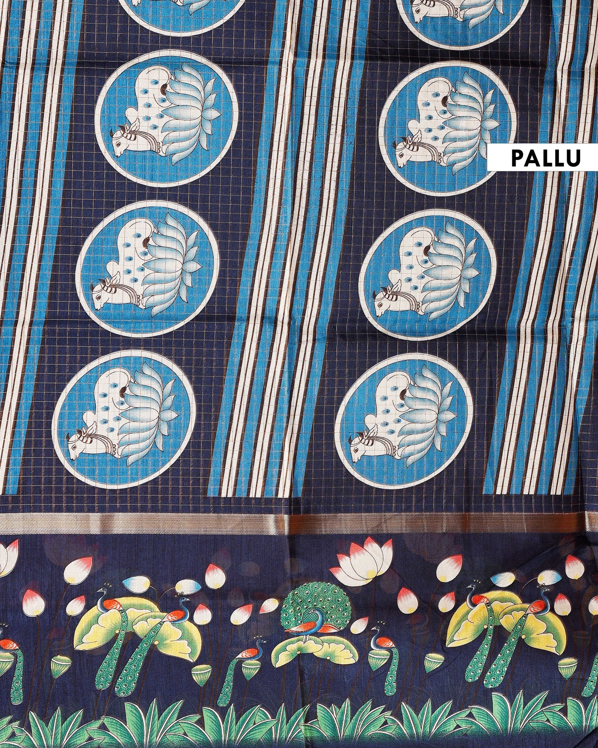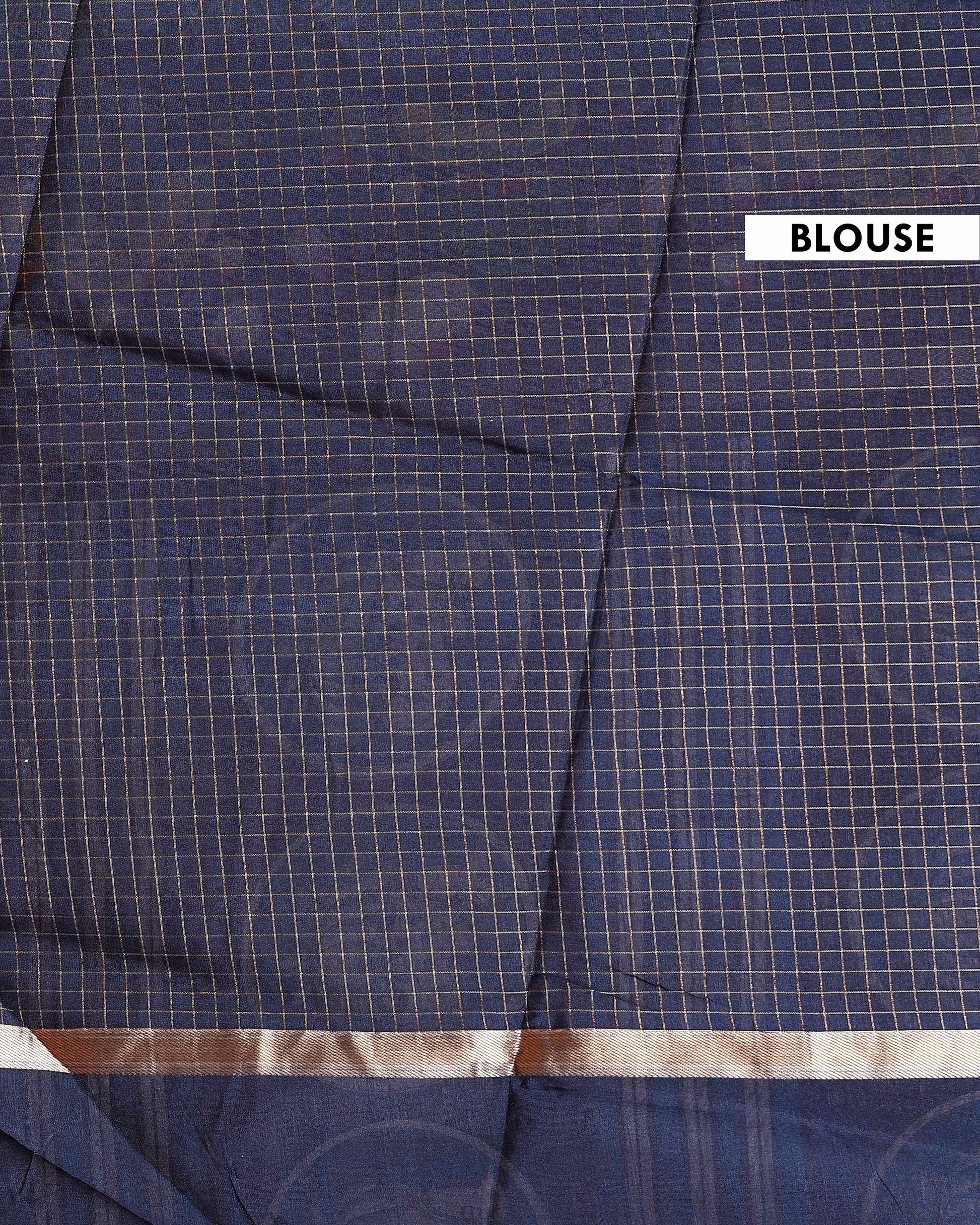 - Elegance of this handwoven Kota cotton saree, featuring a vibrant blue body with a distinctive checkered pattern and a beautifully detailed border