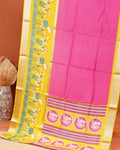 - Elegance of this Kota cotton saree, featuring a vibrant pink body and a striking yellow pallu adorned with traditional motifs