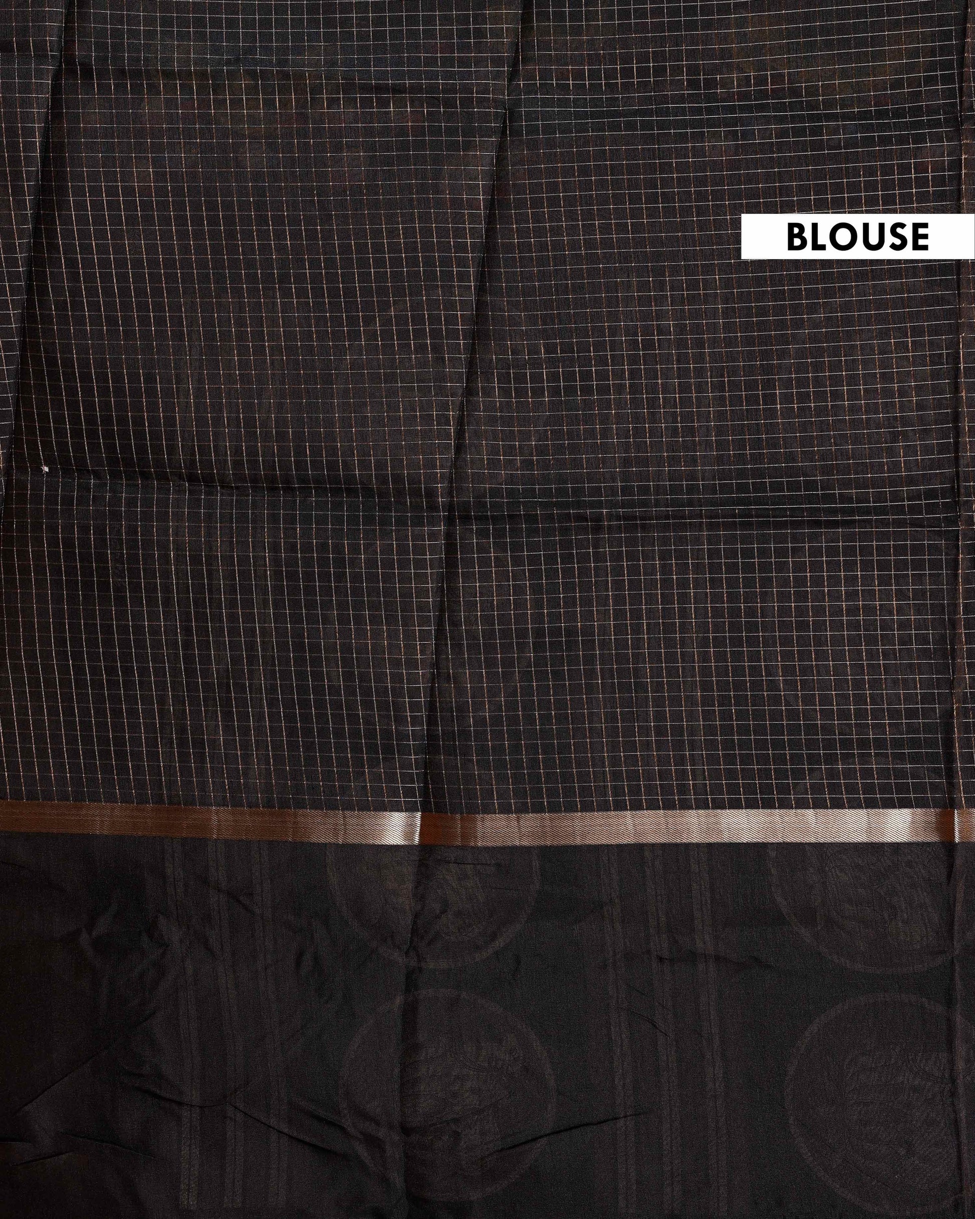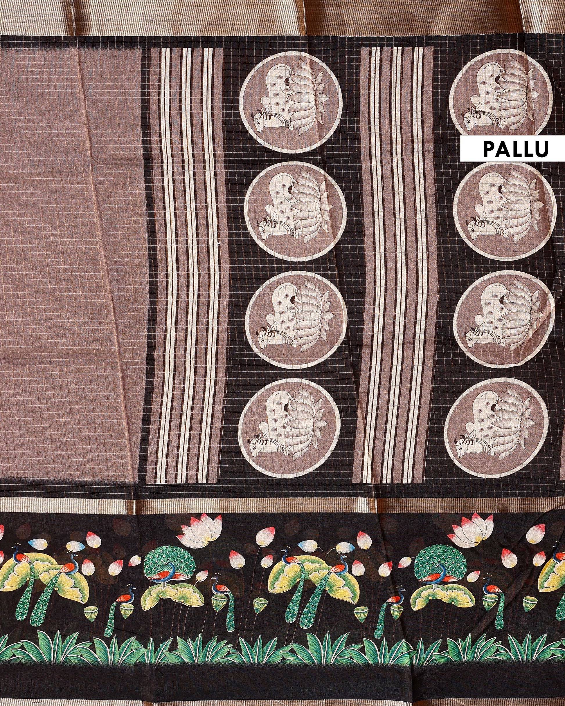 The lightweight fabric a distinctive checkered pattern, complemented by a contrast border with intricate floral motifs and a pallu with unique animal designs.