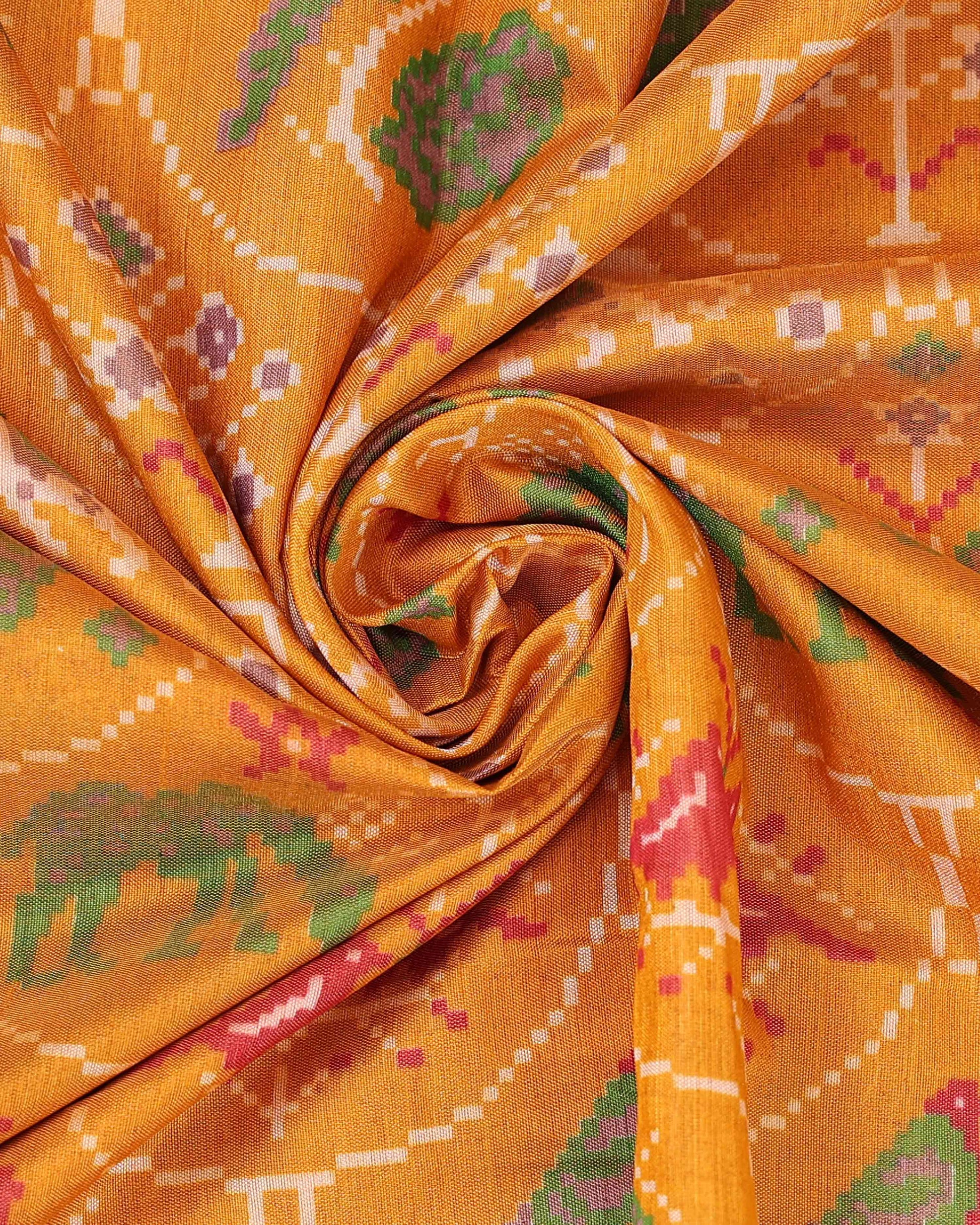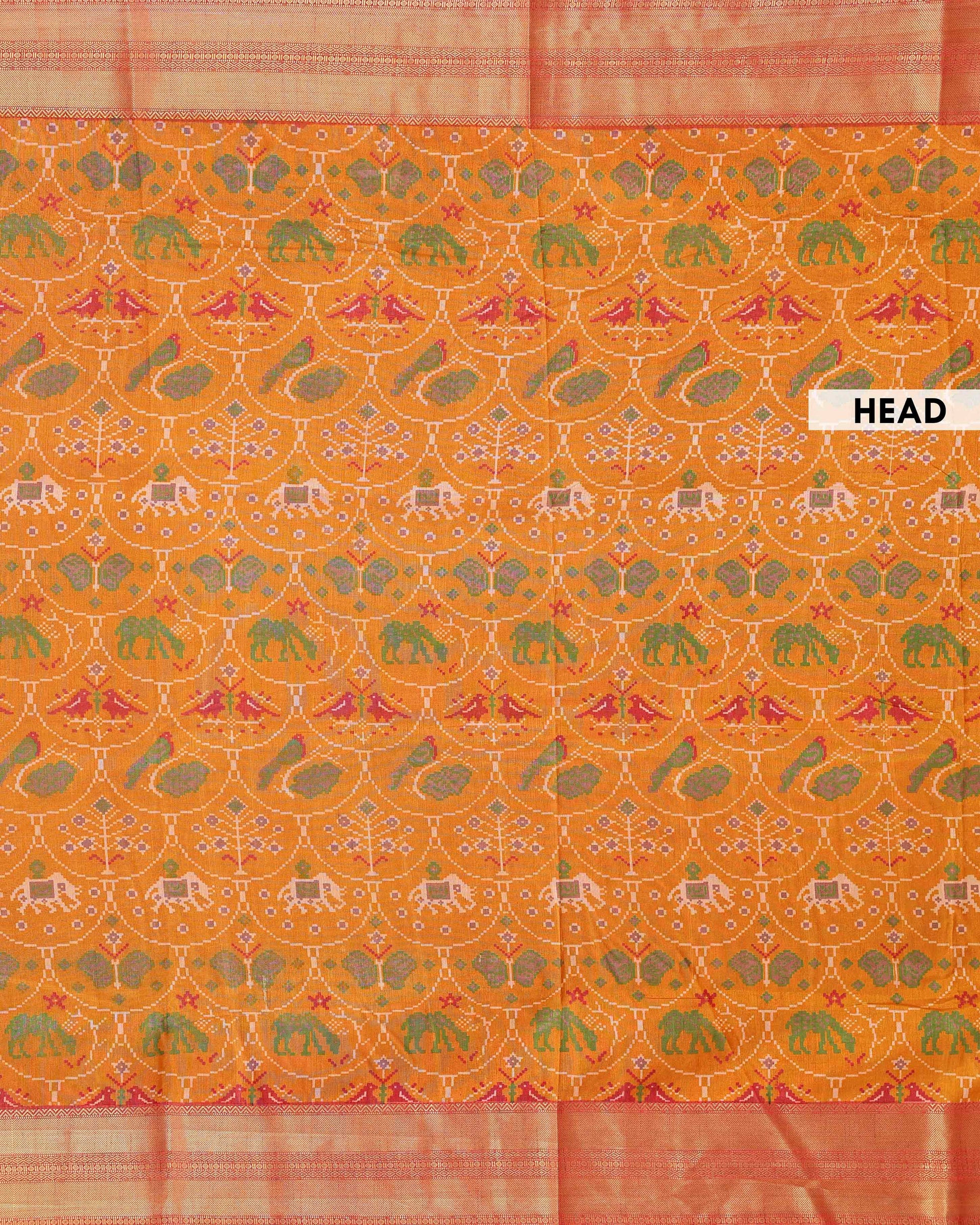 - This stunning Patola silk saree features a vibrant orange body with traditional ikat patterns of elephants and parrots, a perfect blend of heritage and style.