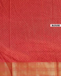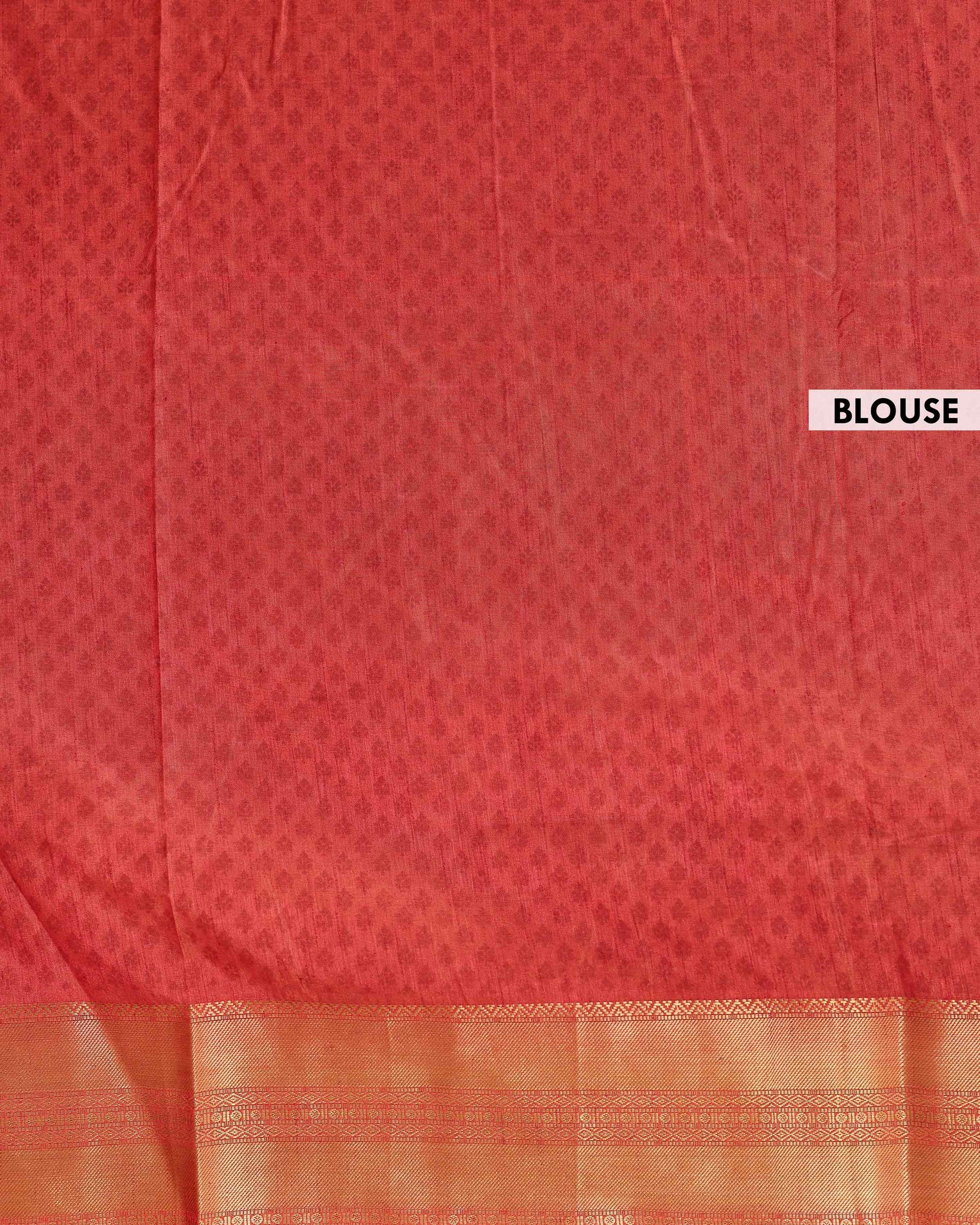 The saree is complemented by a rich red and gold zari border, making it an ideal choice for festive occasions and weddings.