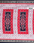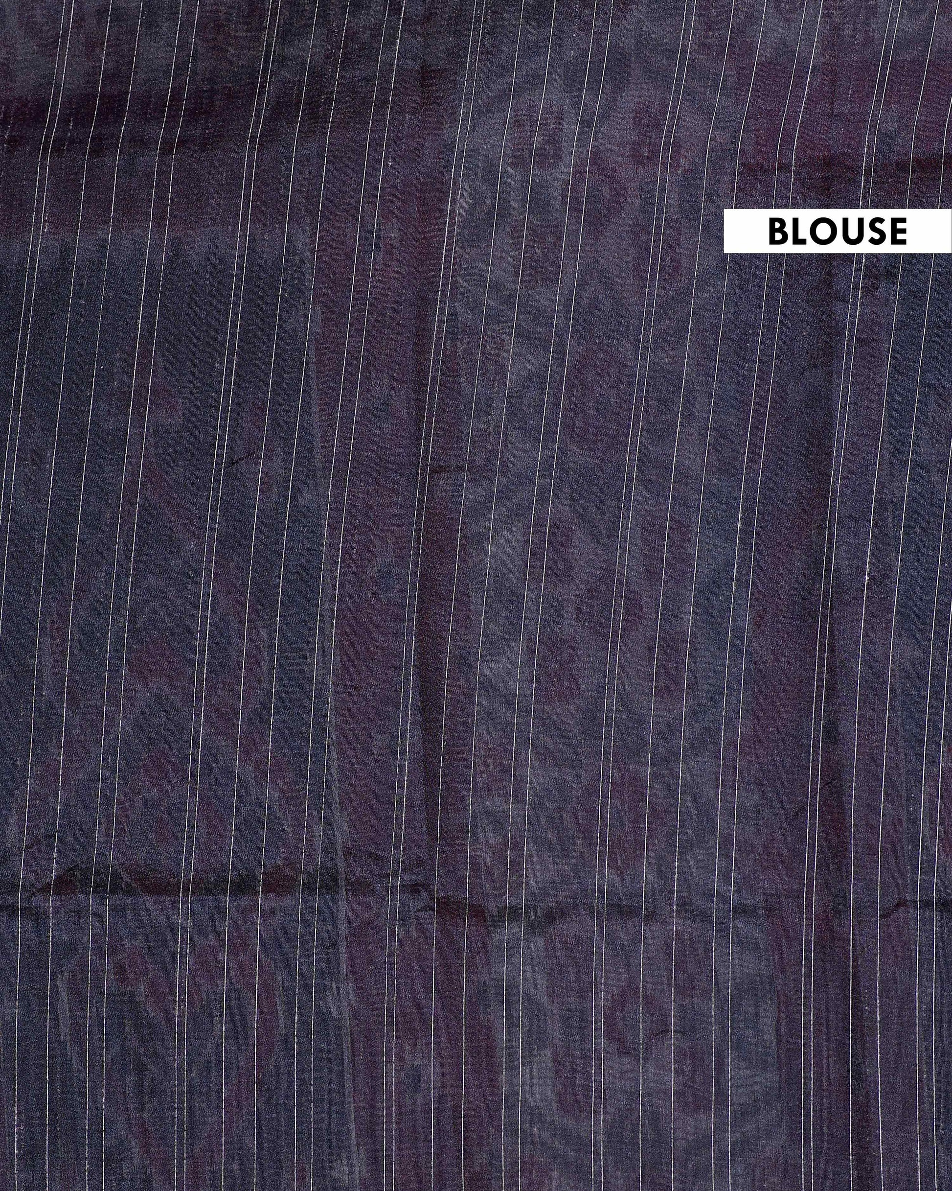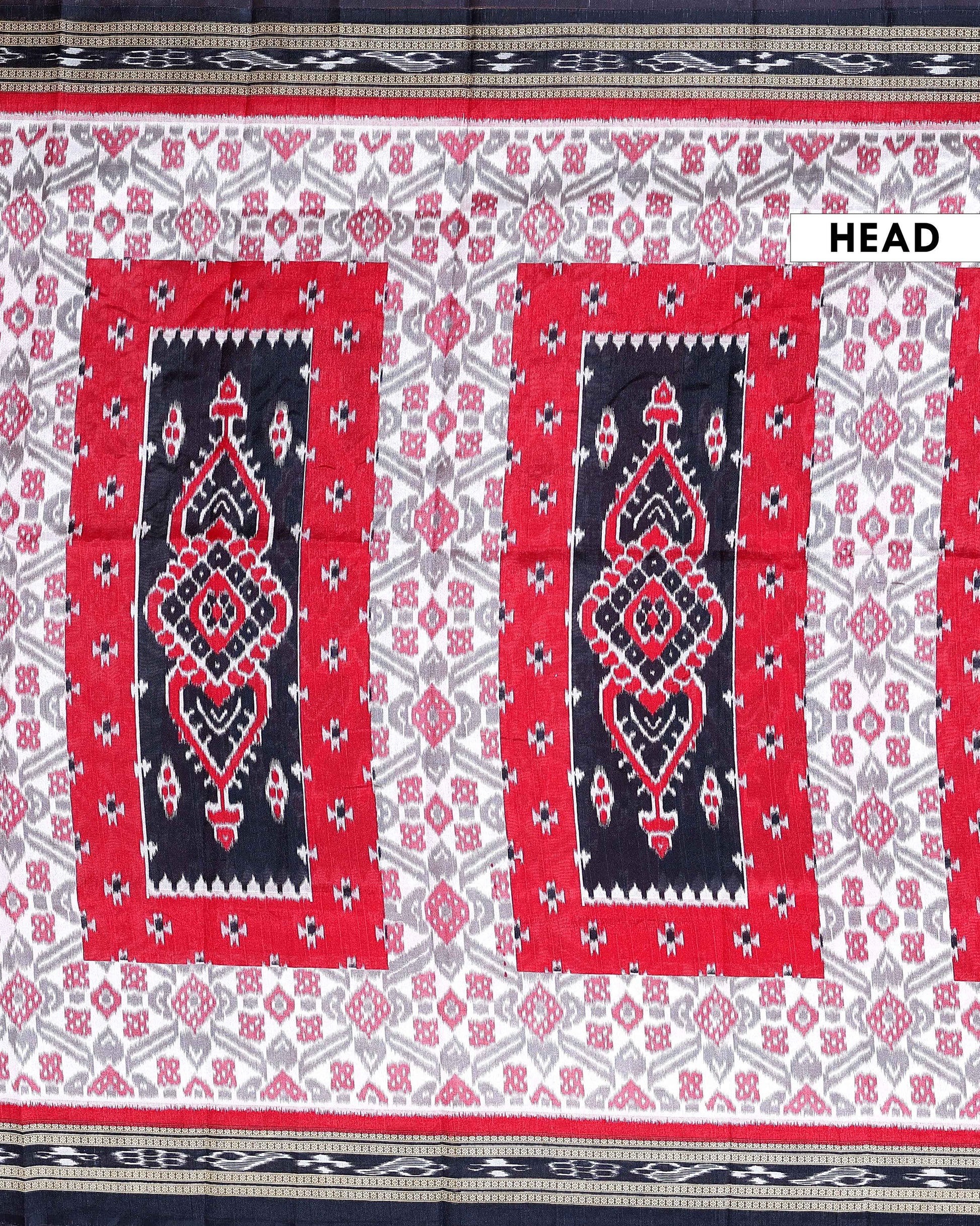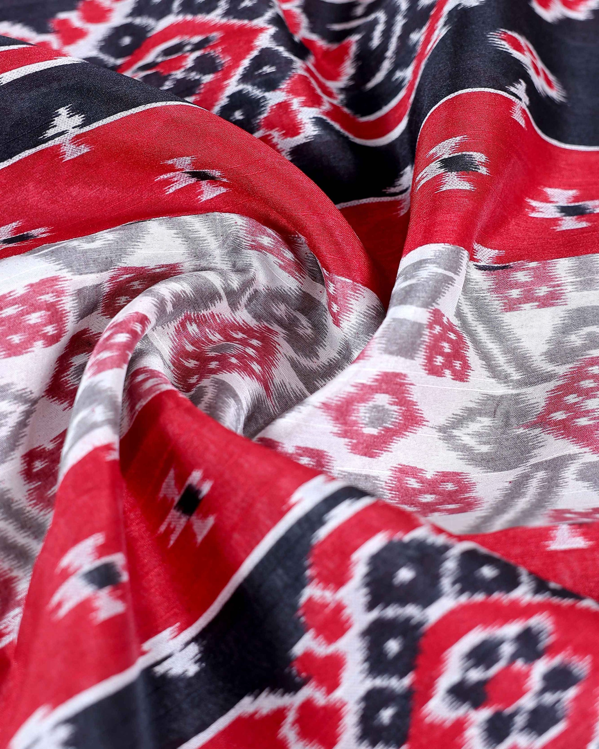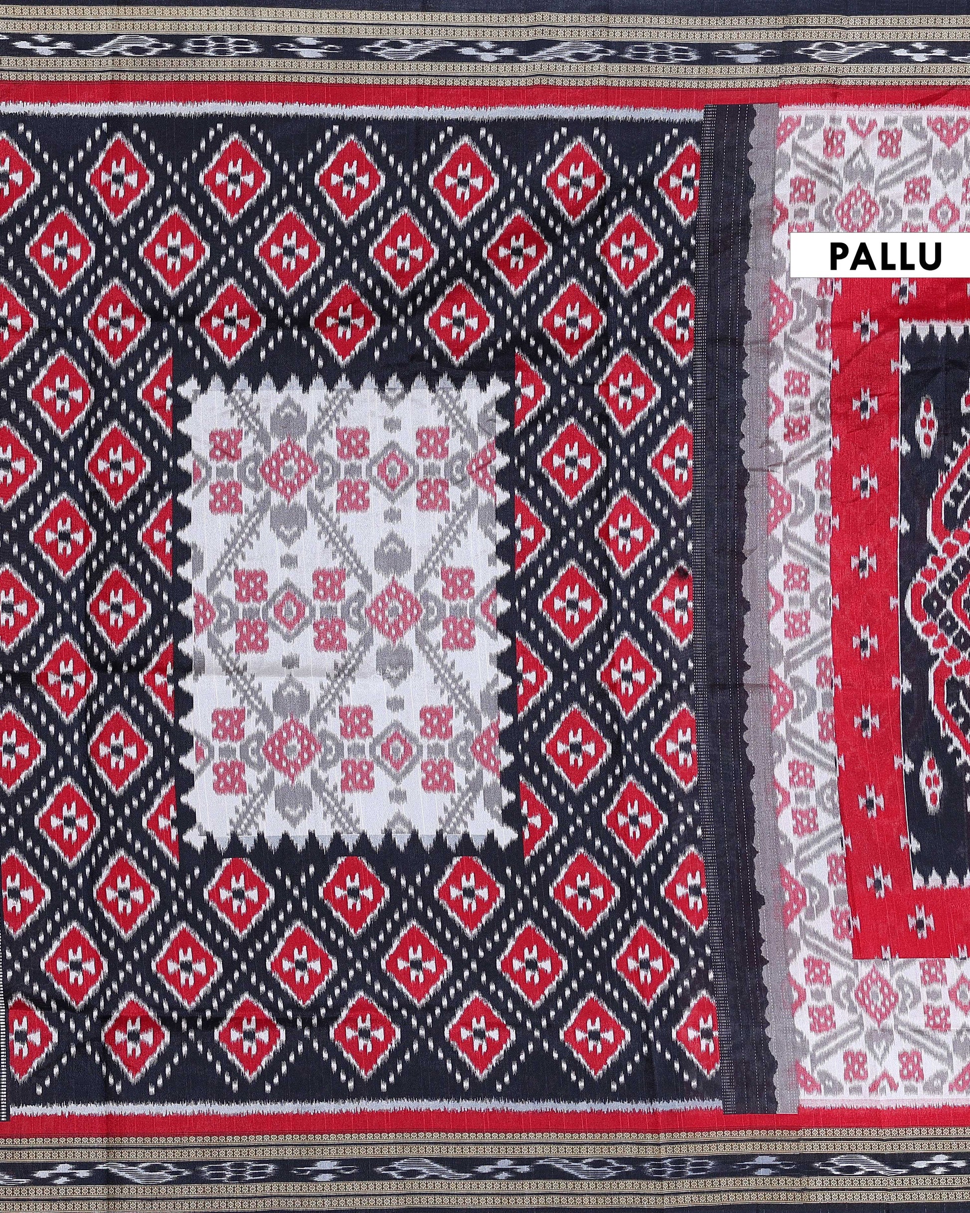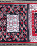- Elegance of this handwoven Pochampally Ikkat silk saree, intricate geometric patterns in a striking black and red color palette