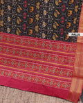 The rich black body is beautifully contrasted by a vibrant red and gold zari border, perfect for festive occasions and celebrations.
