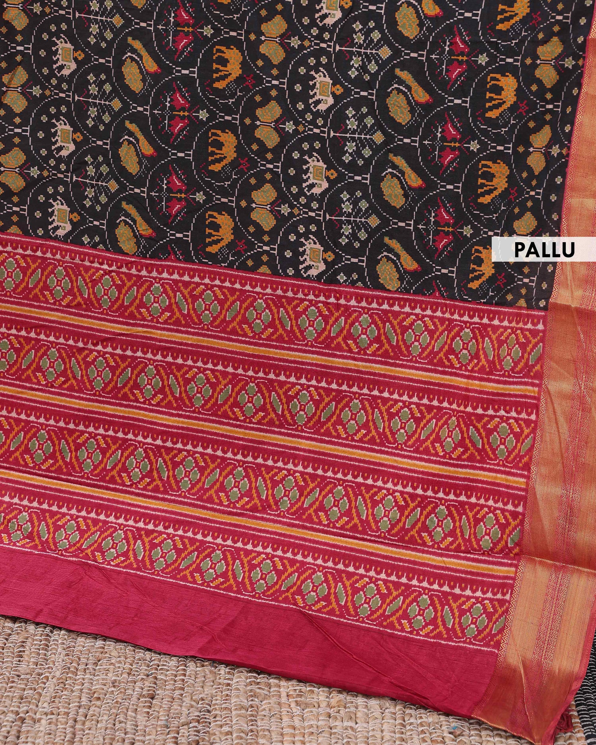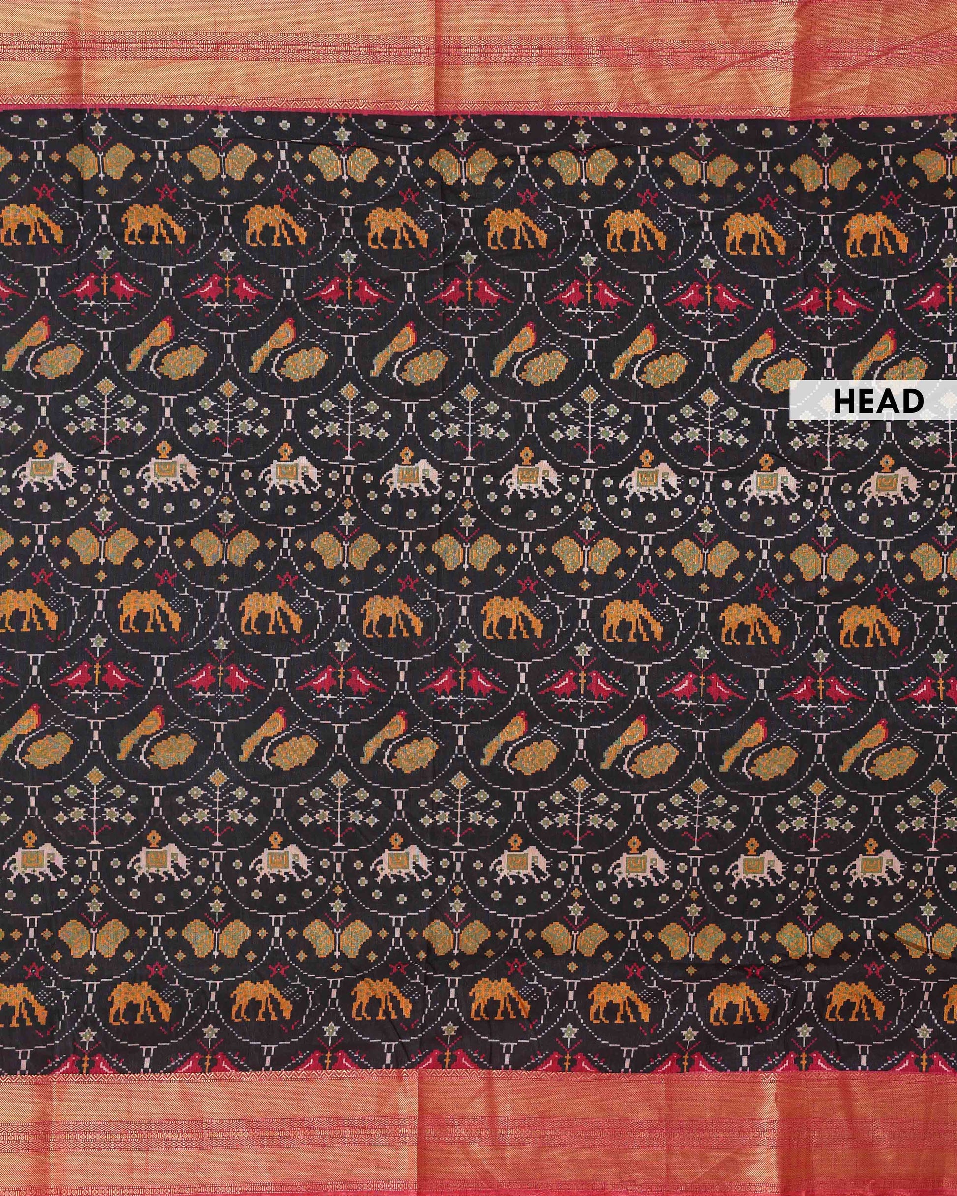 - Elevate your style with this exquisite Patola silk saree, featuring a traditional handloom weave with intricate elephant and geometric motifs