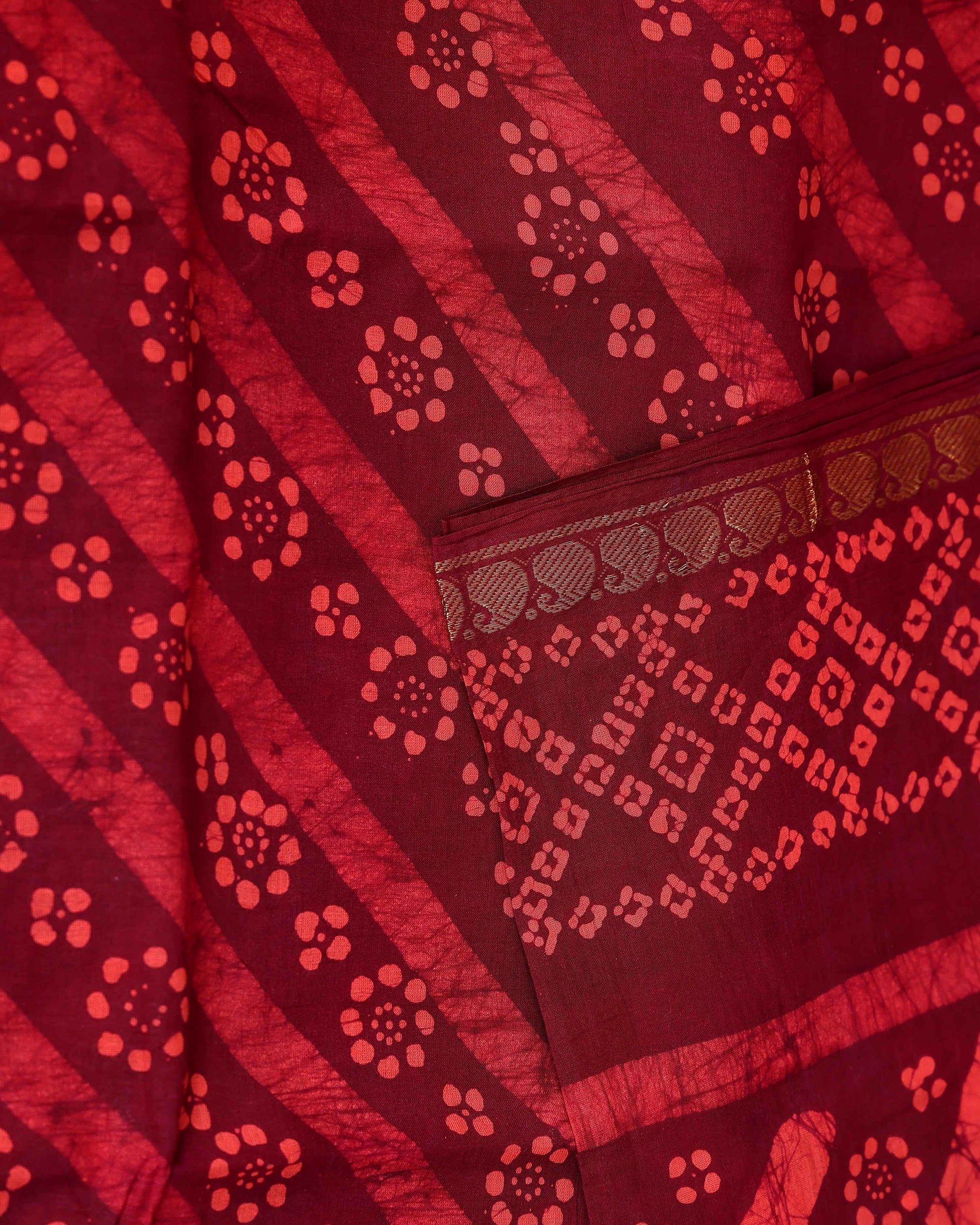 Handloom Sungudi Saree Diagonal Stripes and Wax Print Floral Motifs Without Blouse - Dark Maroon