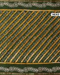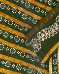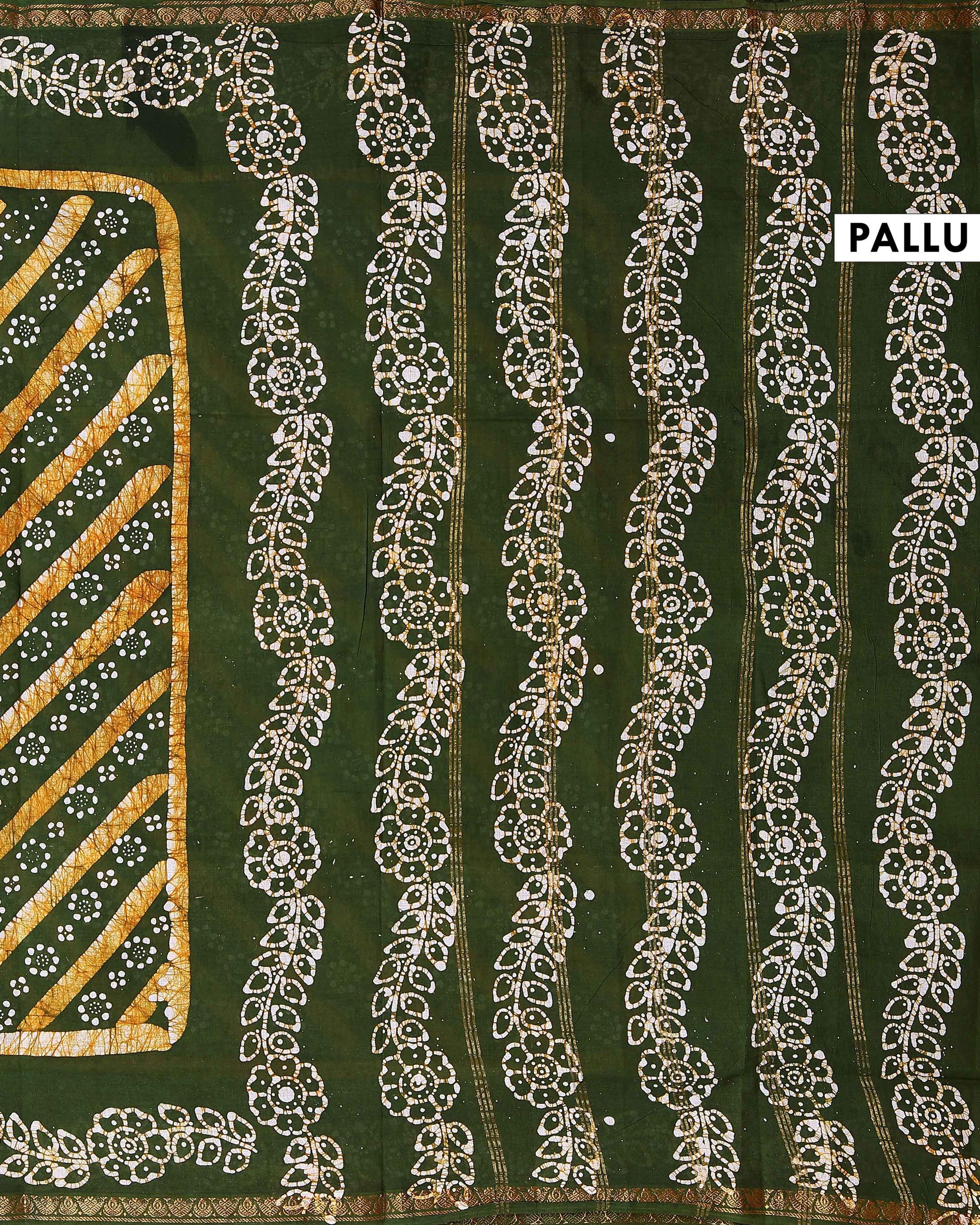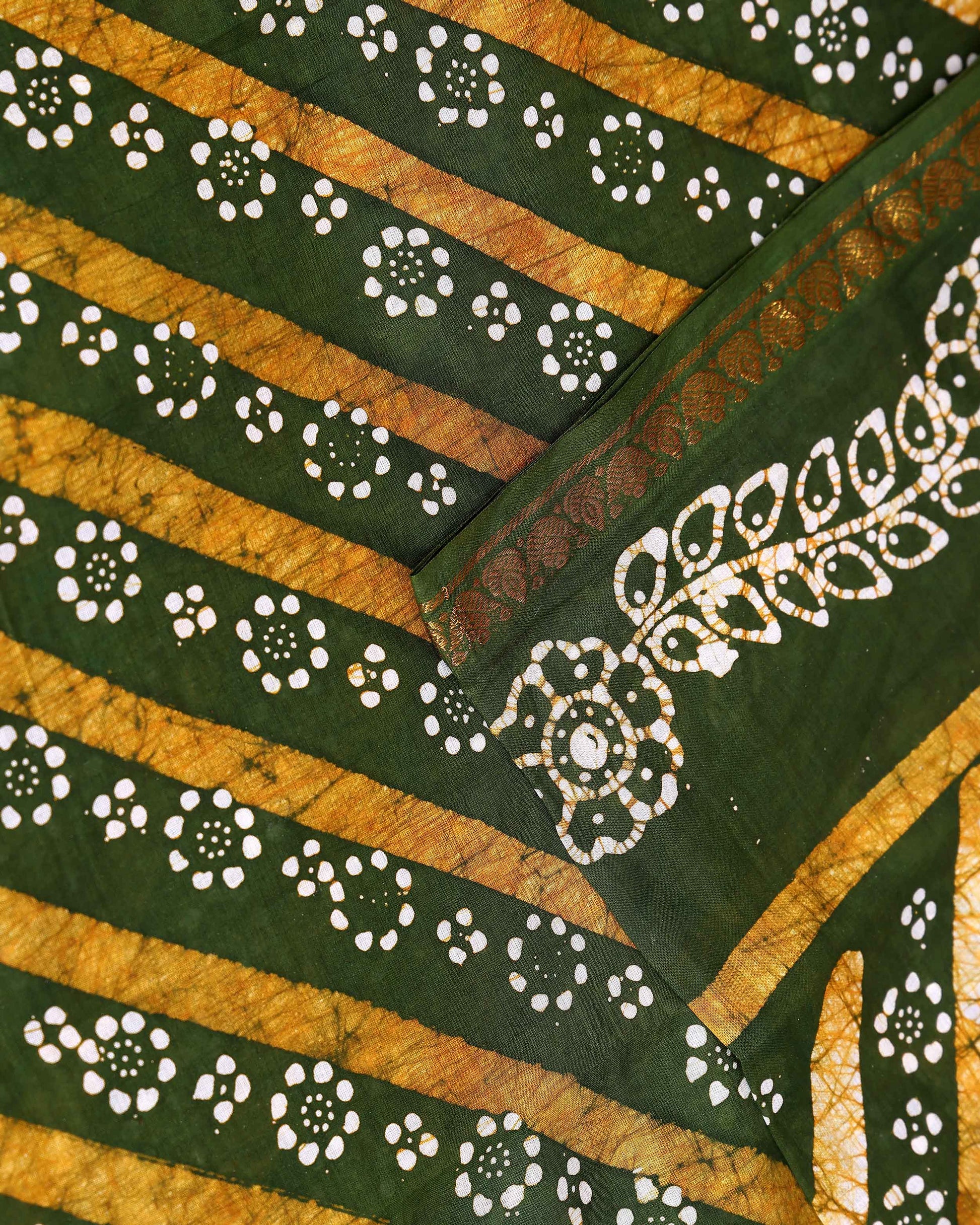 Elevate your style with this exquisite Sungudi cotton saree a vibrant dark green and mustard yellow batik wax print design.