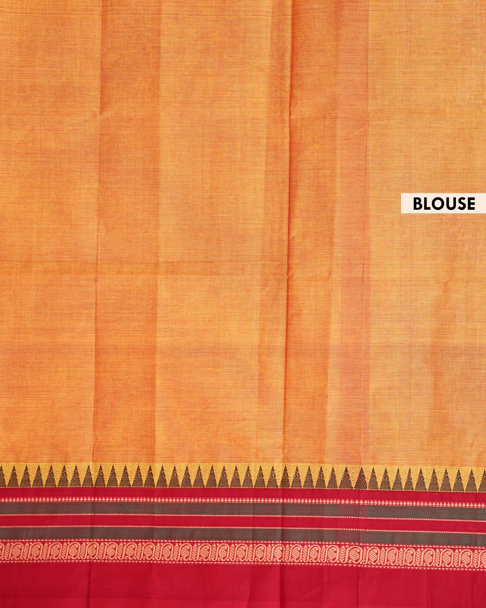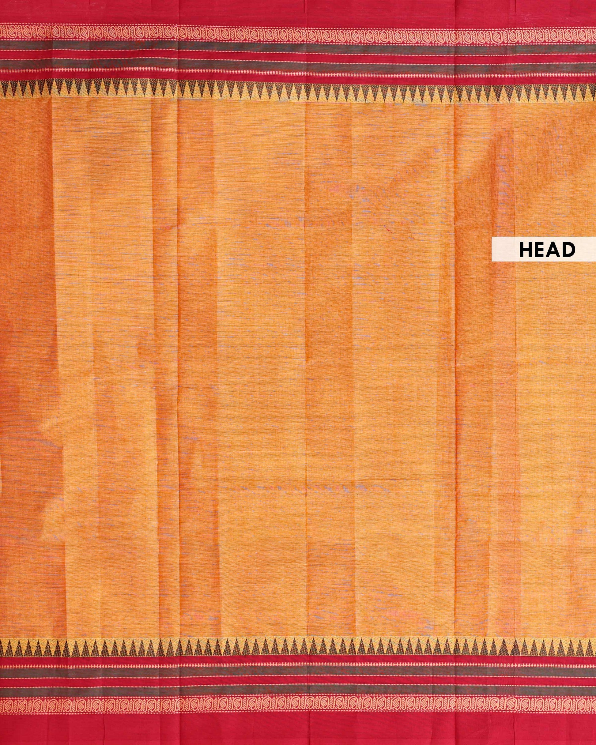 - Experience timeless elegance with this pure cotton saree a vibrant Orange body and a classic red border with traditional temple motifs, perfect for any festive or daily occasion.