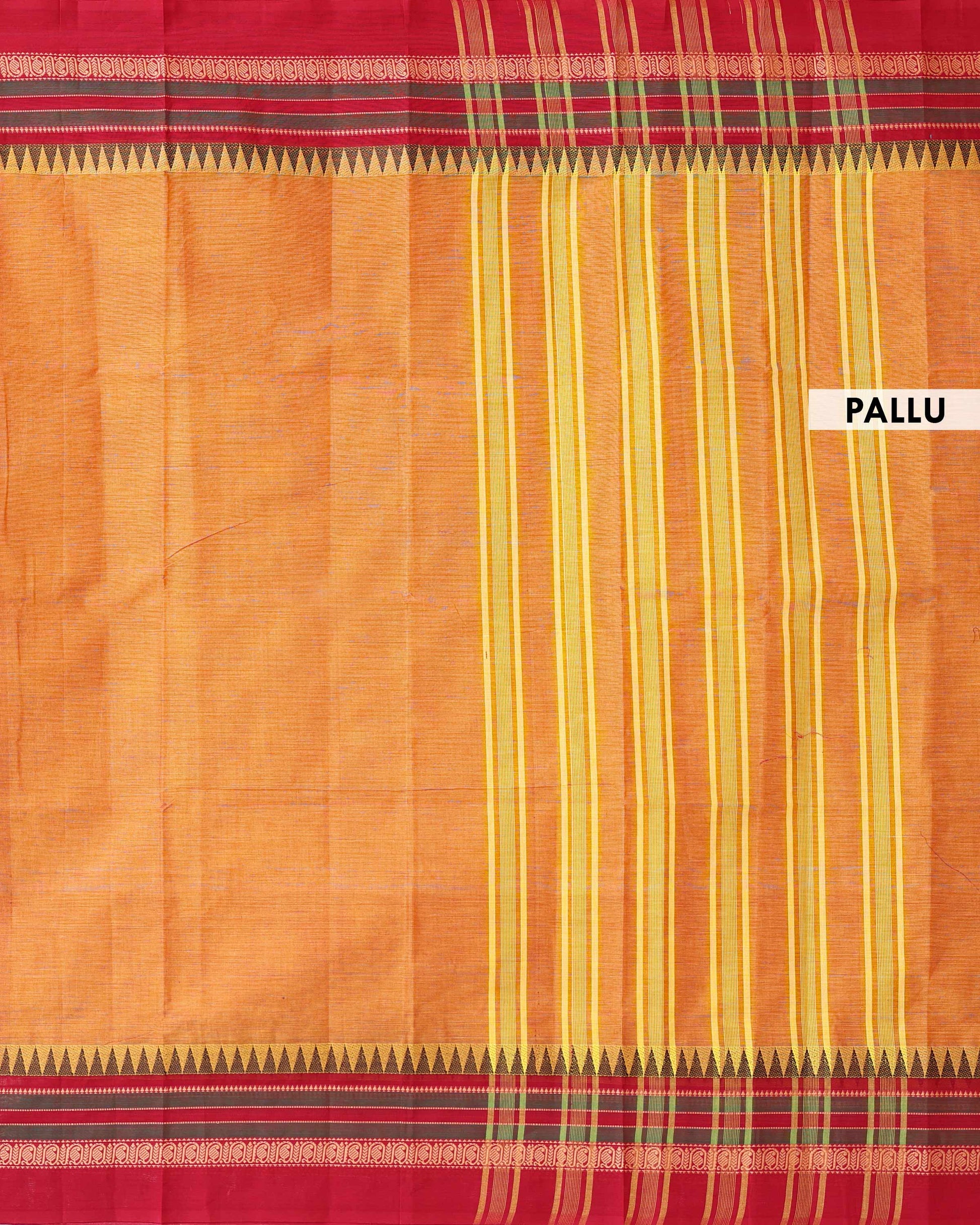 Handloom Venkatagiri Cotton Saree with Striped Body and Traditional Temple Motif Border - Orange