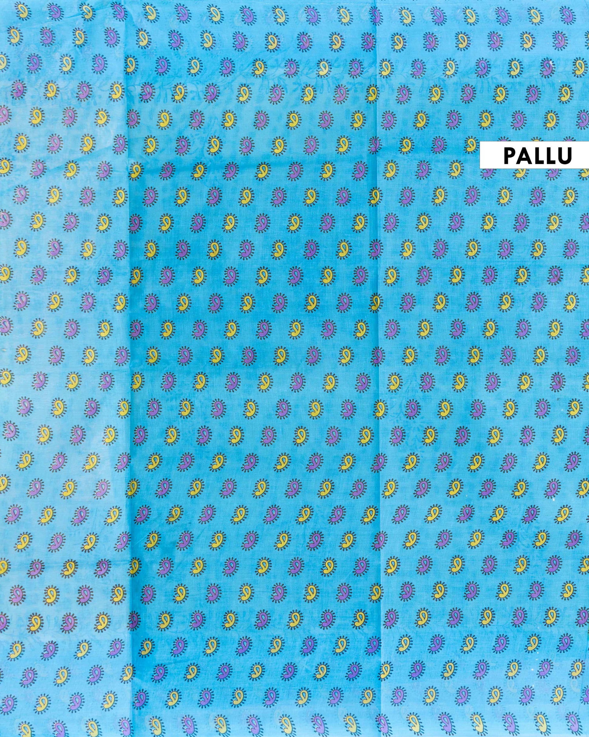 - Elevate your style with this vibrant voile cotton saree a unique lime green tie dye pattern and a contrasting blue border adorned with colorful paisley motifs.